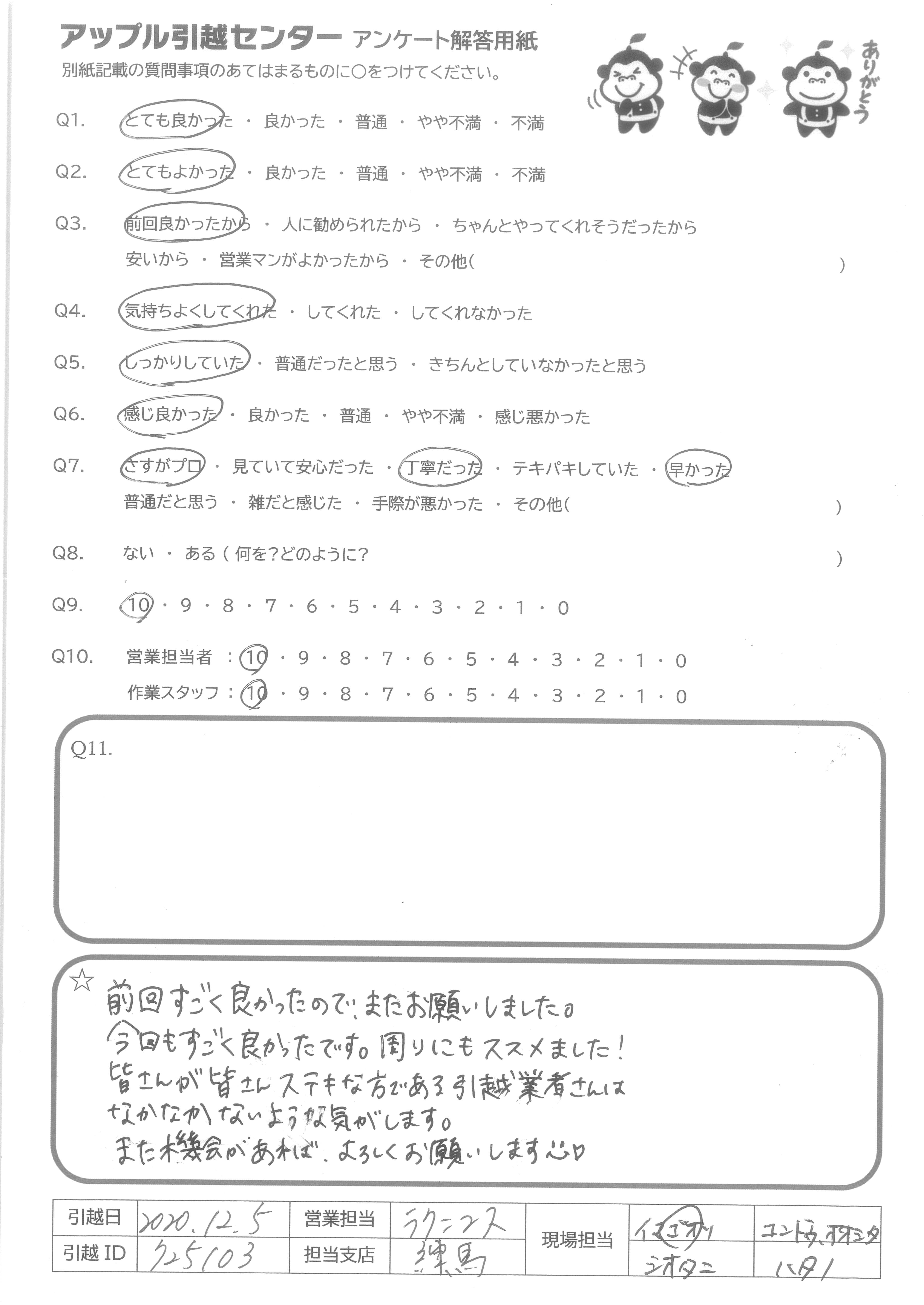 A.前回すごく良かったので、またお願いしました。 今回もすごく良かったです。周りにもススメました! 皆さんが皆さんステキな方である引越業者さんはなかなかないような気がします。 また機会があればよろしくお願いします