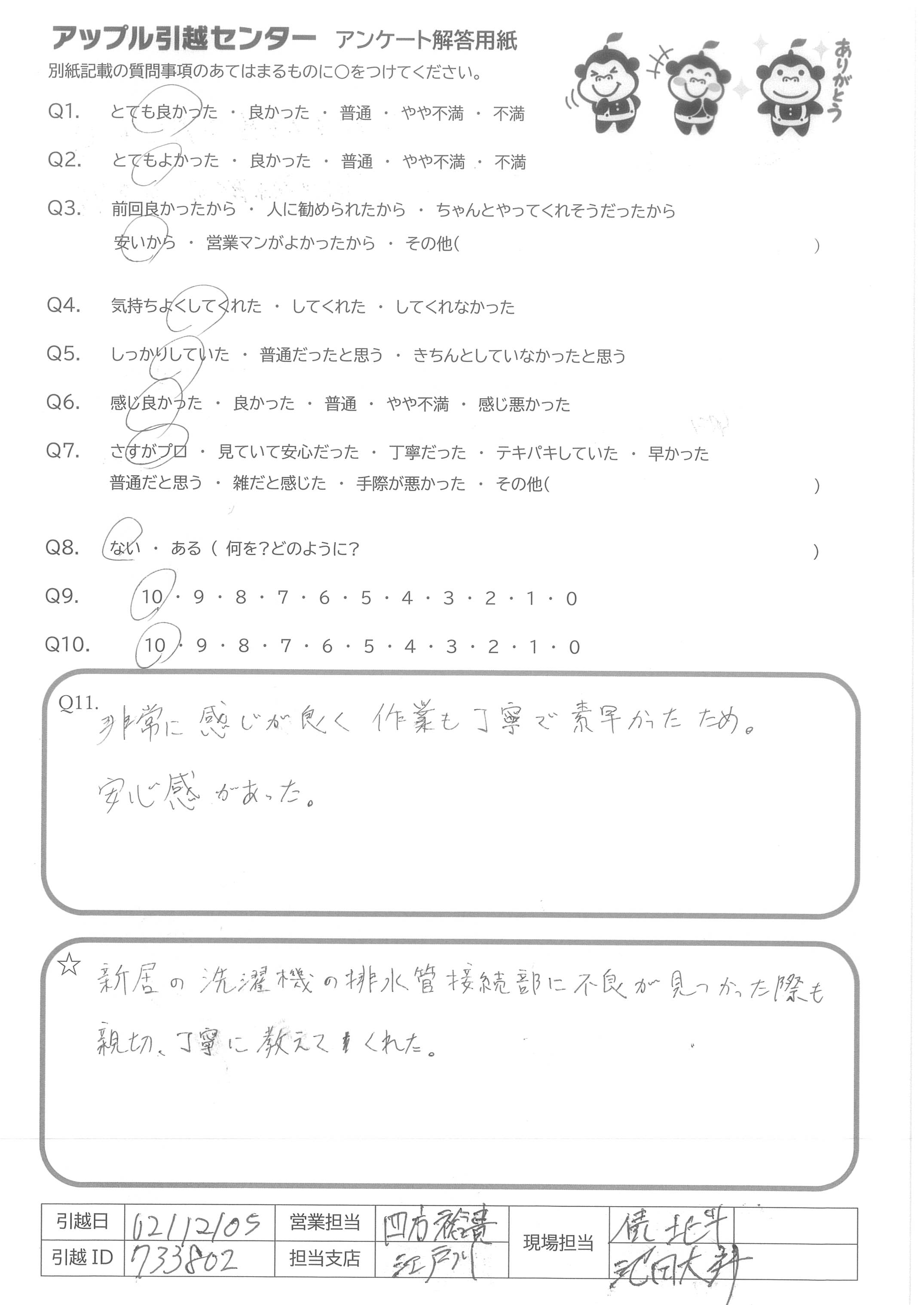 A.とても素早く、丁寧で感じもとってもよかったです。 きもちの良い引っ越しができました。 ありがとうございました。