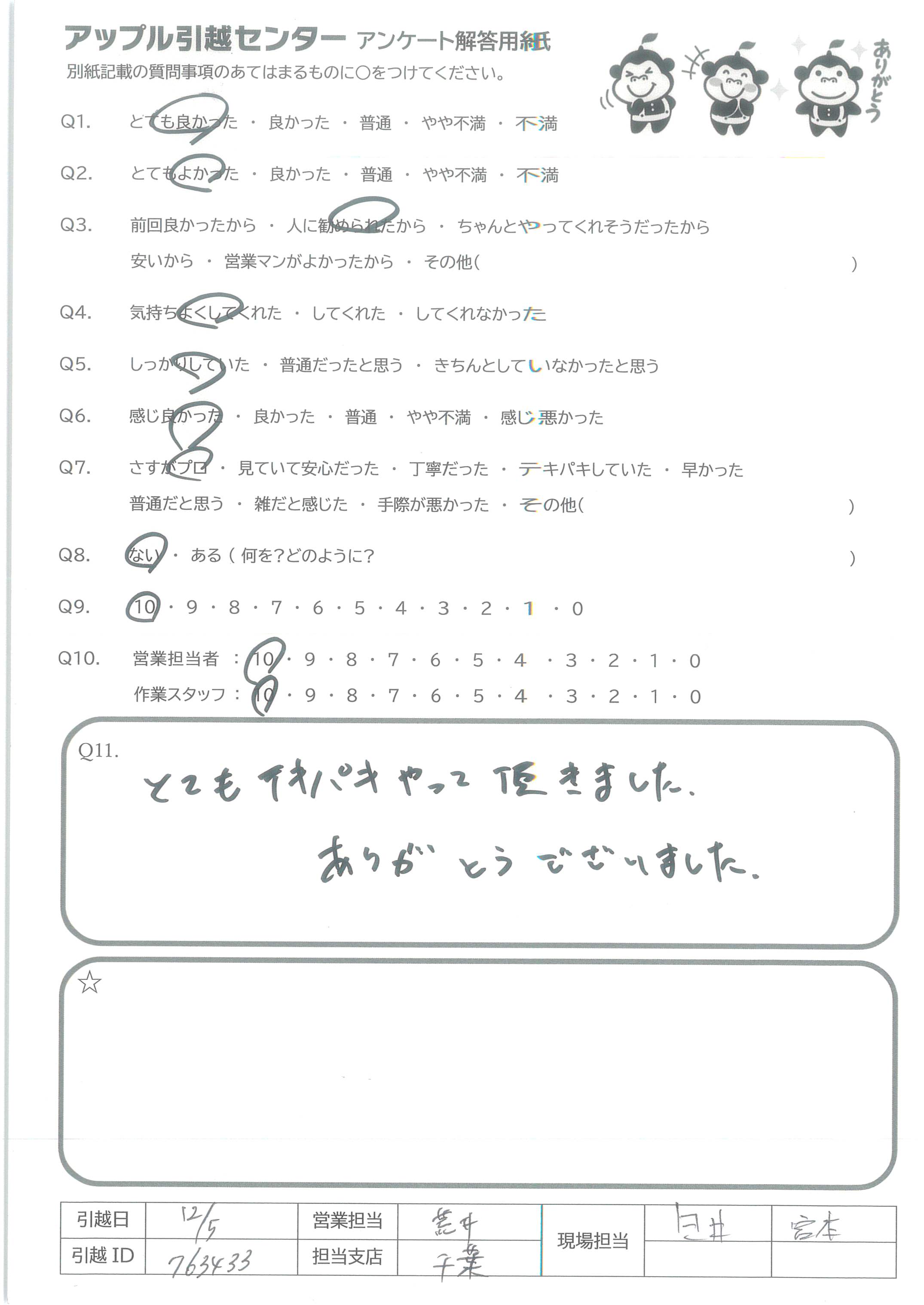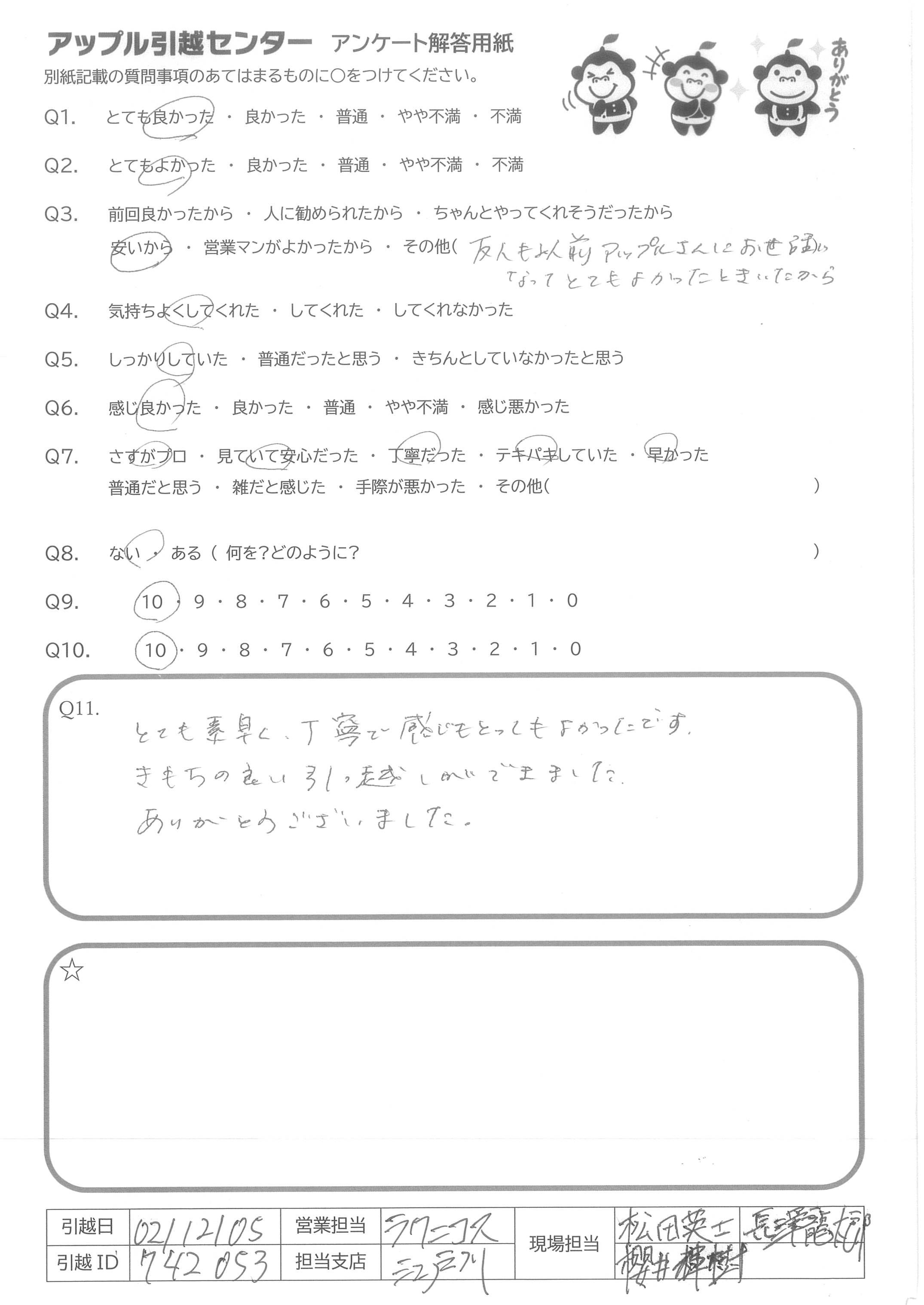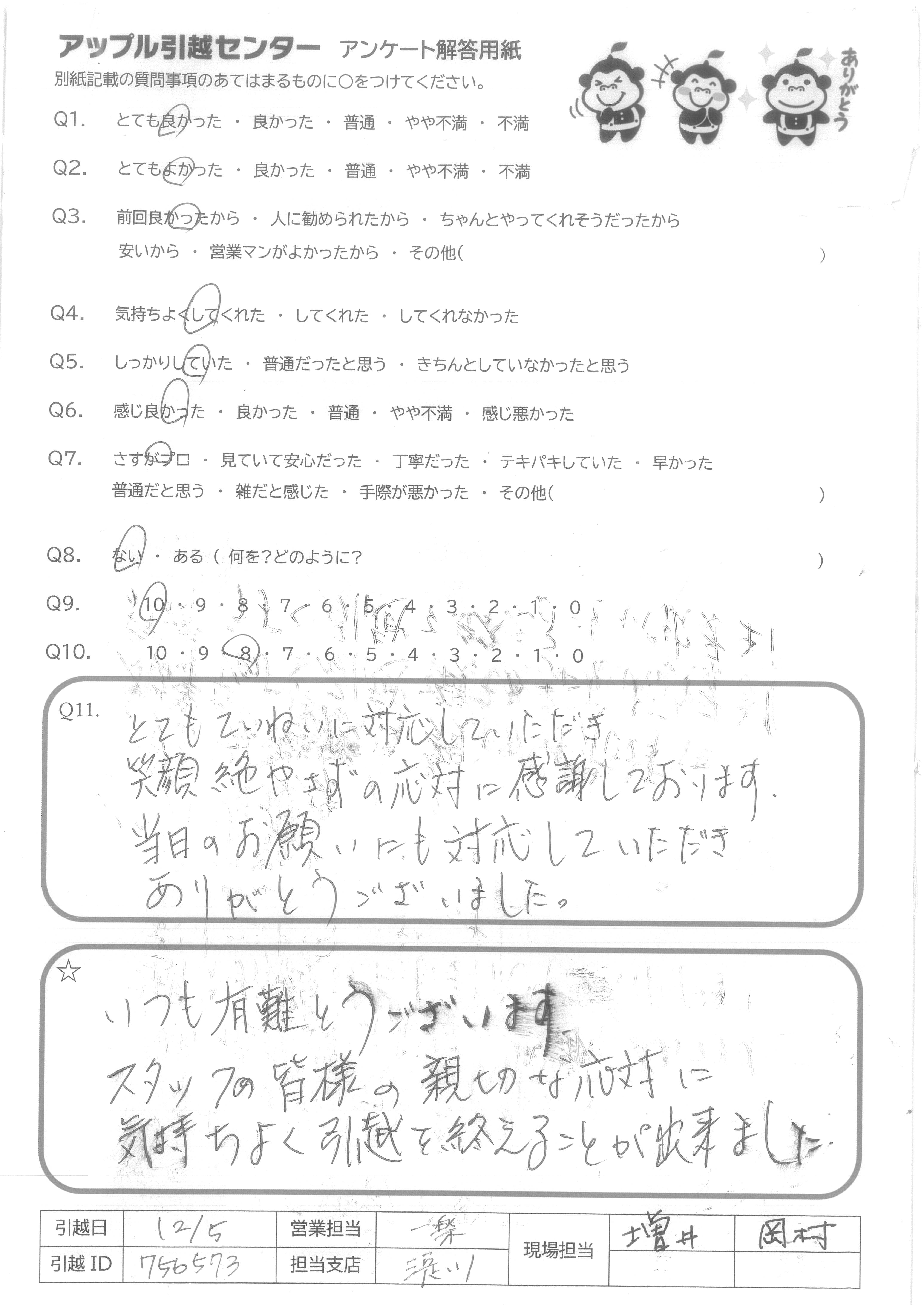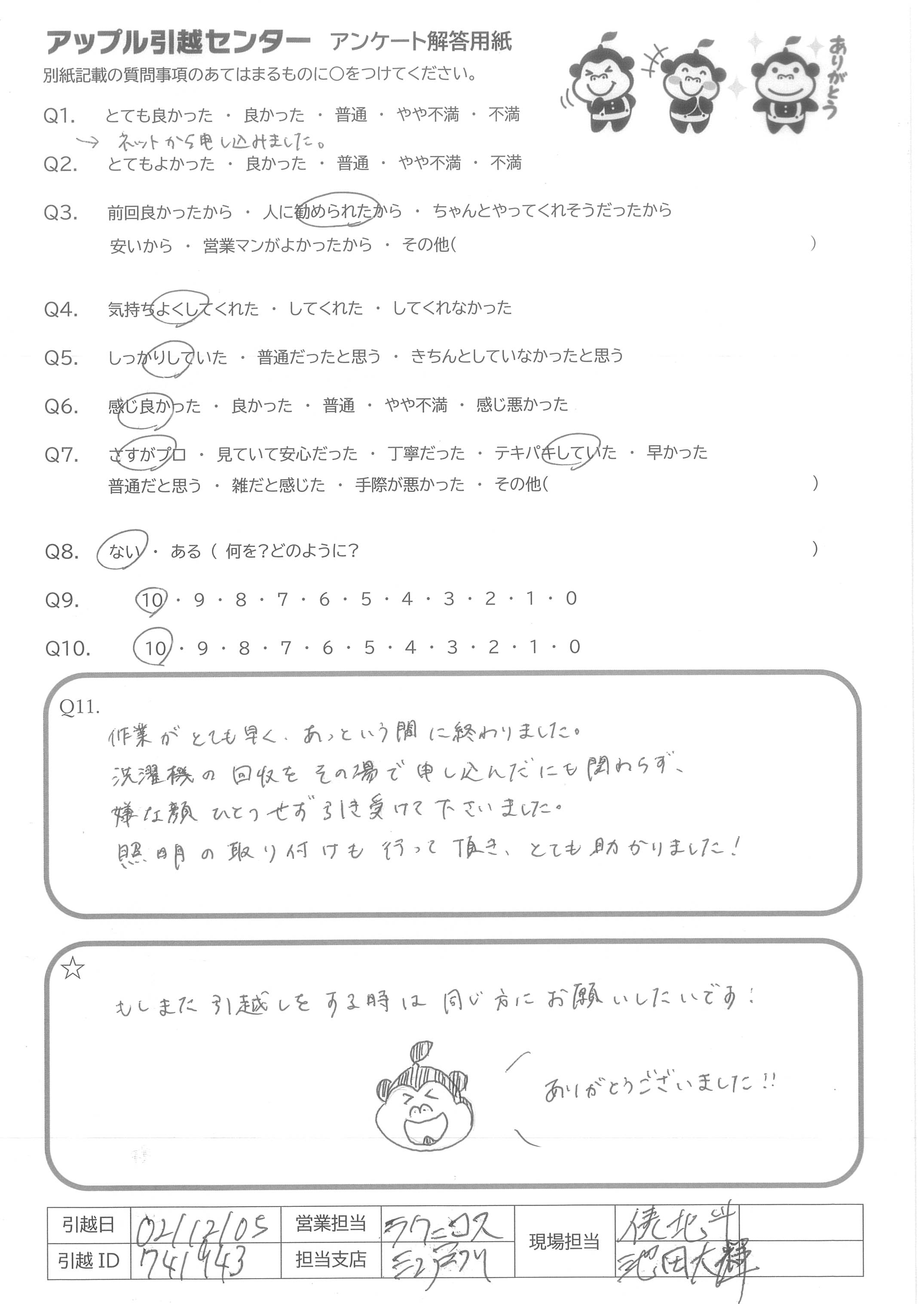 A.大変親身に、丁寧に、気持ちよく引越しをして下さいました。 ありがとうございます!!