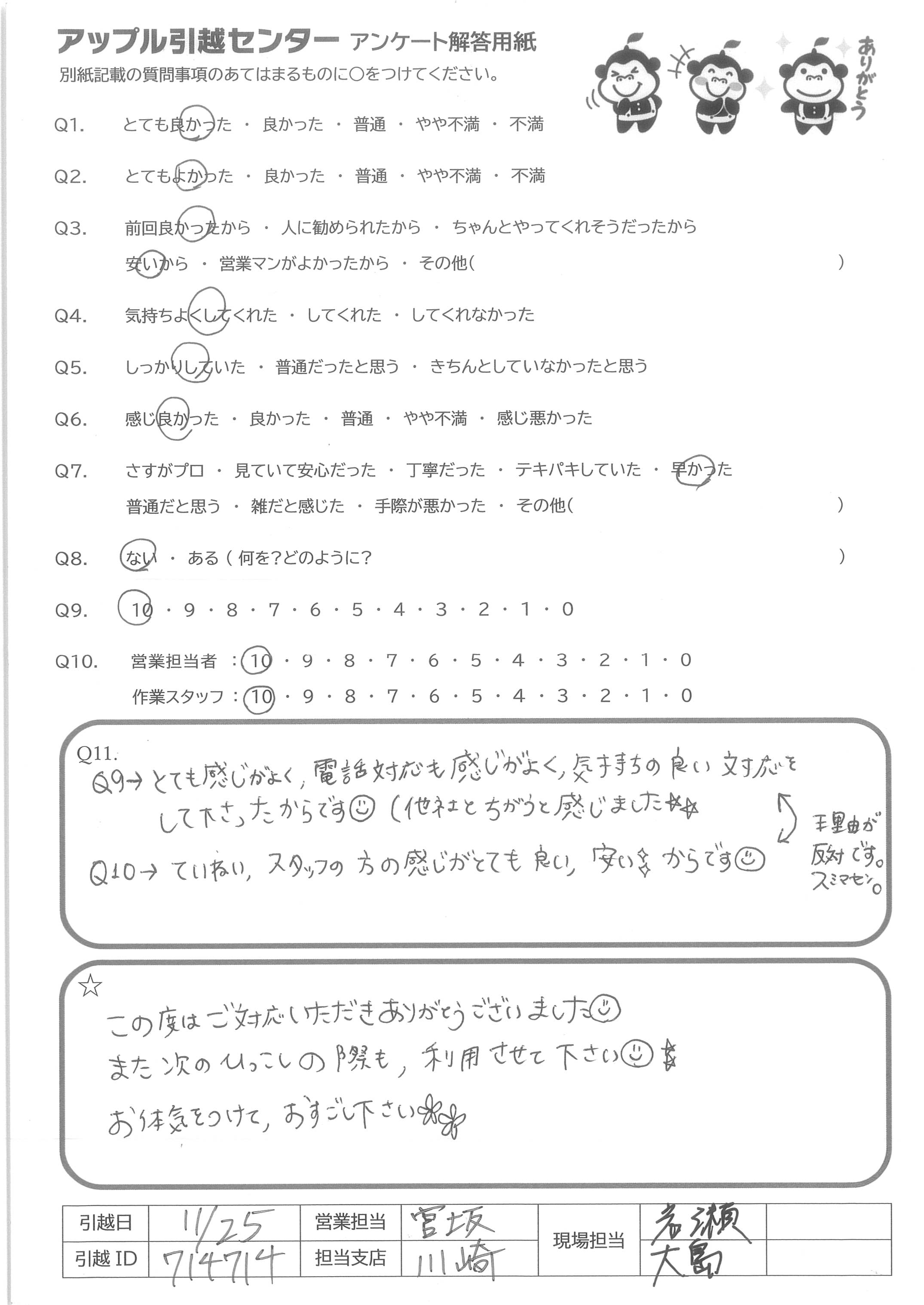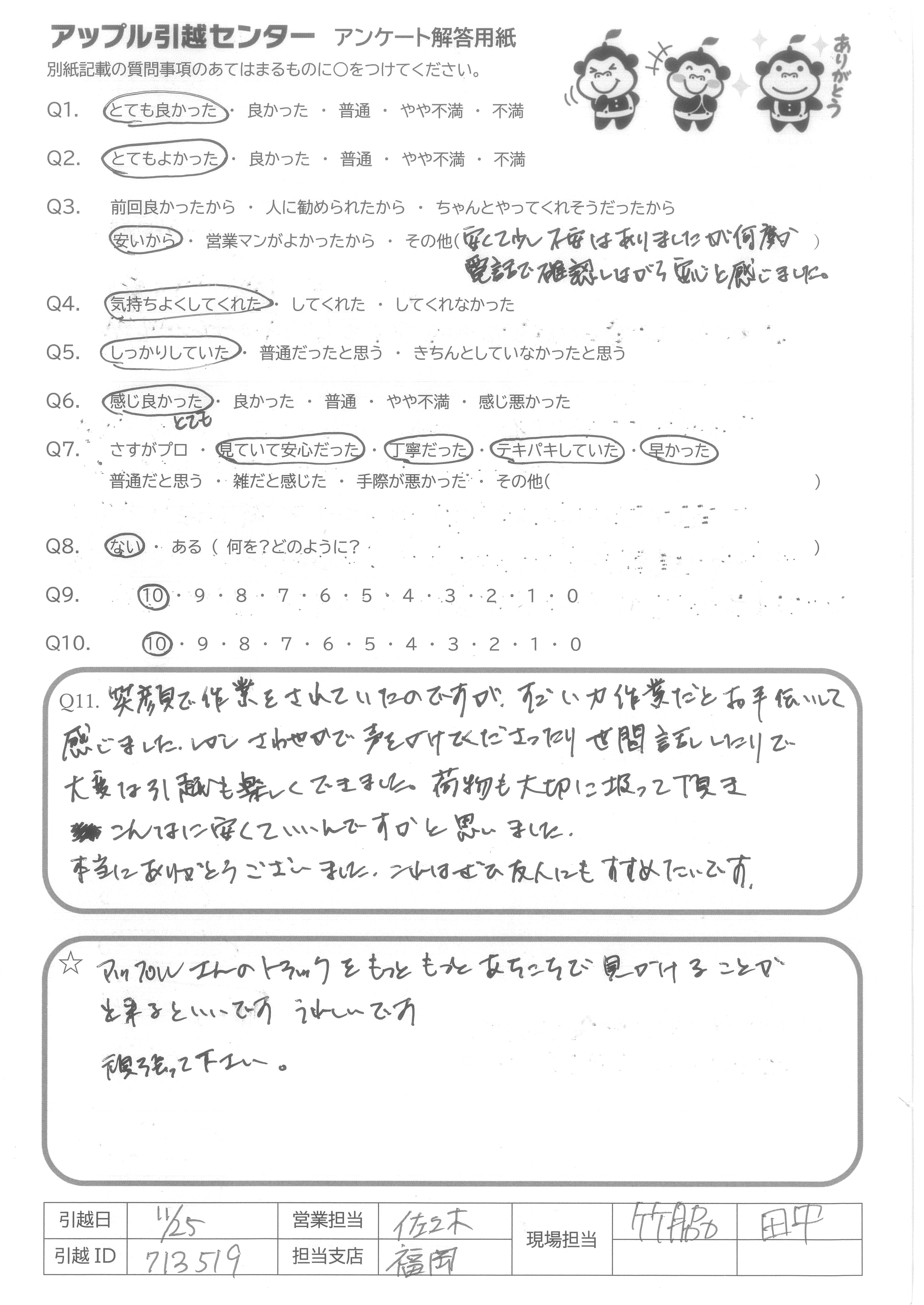 A.いつもごていねいな対応がありがとうございます。 みなさん感じが良くてアップル引っこしセンター様々です。大好きです。 また引っこしの際はよろしくおねがいします。 今回はありがとうございました。