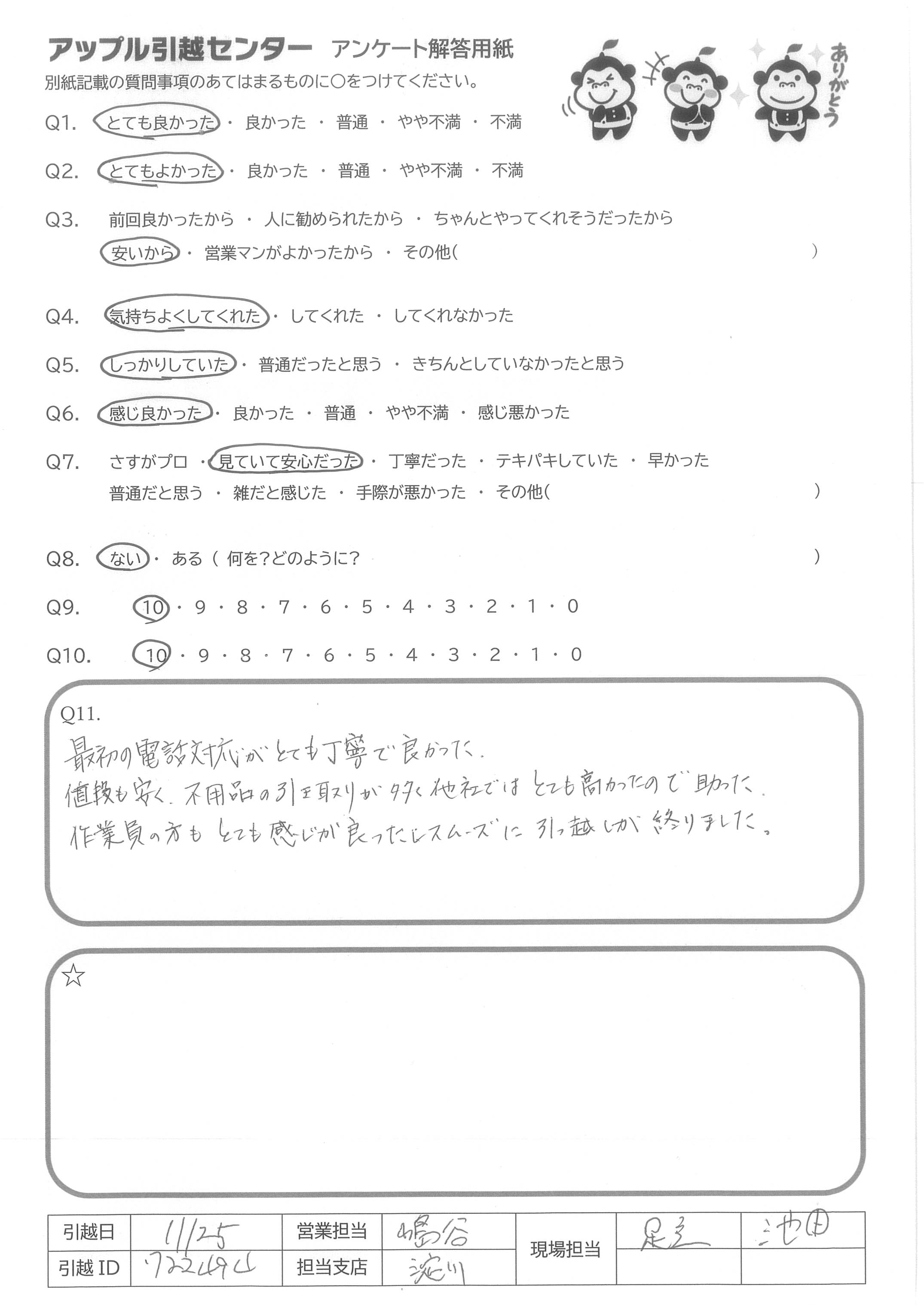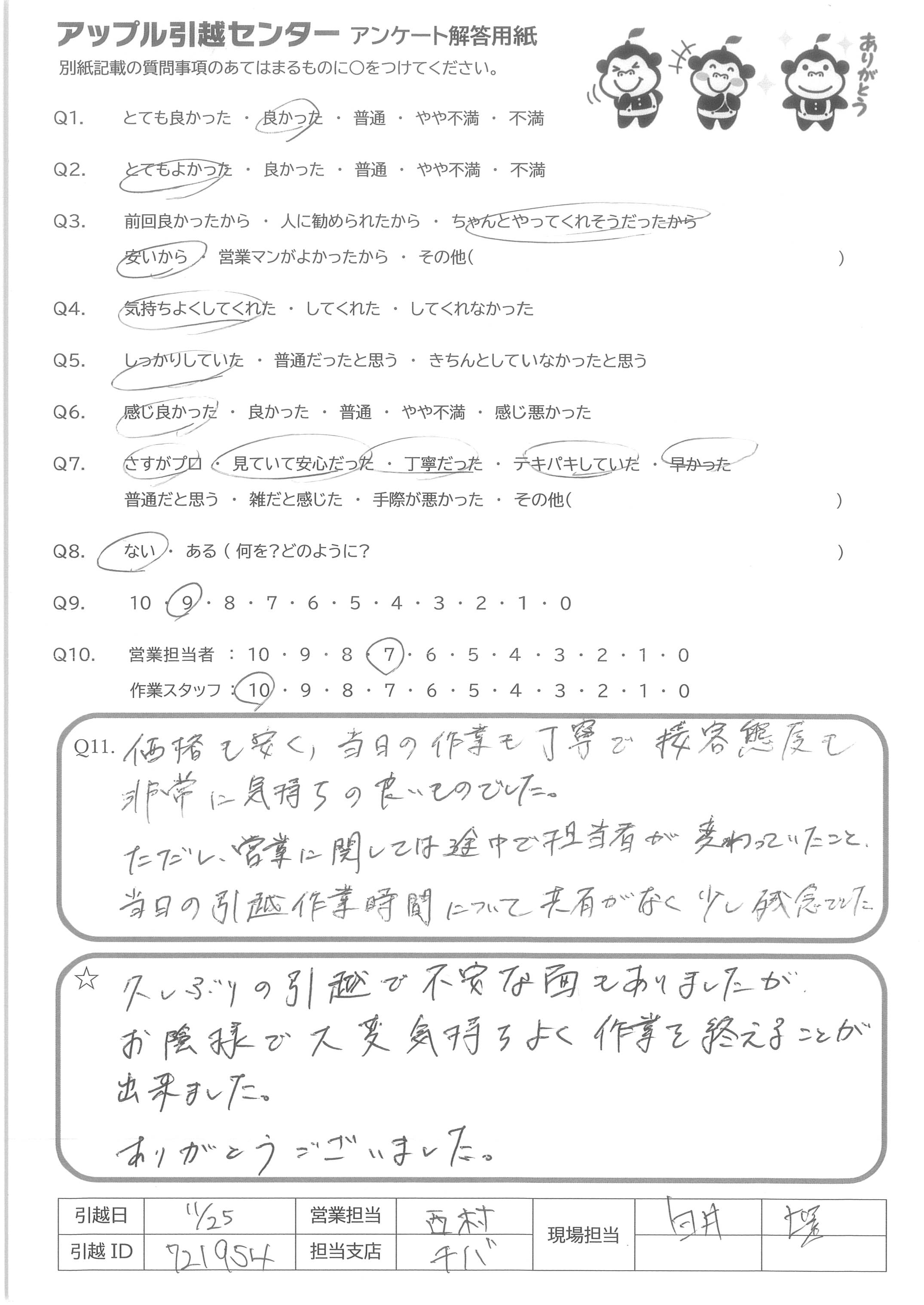 A.西村さんをはじめ、皆さんがとても礼儀正しく、(重い荷物もたくさんありましたが・・・)テキパキとしてお仕事をして頂き、感謝しています。 これまで何度も引越をしましたが、今回の引越が一番でした。次回も是非お願いしたいと思います。 勿論、家族、友人にも強く勧めます。ありがとうございました。