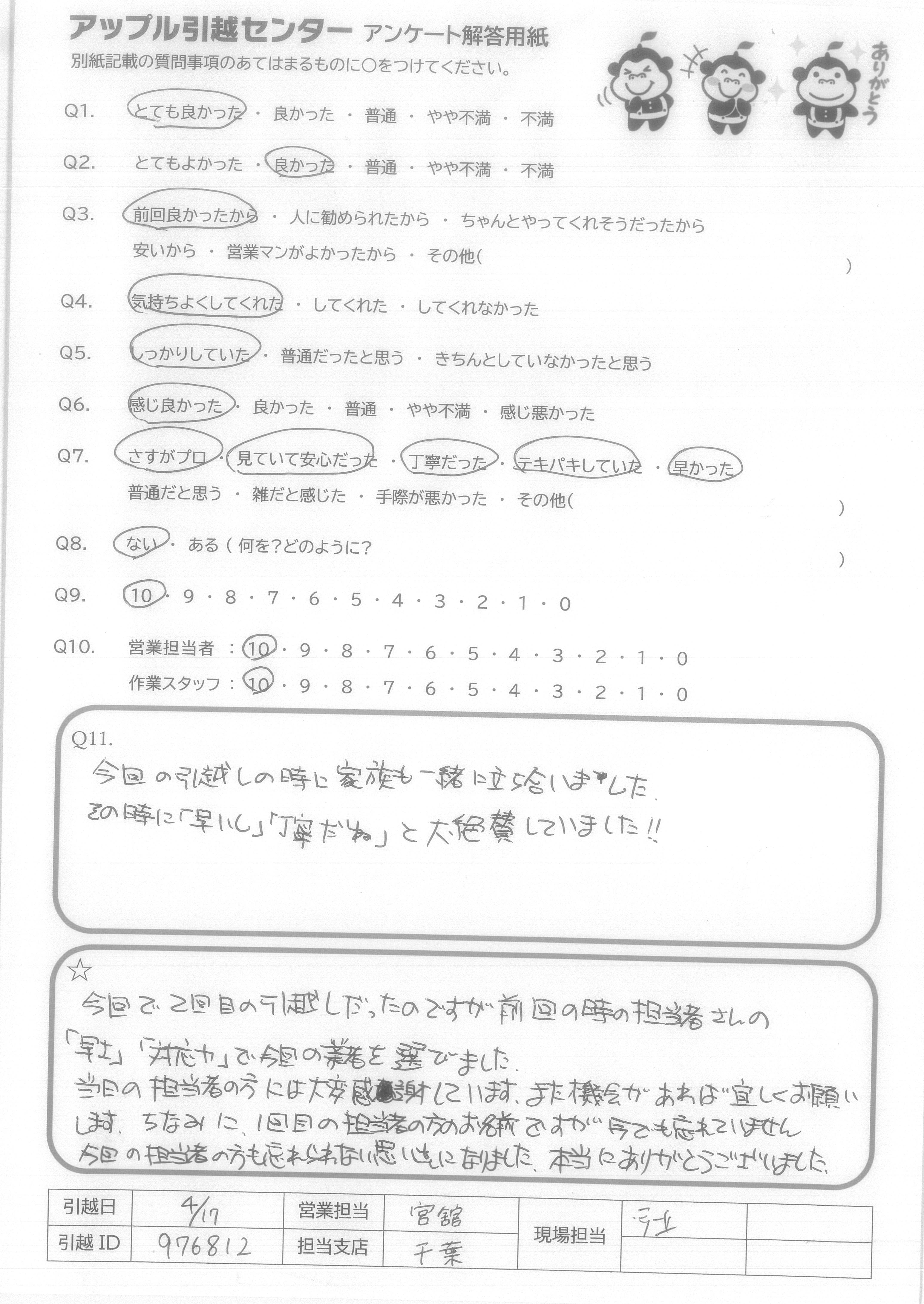 A.今回の引越の時に家族も一緒に立ち合いました。 その時に「早いし」「丁寧だね」と大絶賛していました!!
