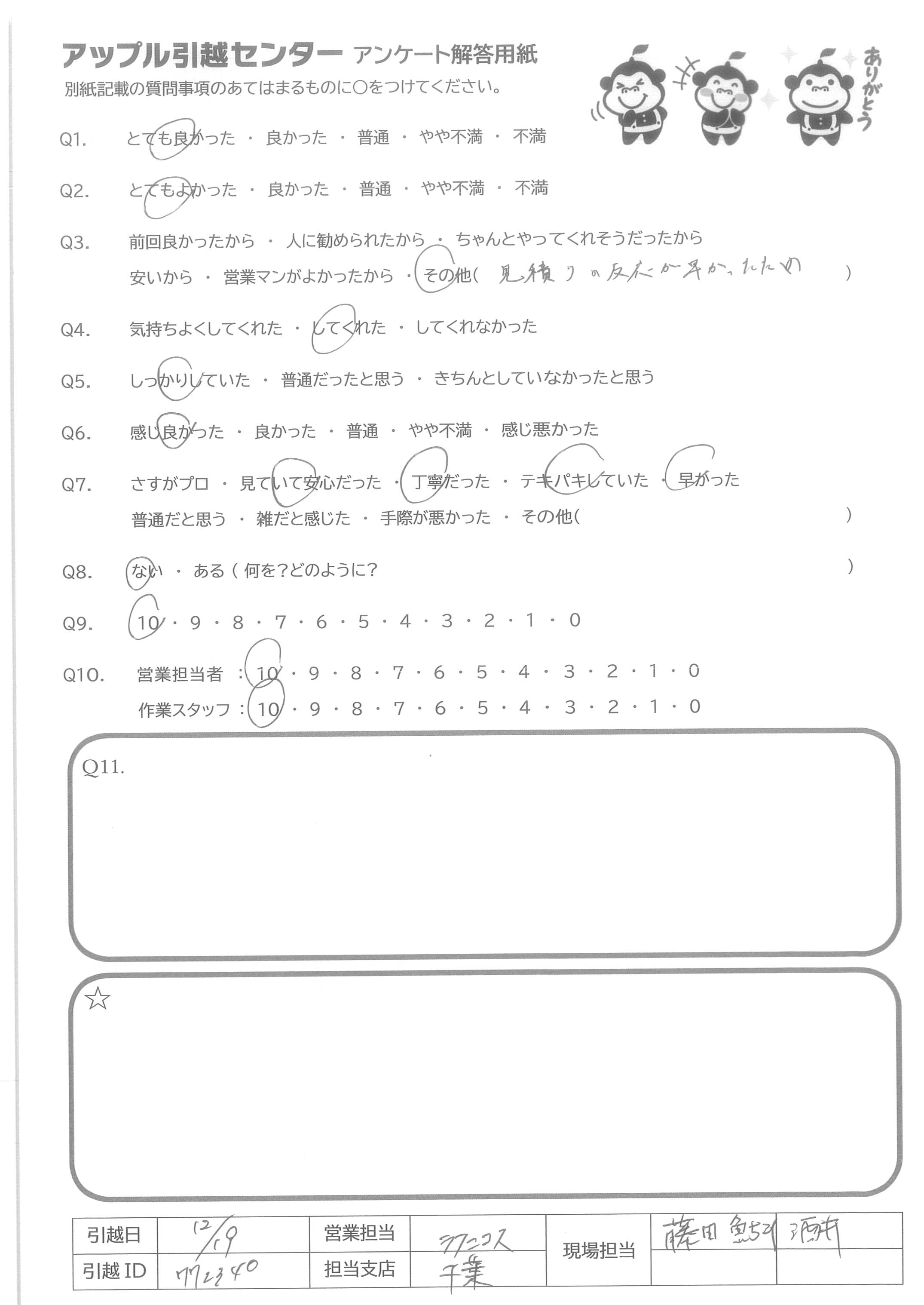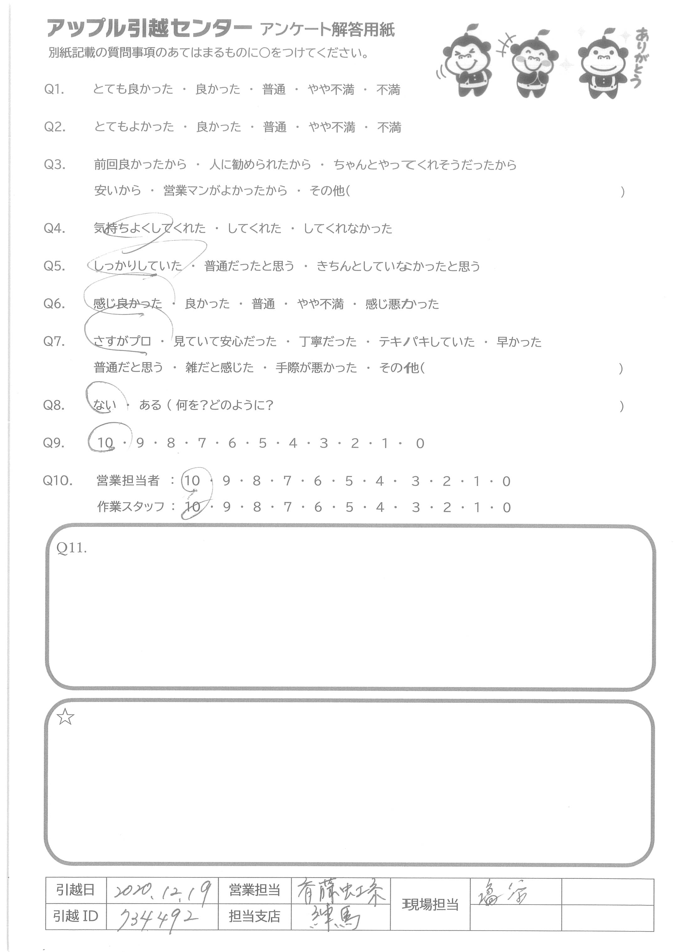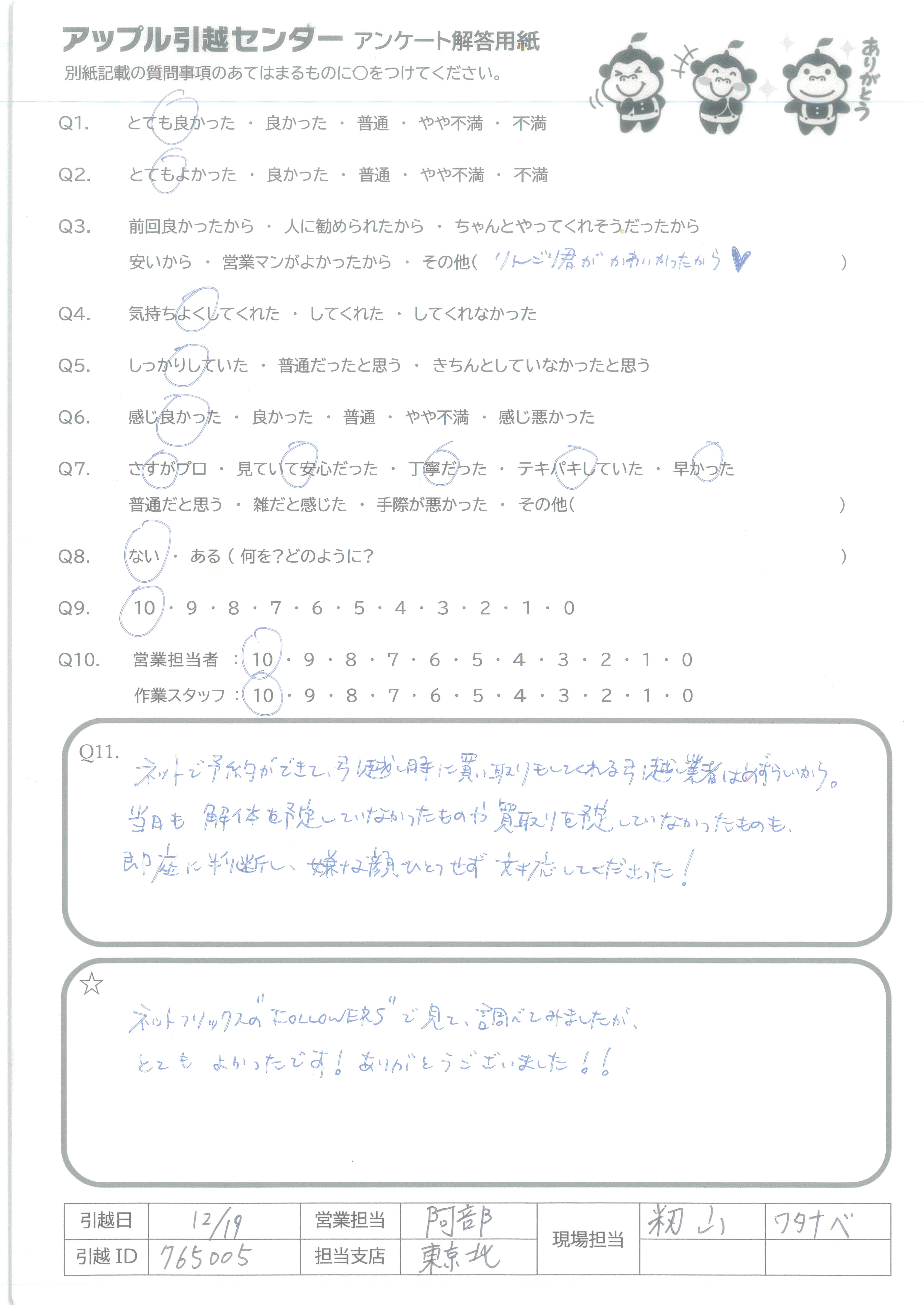 A.友人に教えてもらい貴社を知りました。また次回利用する際や、周りに引っ越しを検討している人がいたら紹介します。ありがとうございました! なお、抽選方は存じますがぬいぐるみは不要です!