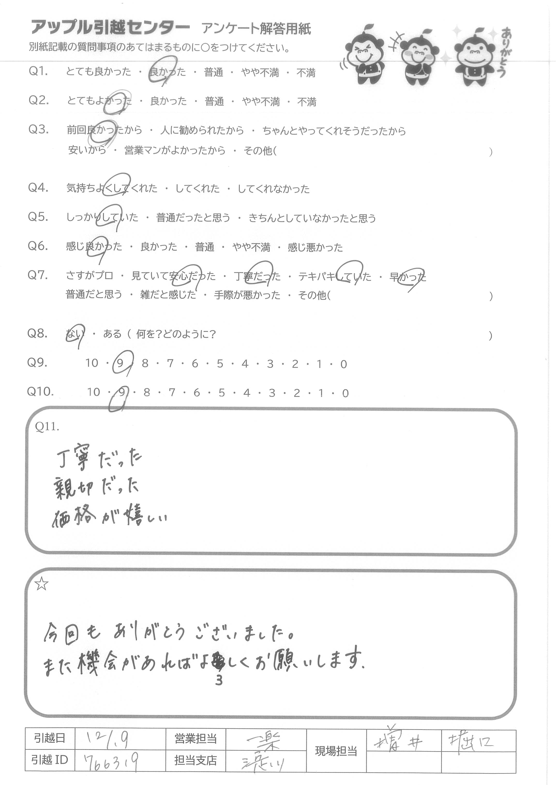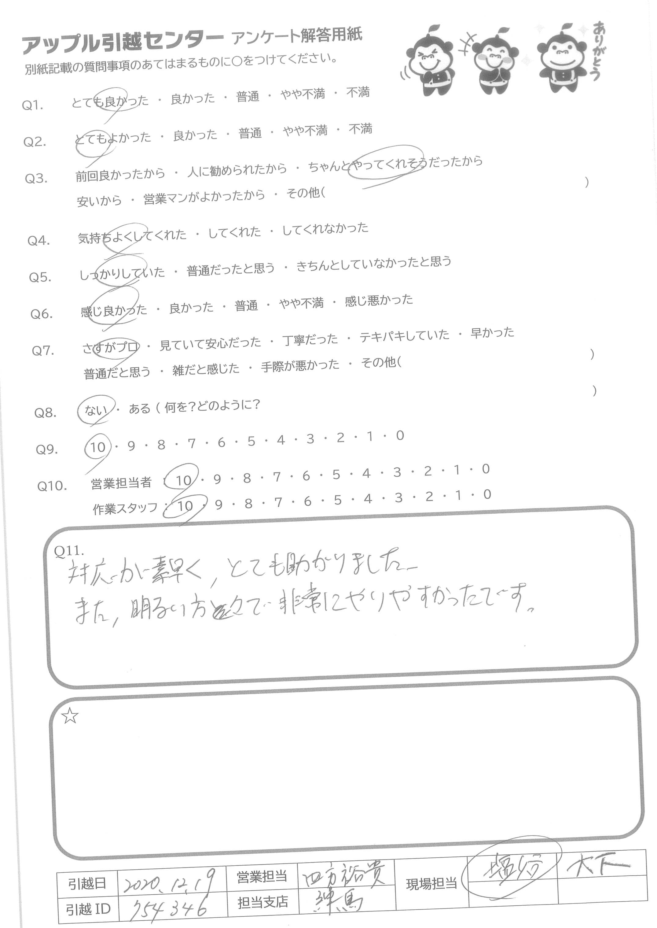 A.引越しで一番苦労する不用品の処理を面倒がらずに対応してくれるところは、他社との差別化として大きなポイントだと思いました。 それをただの掴みにせず、肝心な作業対応もしっかりしているのが更に大きなポイントだと思います。 私が小さい頃、引越しでさんざん苦労していた両親に、引越し業者さんの中にも本物のプロ集団が居たという事を見せてあげる事が出来なかったのが残念です。 関西はこれからという事ですが、ぜひ頑張ってほしいです。 引っ越し業者なんてどこも一緒だからと価格勝負になってしまっている業種に、あなた方のような出来る人たちがもっと出て来てほしいです。 引越しは単なる作業ではなく、人生の場面転換での大きなトピックの一つです。 友人、同僚、親戚全部に紹介したいです。 お世話になりました。ありがとうございました。