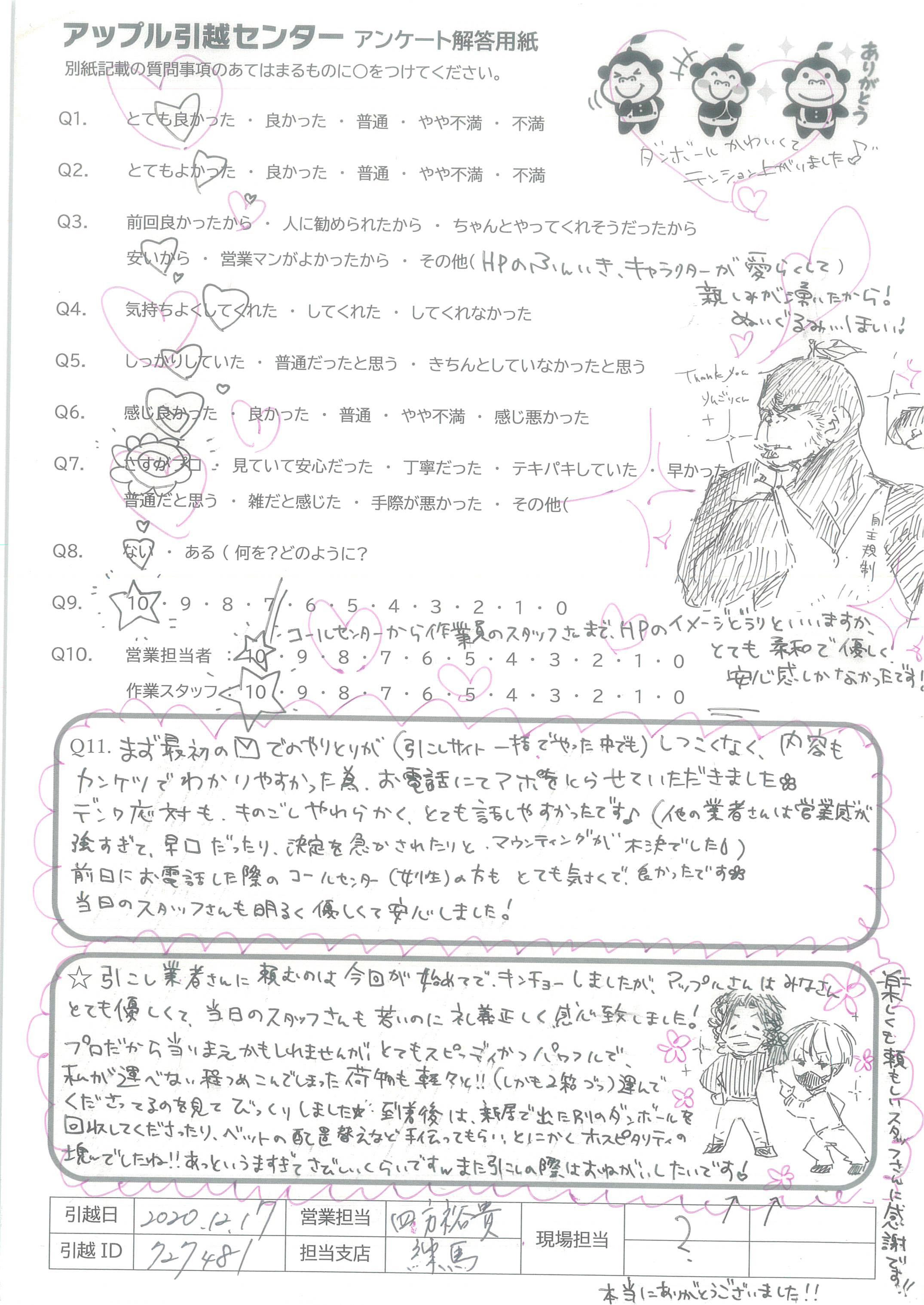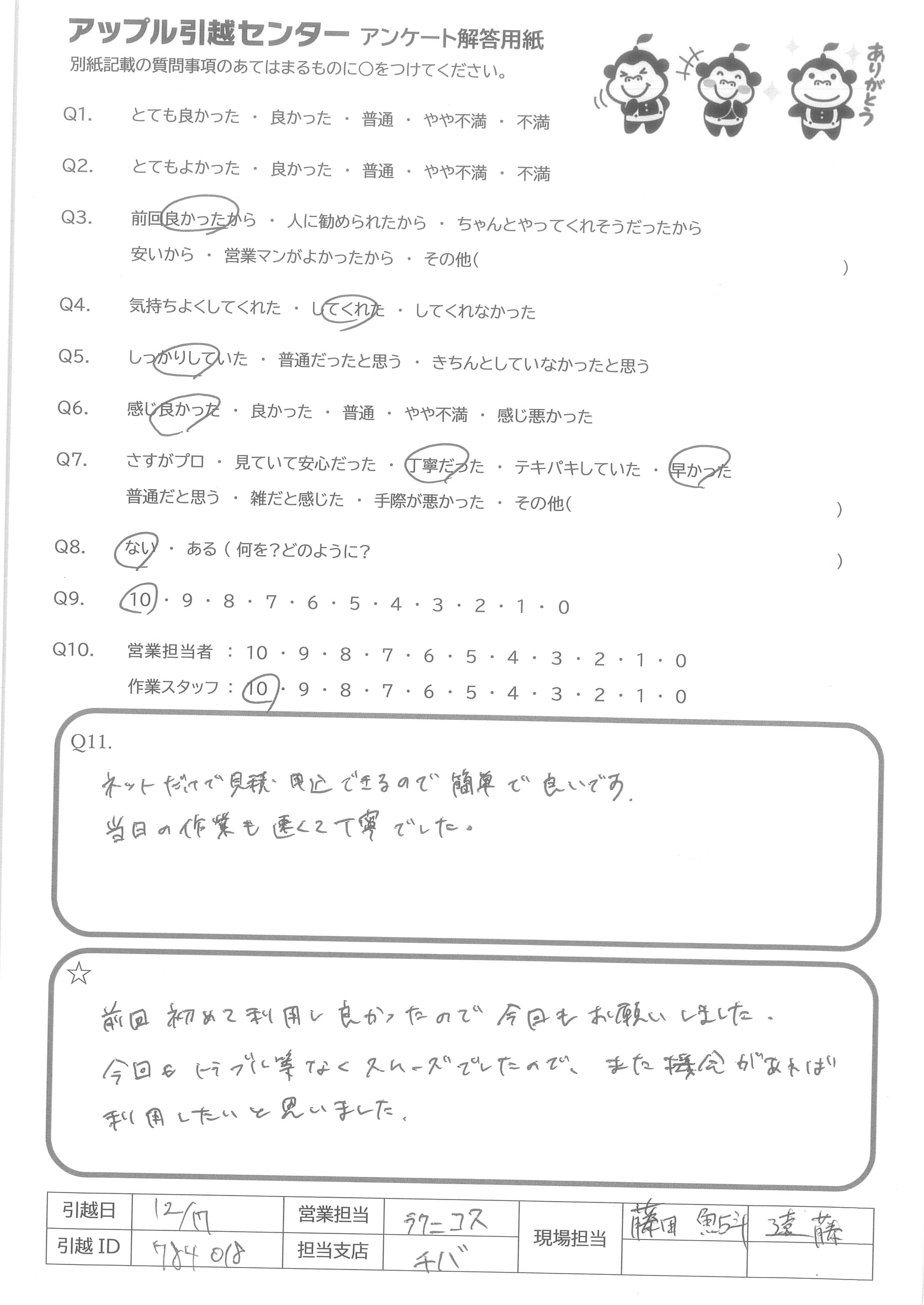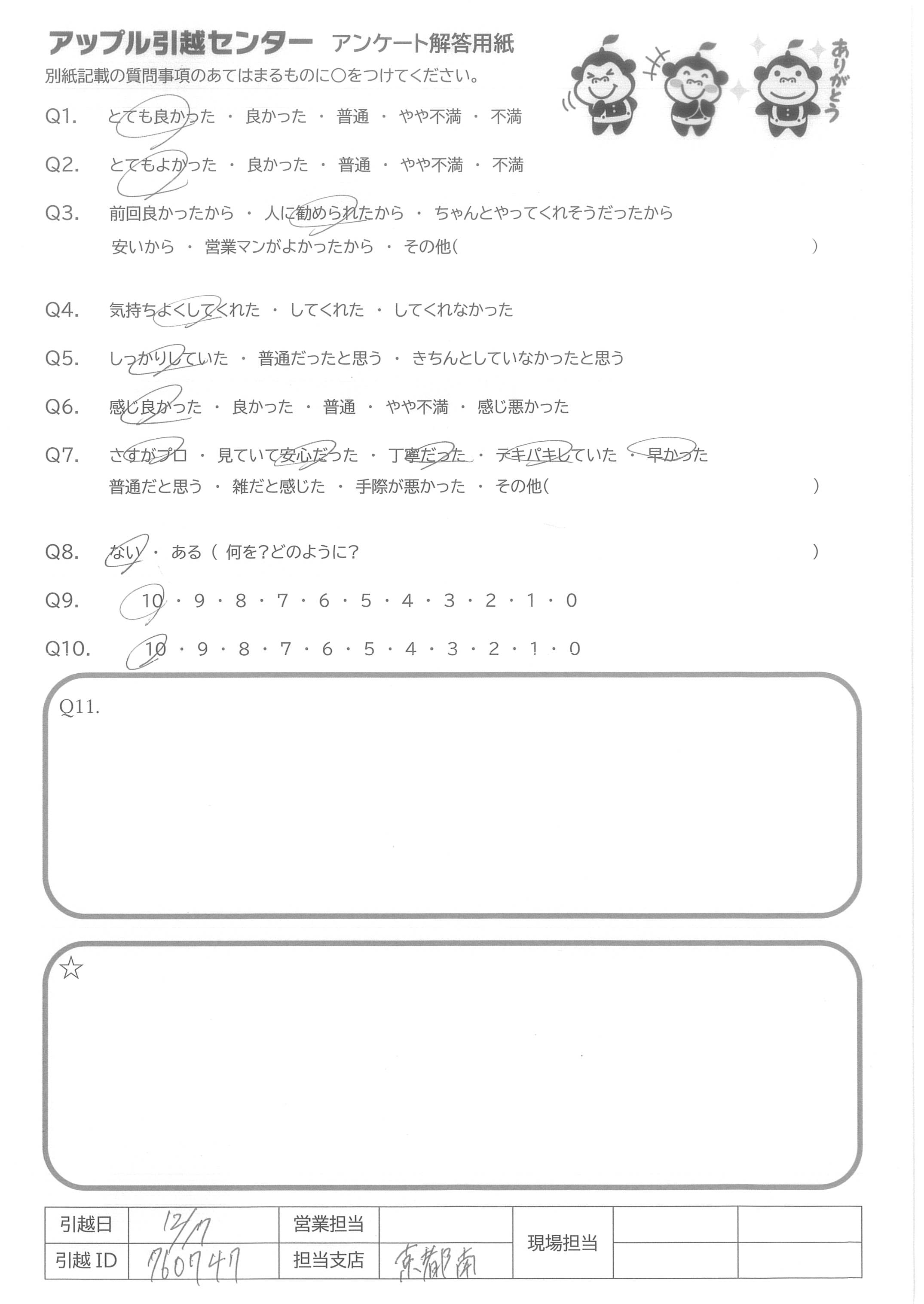A.とても丁寧に荷物を運んでいただきとても助かりました。 コイケさんとスズキさんで作業いただきましたが、連携がうまくとれているように見え見ていて安心できました。 楽しい引越にしてくれてありがとうございました!