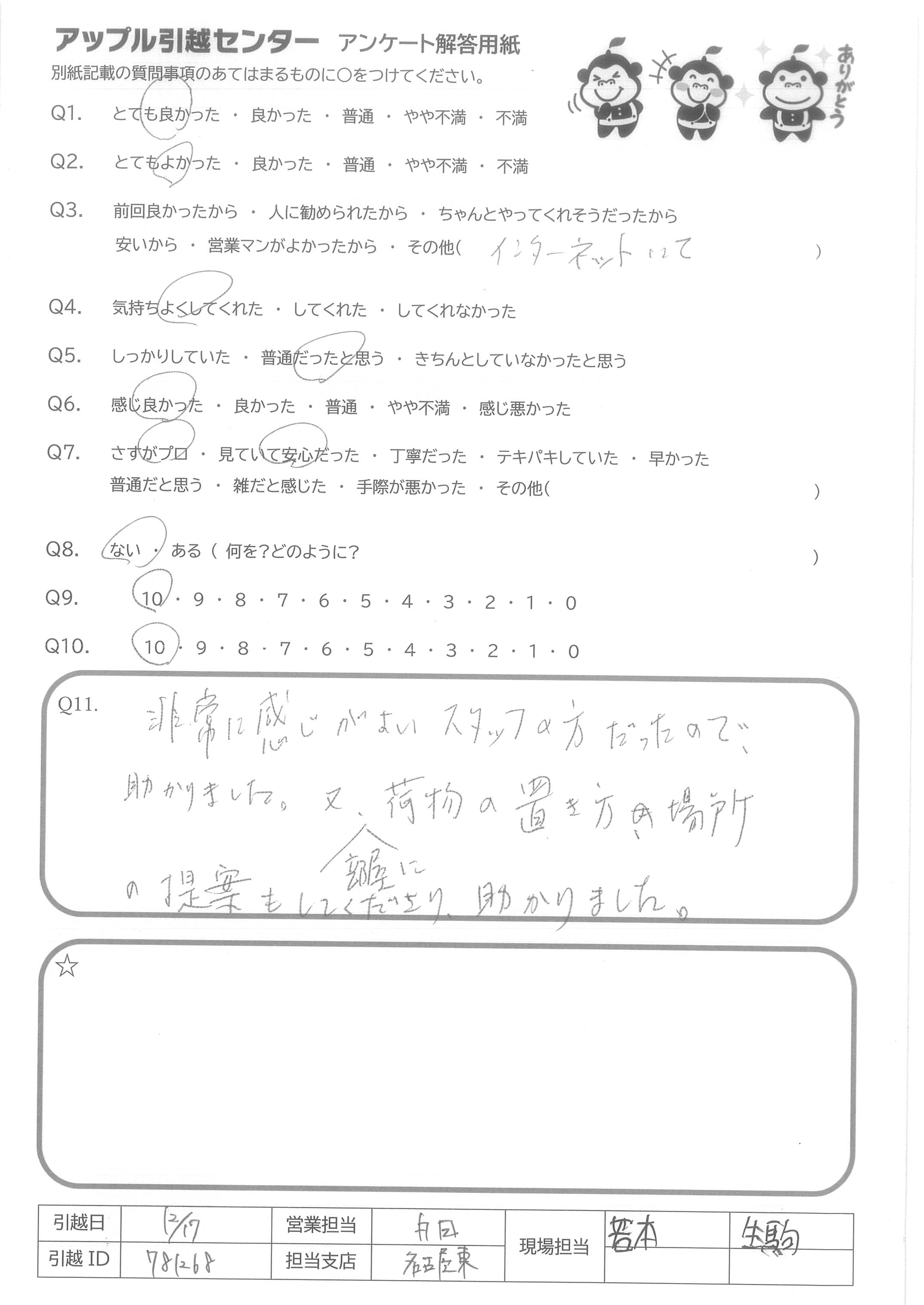 A.時間通りに来てくれて、せいけつ感もあり、テキパキと仕事をしていただきとても安心して引越しできました。 ありがとうございました。