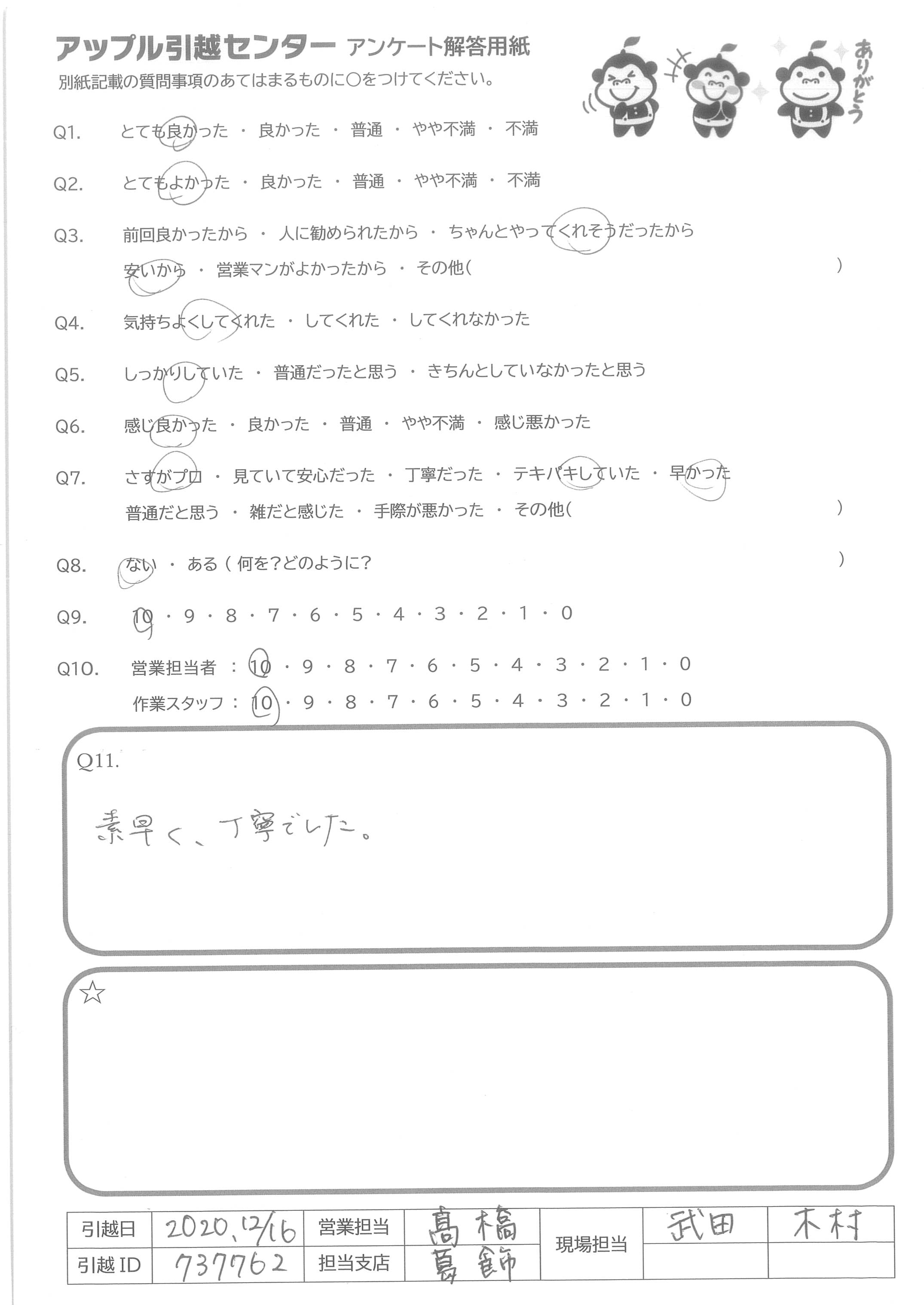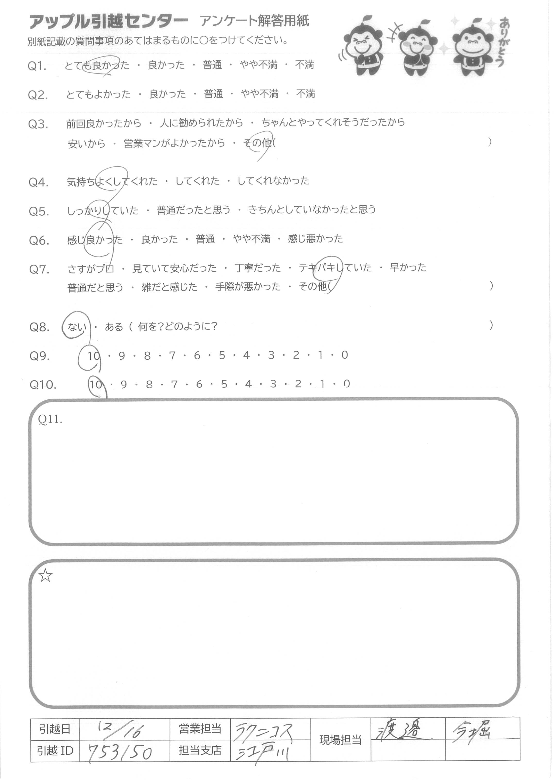 A.アンケートが遅くなってしまってすみませんでした。。m(_ _)m 丁寧に対応していただき助かりました。また引っ越しをする際には、ぜひお願いしたいです。 本当にありがとうございました!