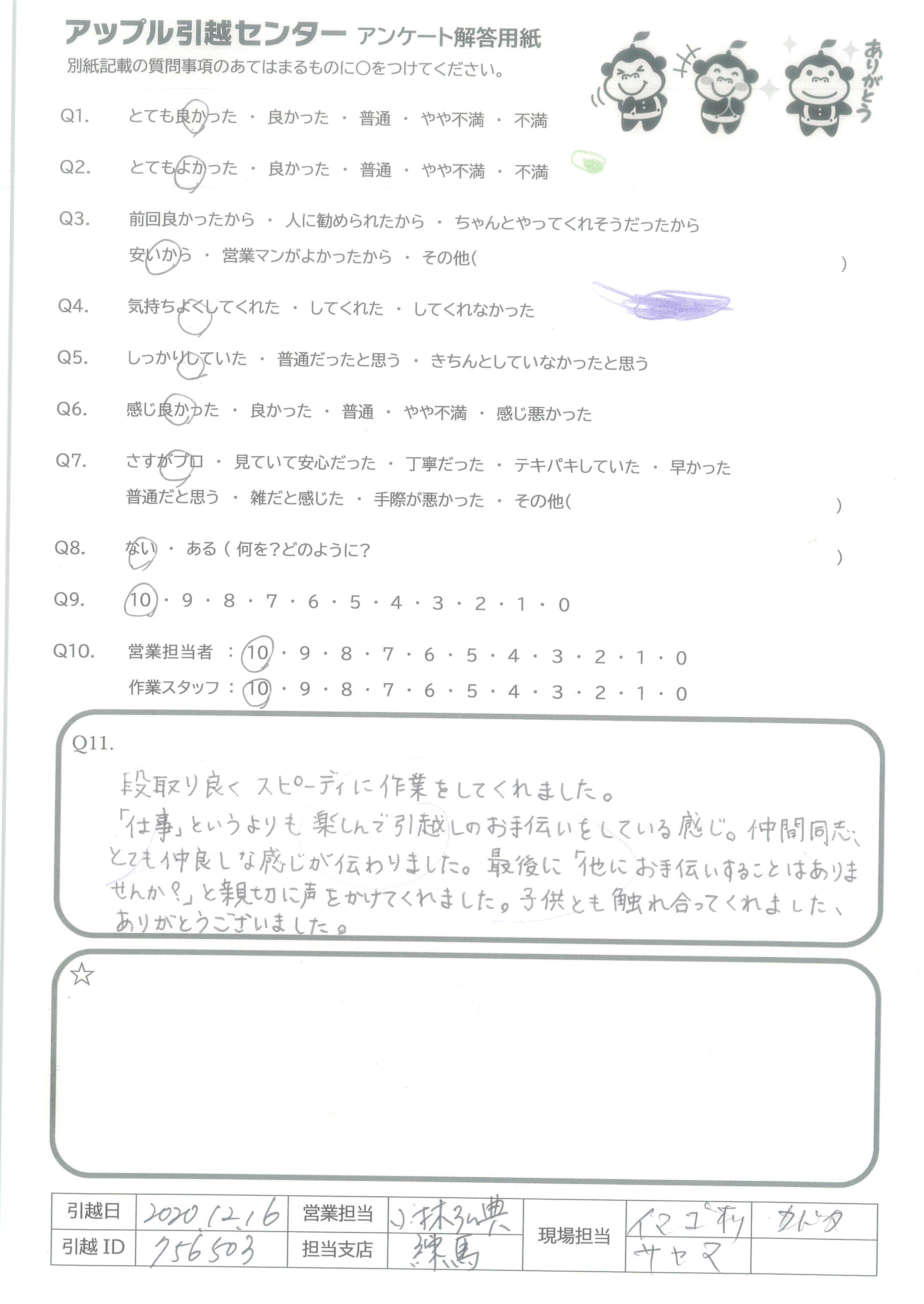 A.段取り良くスピーディに作業をしてくれました。 「仕事」というよりも楽しんで引越しのお手伝いをしている感じ。仲間同志、とても仲良しな感じが伝わりました。最後に「他にお手伝いすることはありませんか?」と親切に声をかけてくれました。子供とも触れ合ってくれました、ありがとうございました。