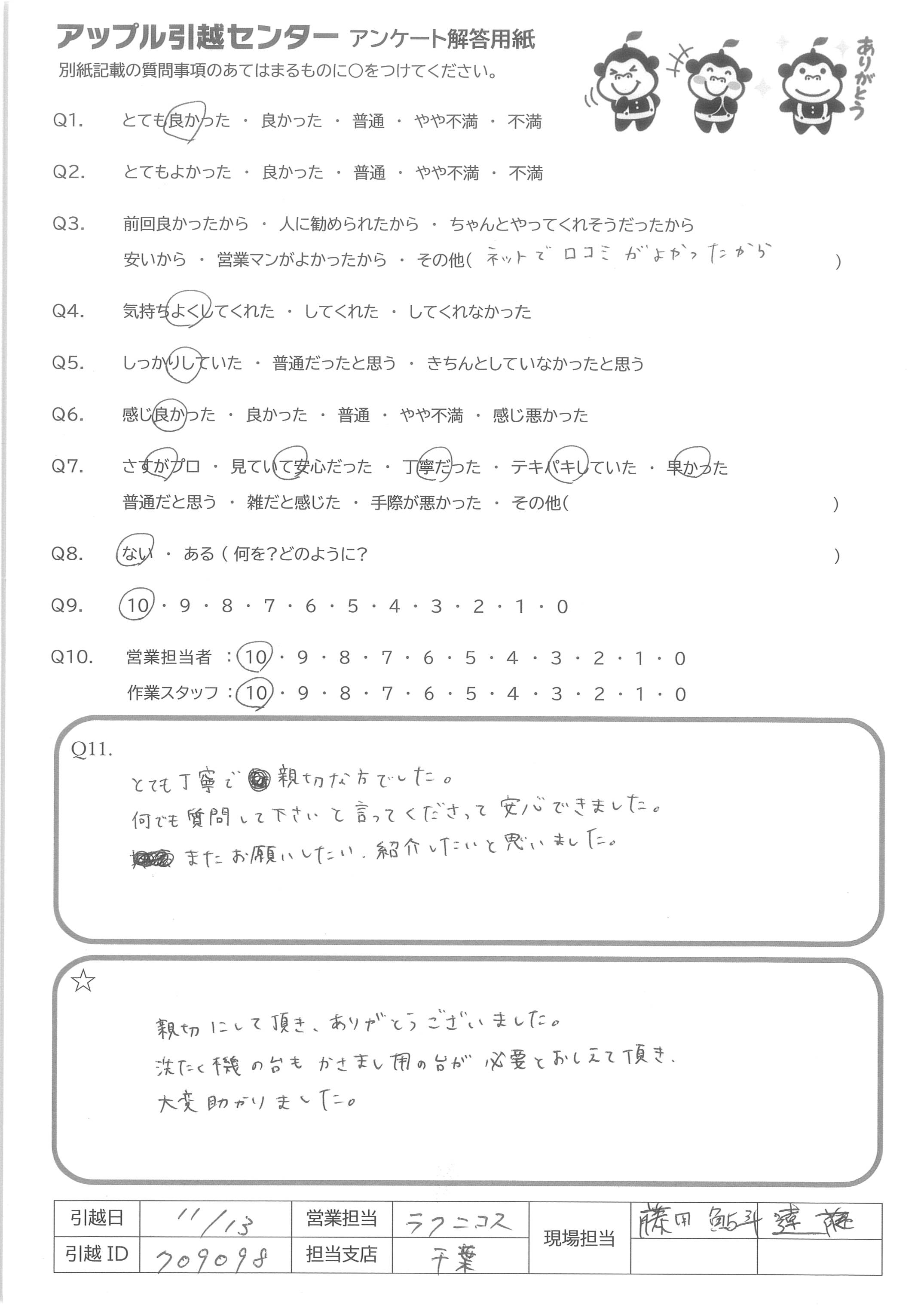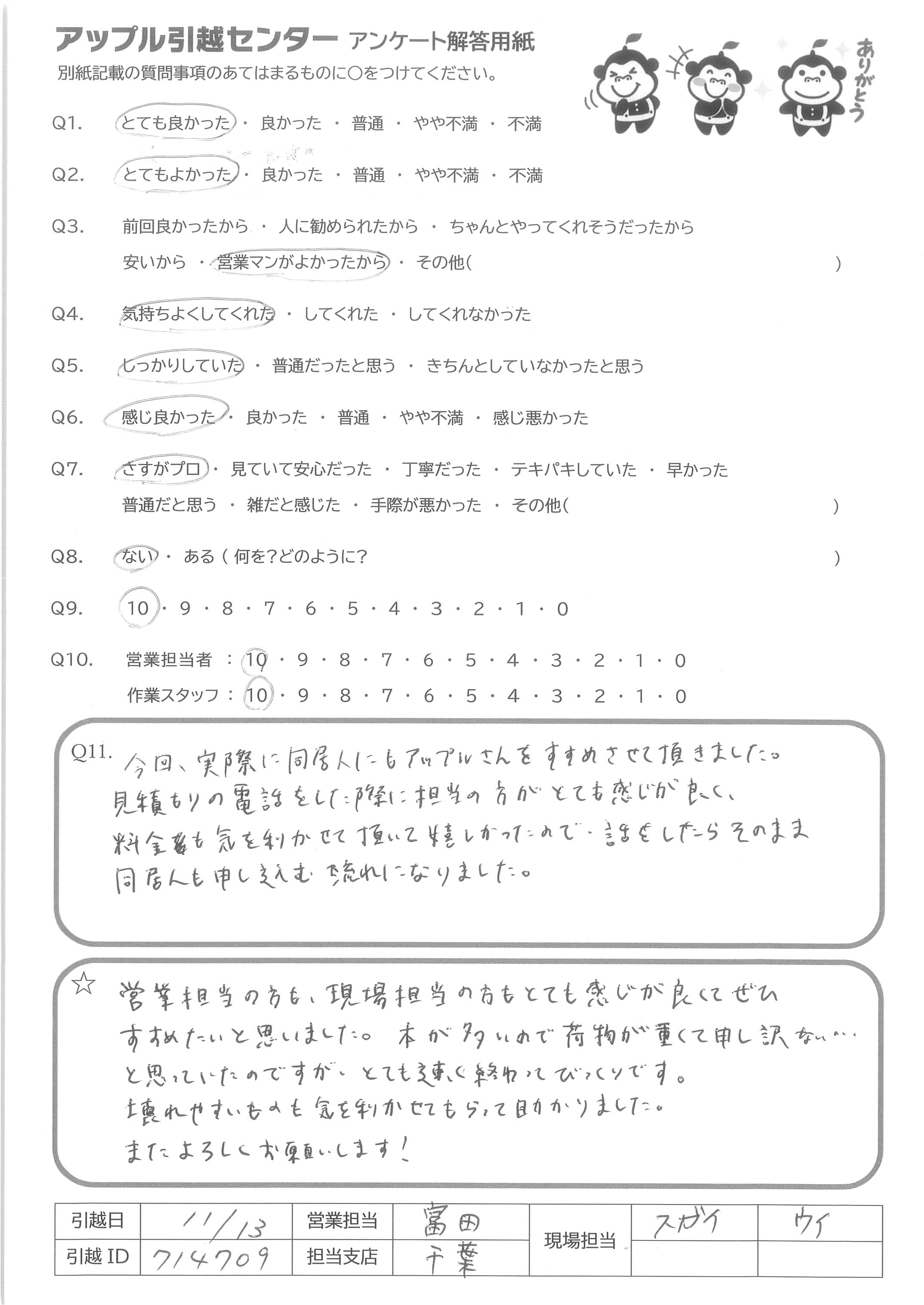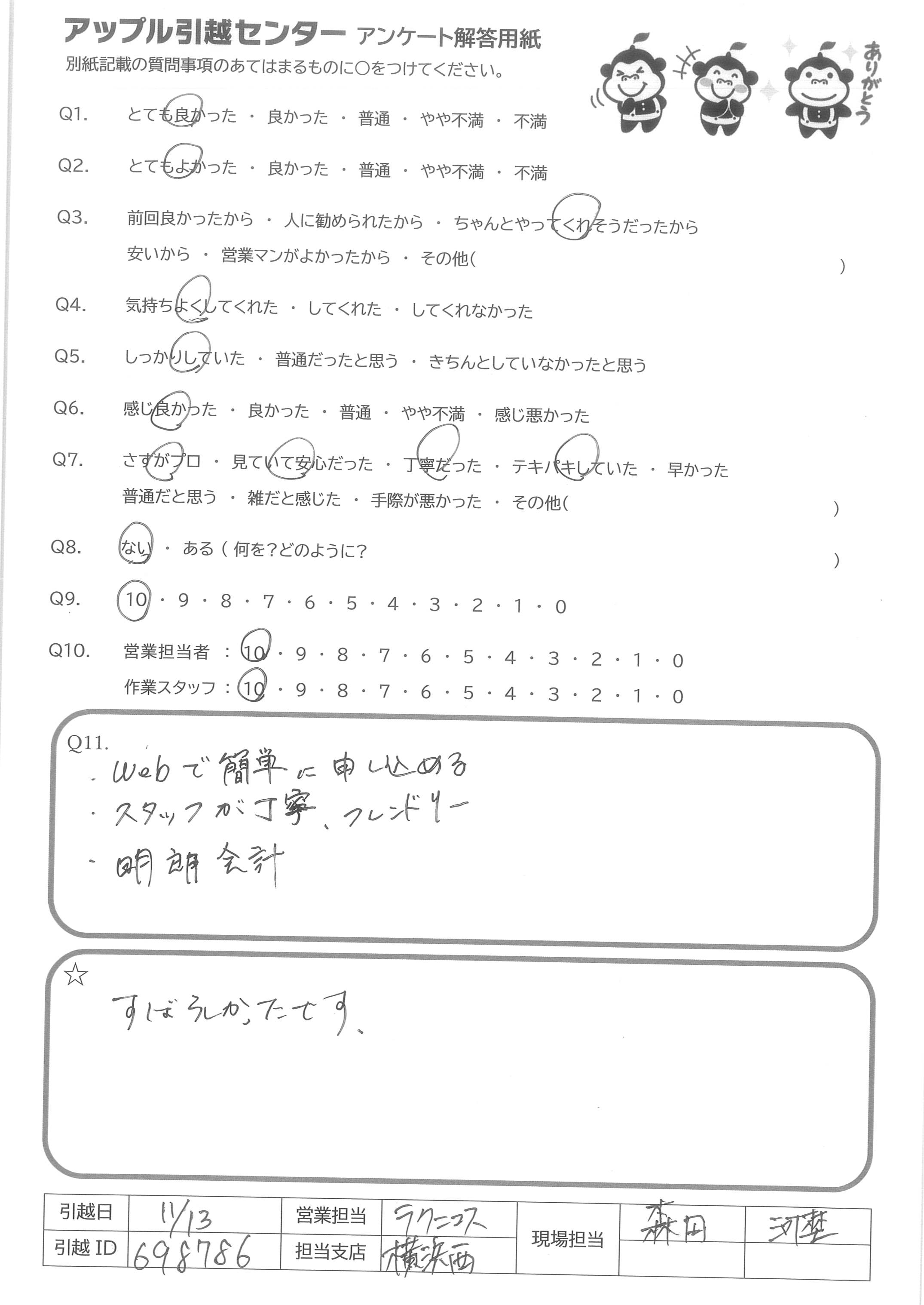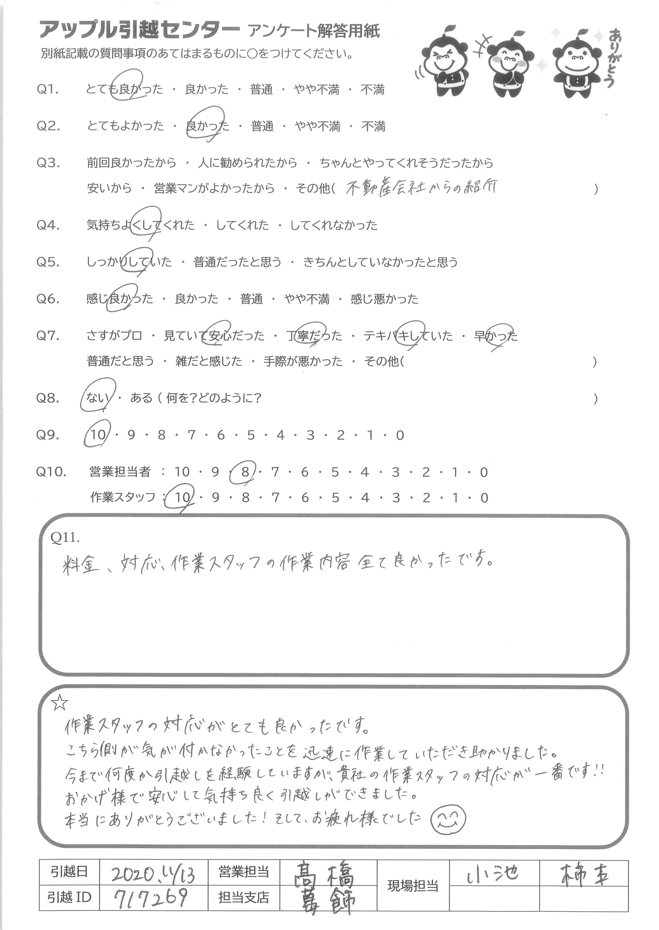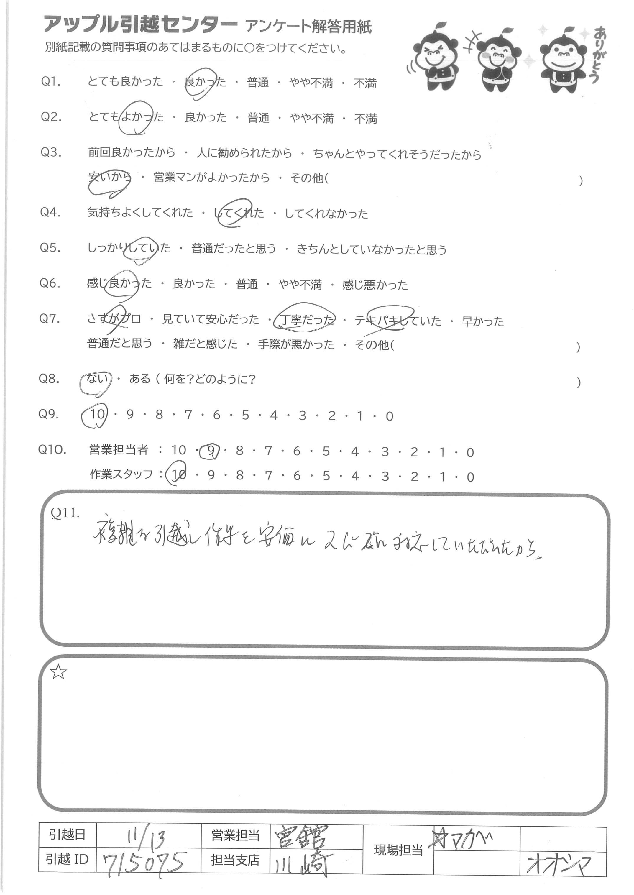 A.今回お引越しを御対応頂きました。 迅速かつ丁寧で臨機応変な対応に家内踏まえて大満足でした。 小さな子供もいたので、丁寧な対応でとても助かりました。 友人等にもお薦めさせて頂きます。 この度はありがとうございました。