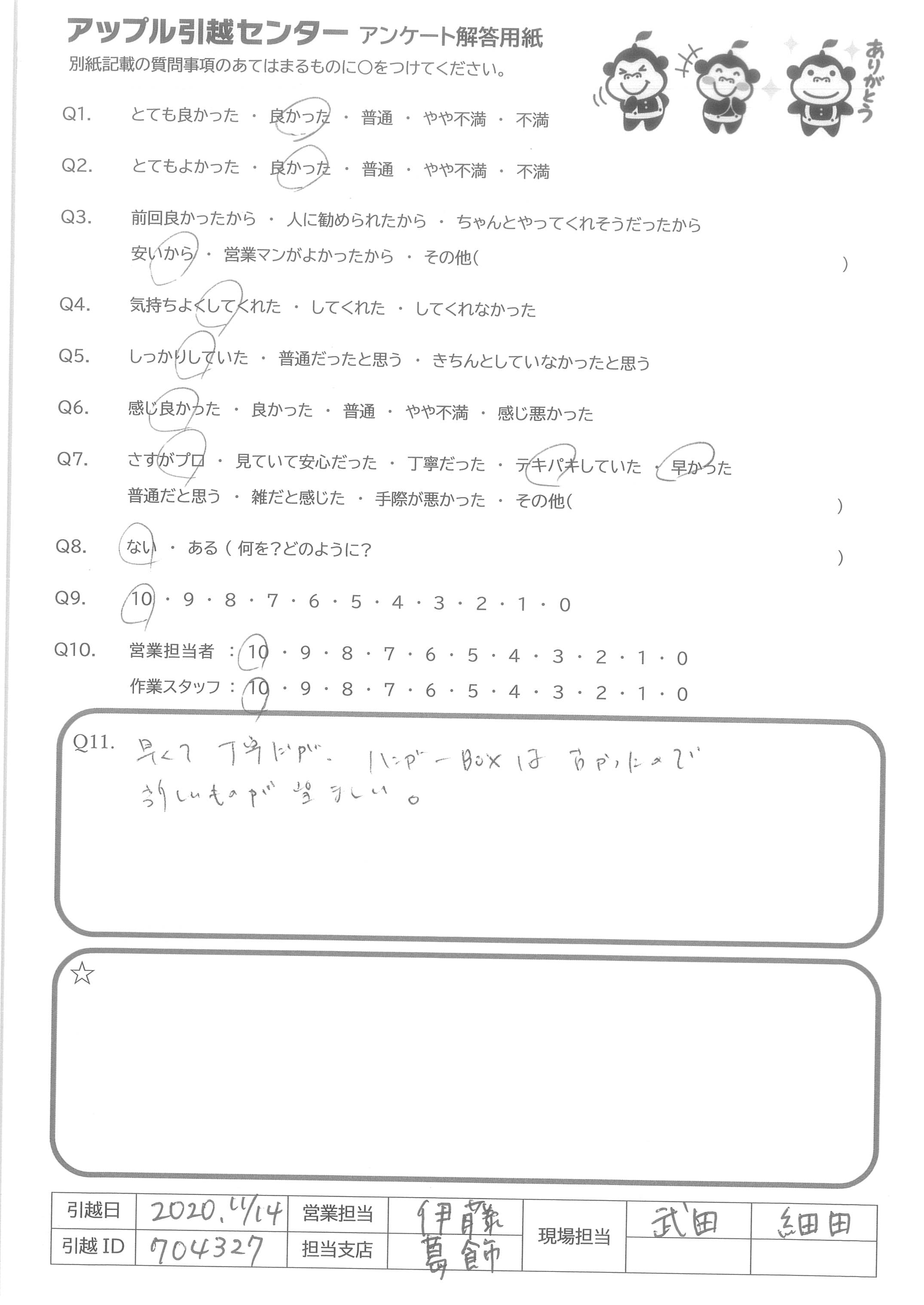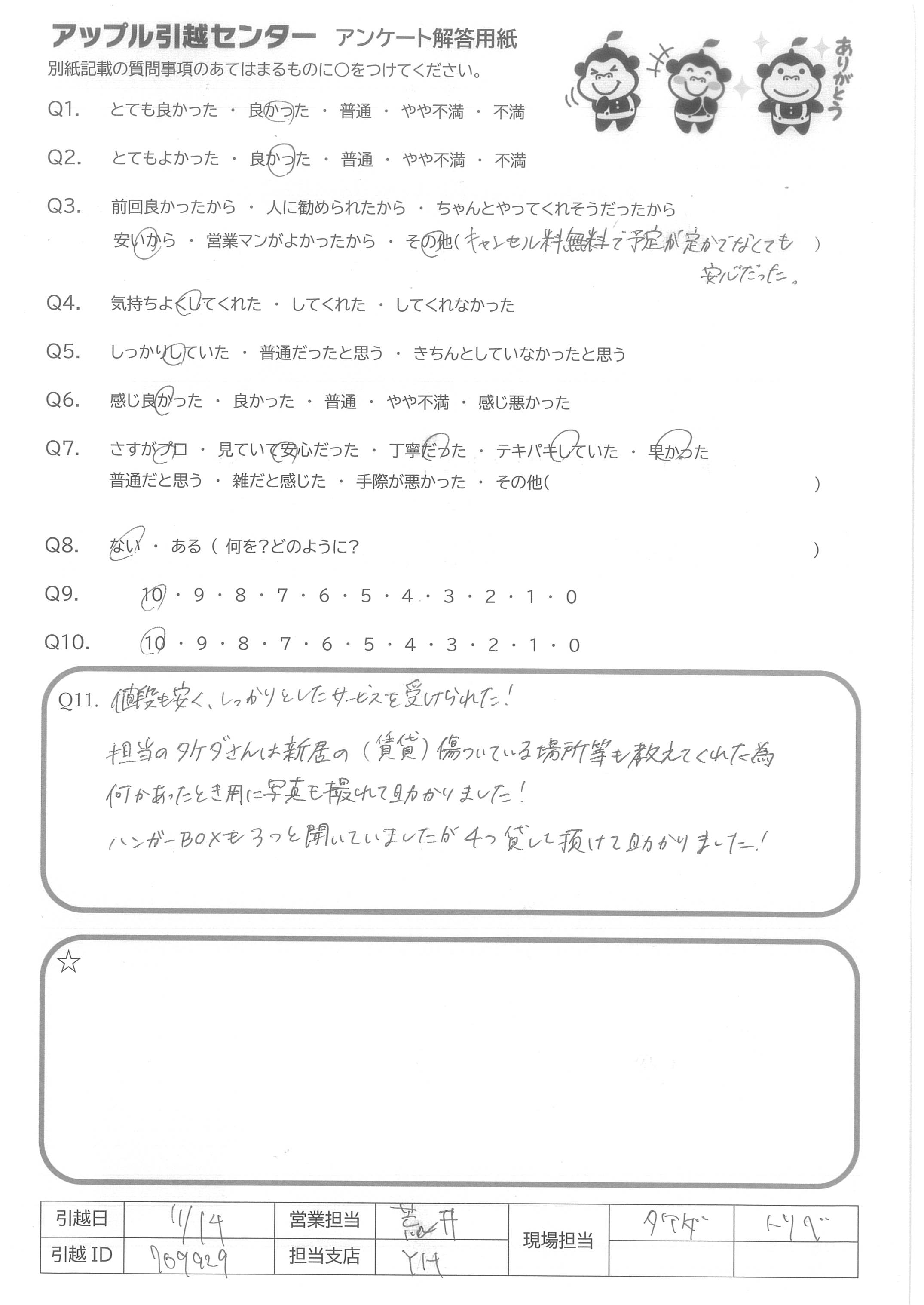 A.値段も安く、しっかりとしたサービスを受けられた! 担当のタケダさんは新居の(賃貸)傷ついている場所等も教えてくれた為何かあったとき用に写真も撮れて助かりました! ハンガーBOXINGも3つと聞いていましたが4つ貸して頂けて助かりました!