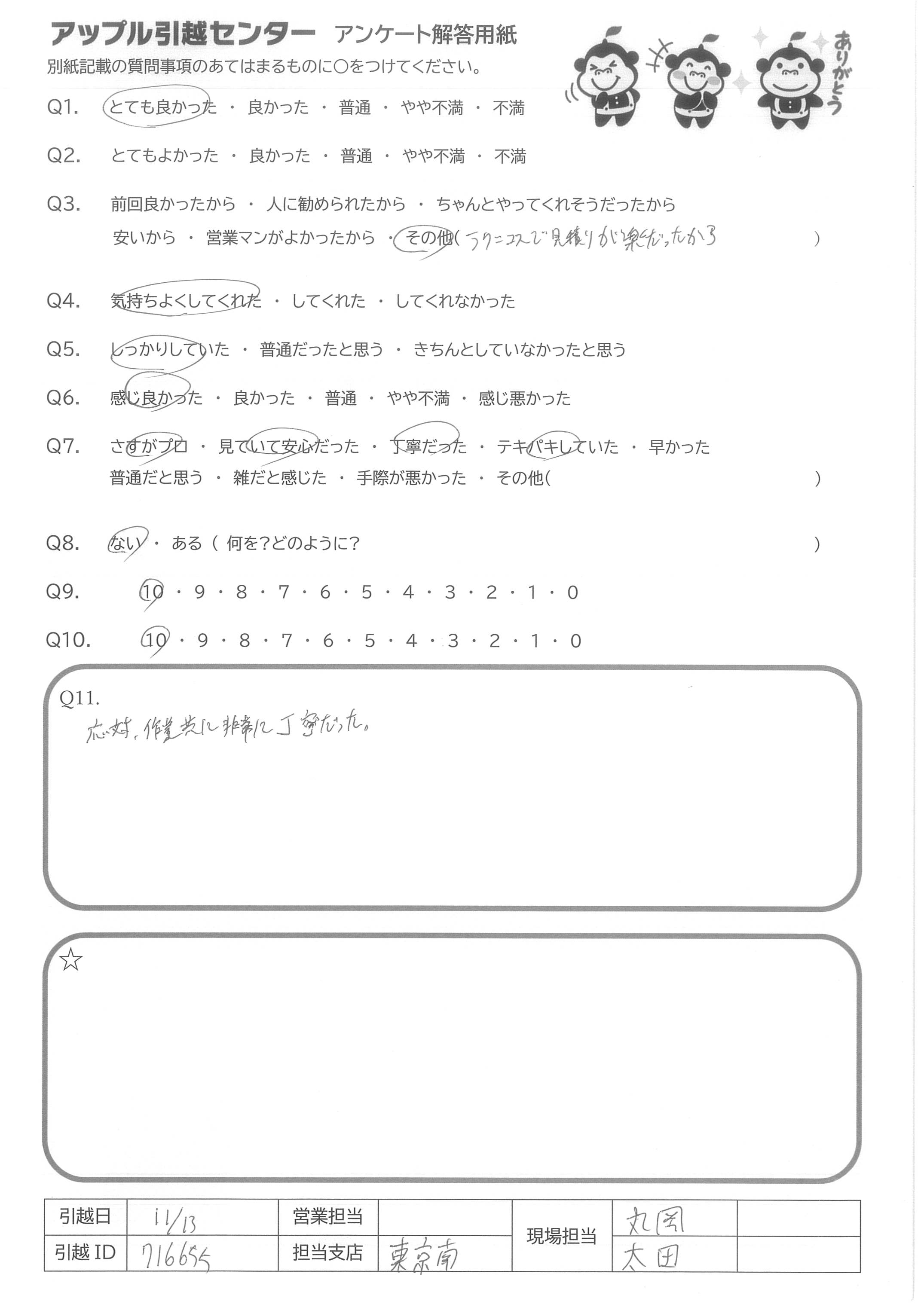 A.作業スタッフの対応がとても良かったです。 こちら側が気が付かなかったことを迅速に作業していただき助かりました。 今まで何度か引越しを経験していますが、貴社の作業スタッフの対応が一番です!! おかげ様で安心して気持ち良く引越しができました。 本当にありがとうございました!そして、お疲れ様でした