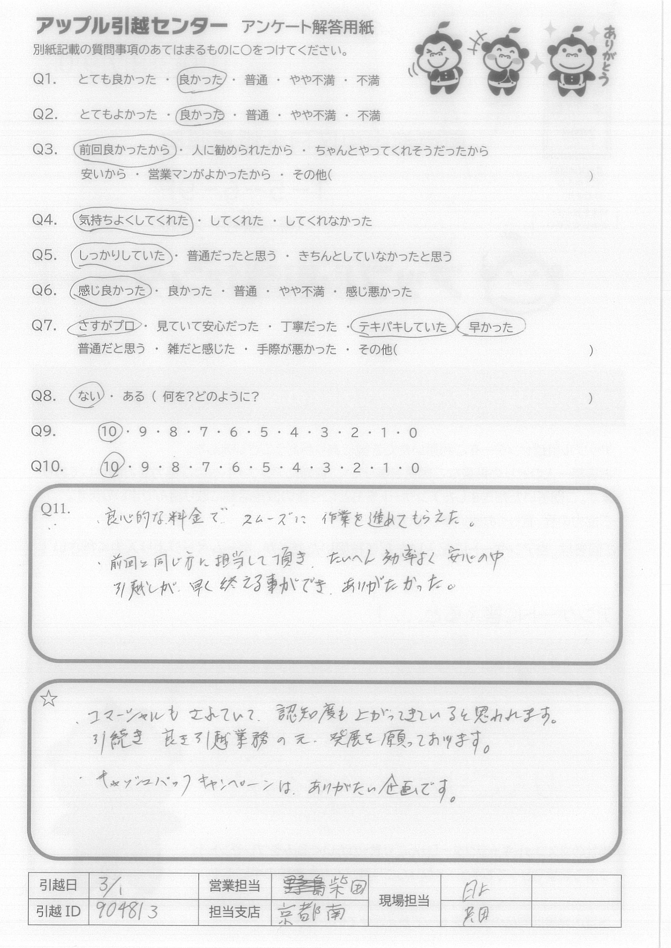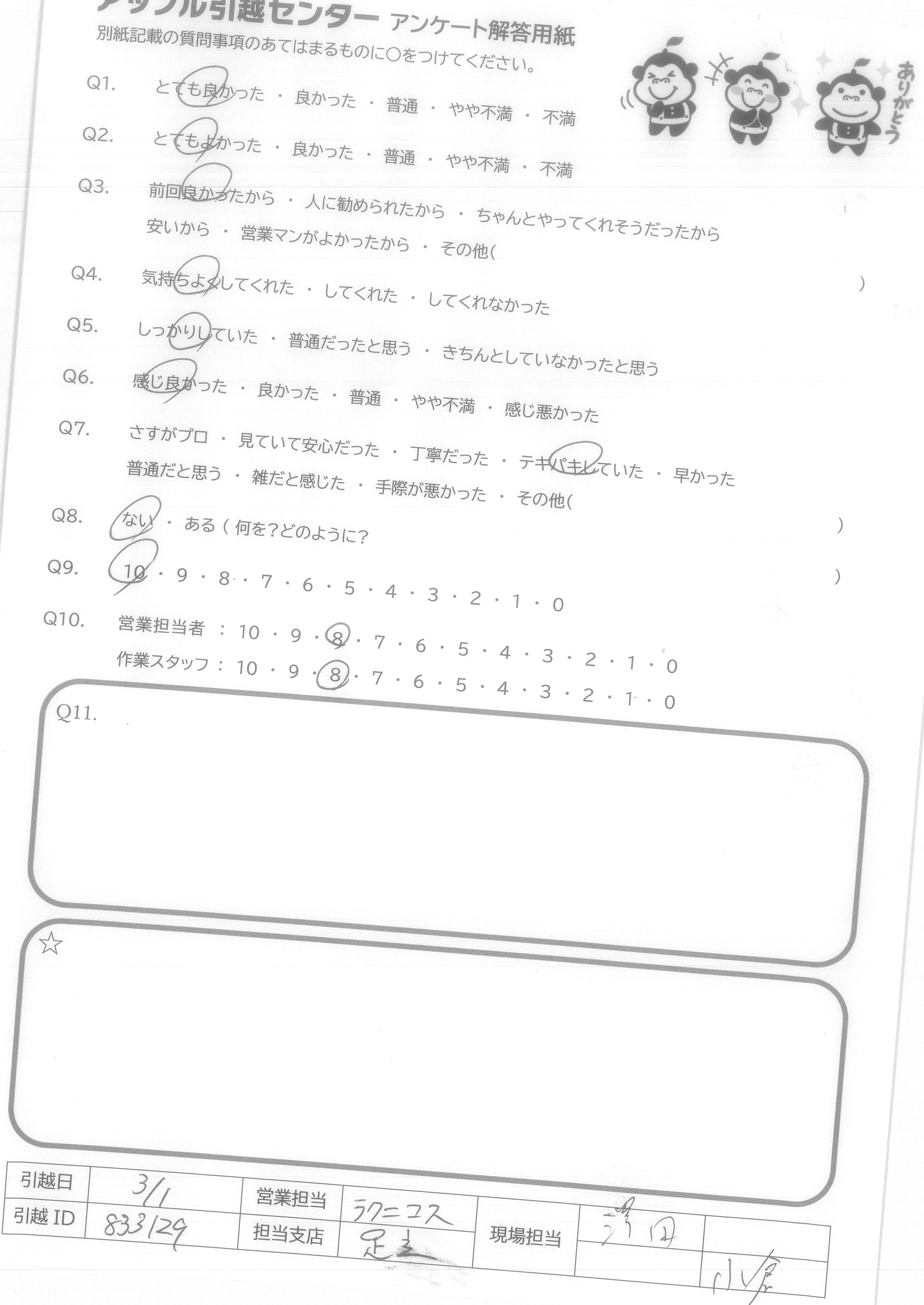 A.全てにおいて素晴らしい対応ありがとうございました。 他の業者に頼まず、アップルさんに頼んでよかったと思っております。次、引っ越しをする時もアップルさんに頼みたいと思います。ありがとうございました!!
