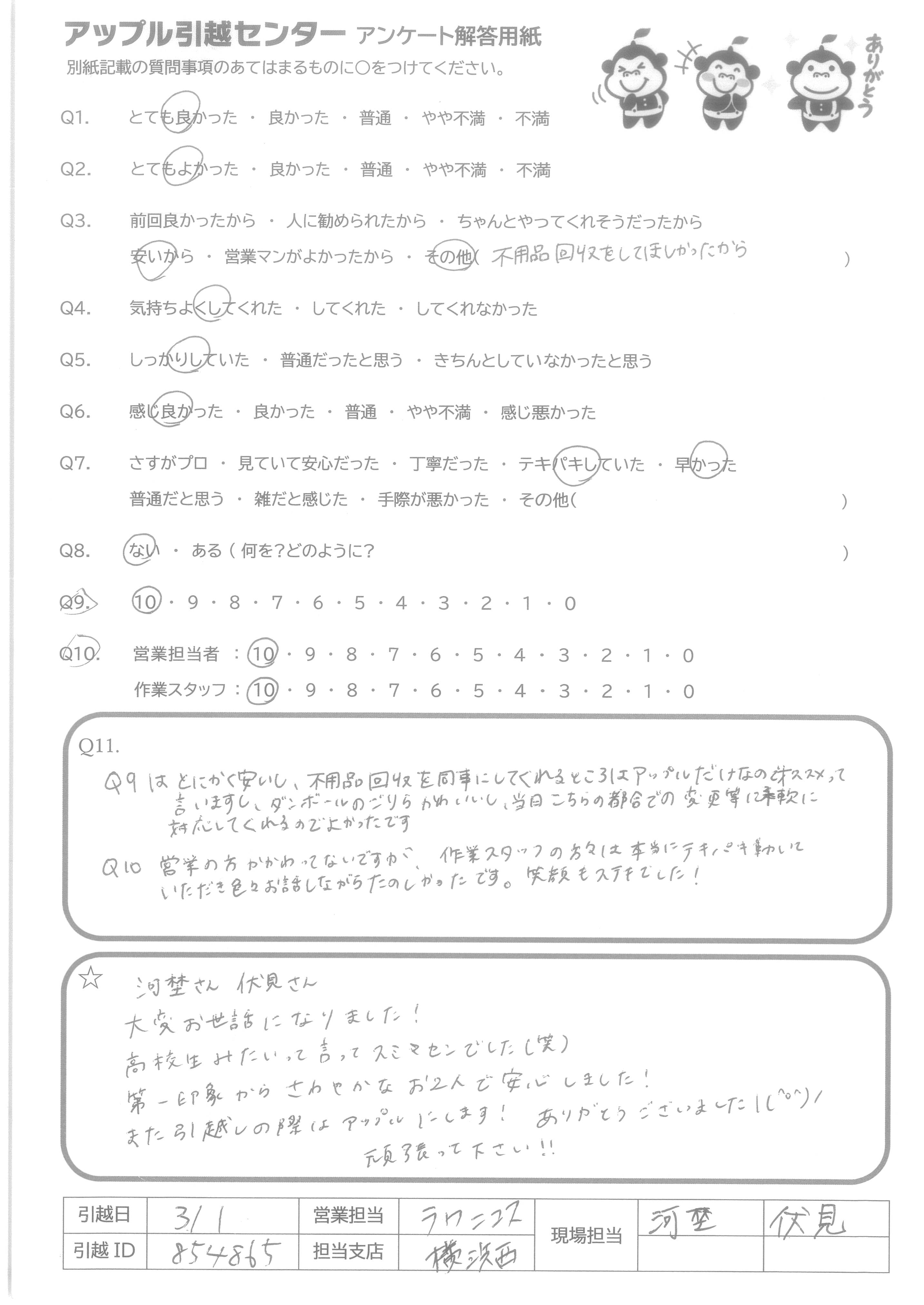 A.河埜さん伏見さん 大変お世話になりました! 高校生みたいって言ってスミマセンでした(笑) 第一印象からさわやかなお2人で安心しました! また引越しの際はアップルにします!ありがとうございました 頑張って下さい!!