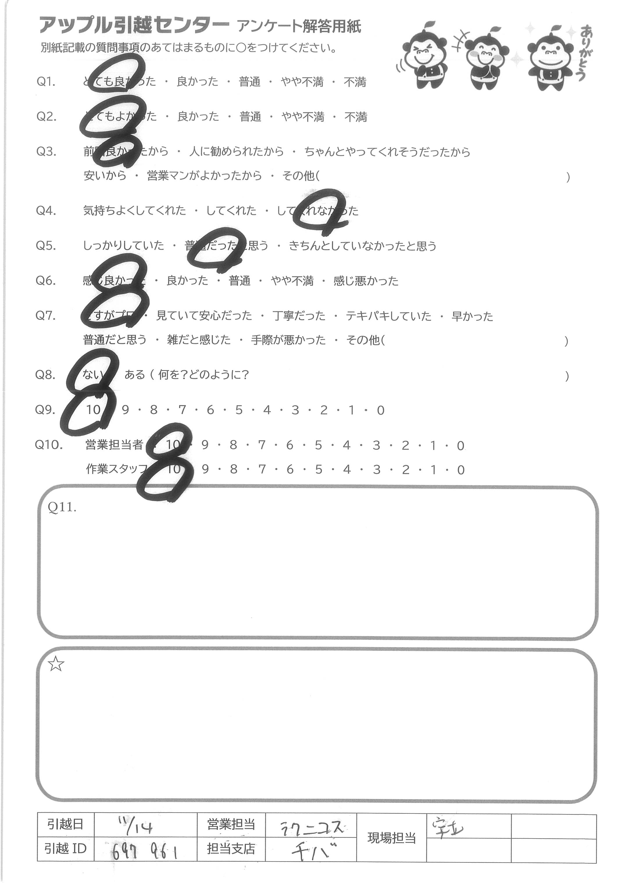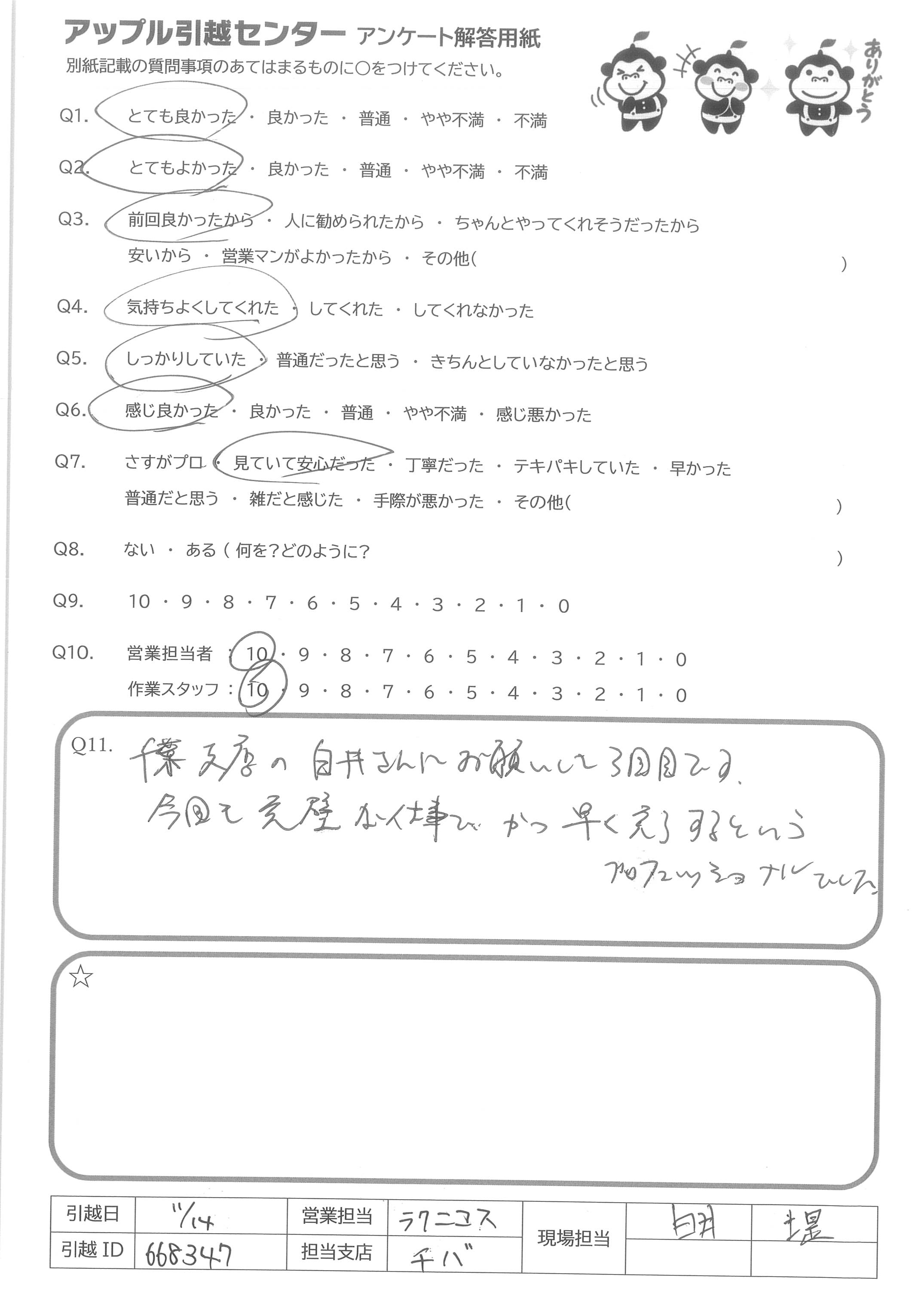 A.最初の見積もり対応から親切に対応して頂きありがとうございました。 今回友人からの勧めで御社にお願いしましたが、すべての面において親切・丁寧、かつ迅速に対応して頂き大変助かりました。 次回引っ越す際もお願いできたらと思っております。