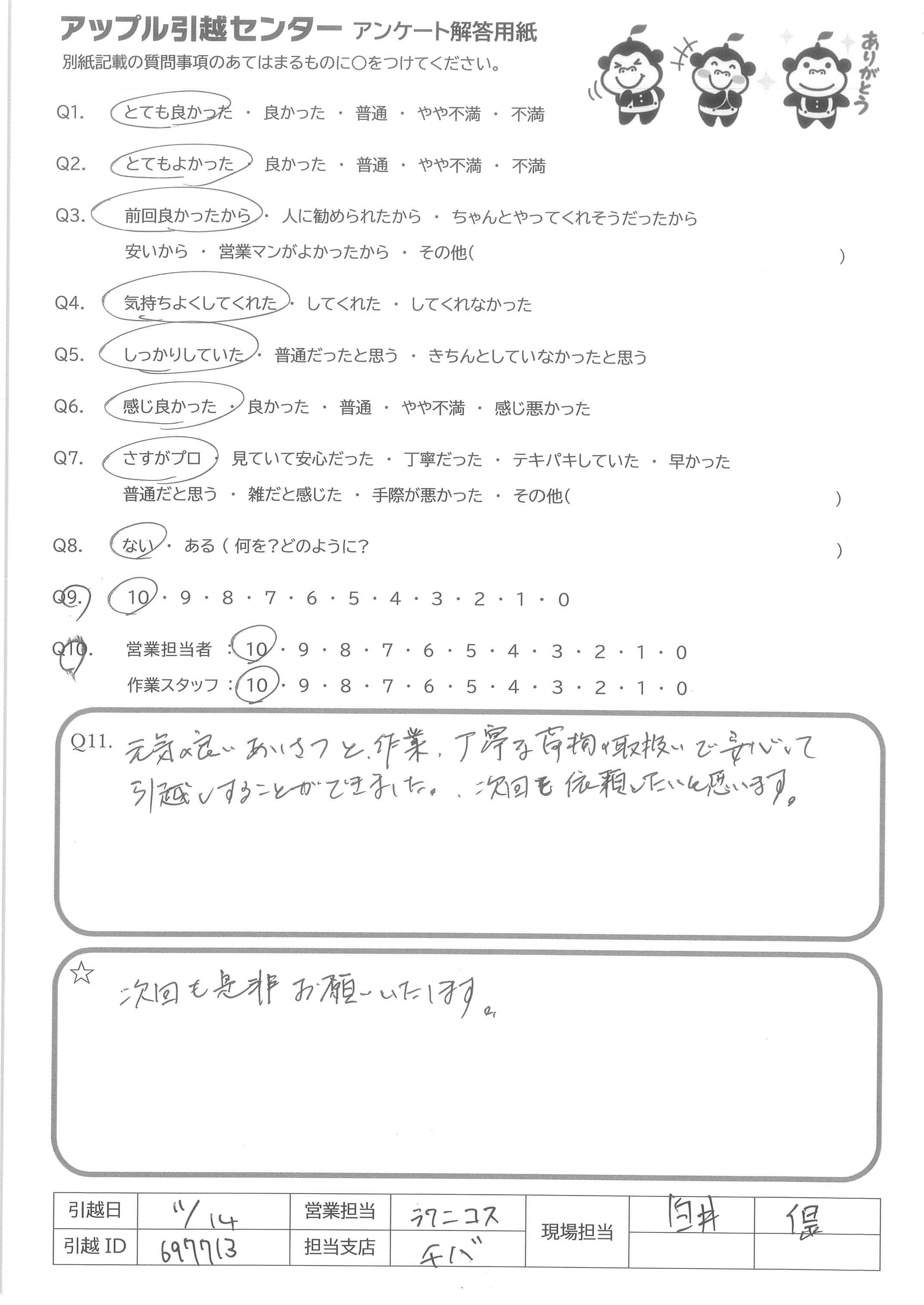 A.今回の引っ越しでは御社にお願いしてしっかり対応して頂いたので、次の引っ越しでも利用させて頂きたいと思います。