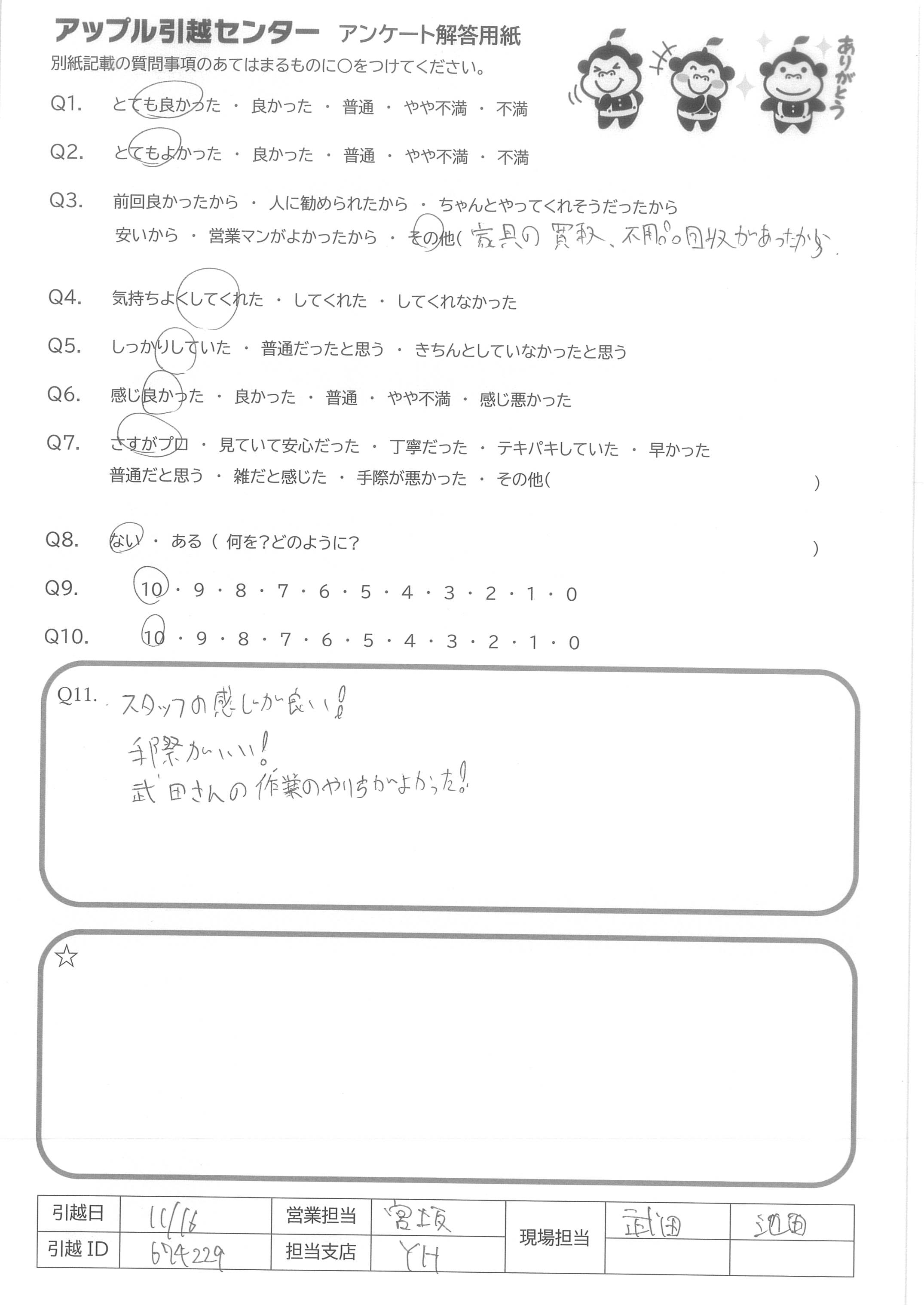 A.荷物準備の軽微な所を一緒に手伝ってくれた。 荷物配置についてもアドバイス相談に乗ってくれた。 各種作業がテキパキしており汚い家の中でも的確に引っ越しが進んだ。