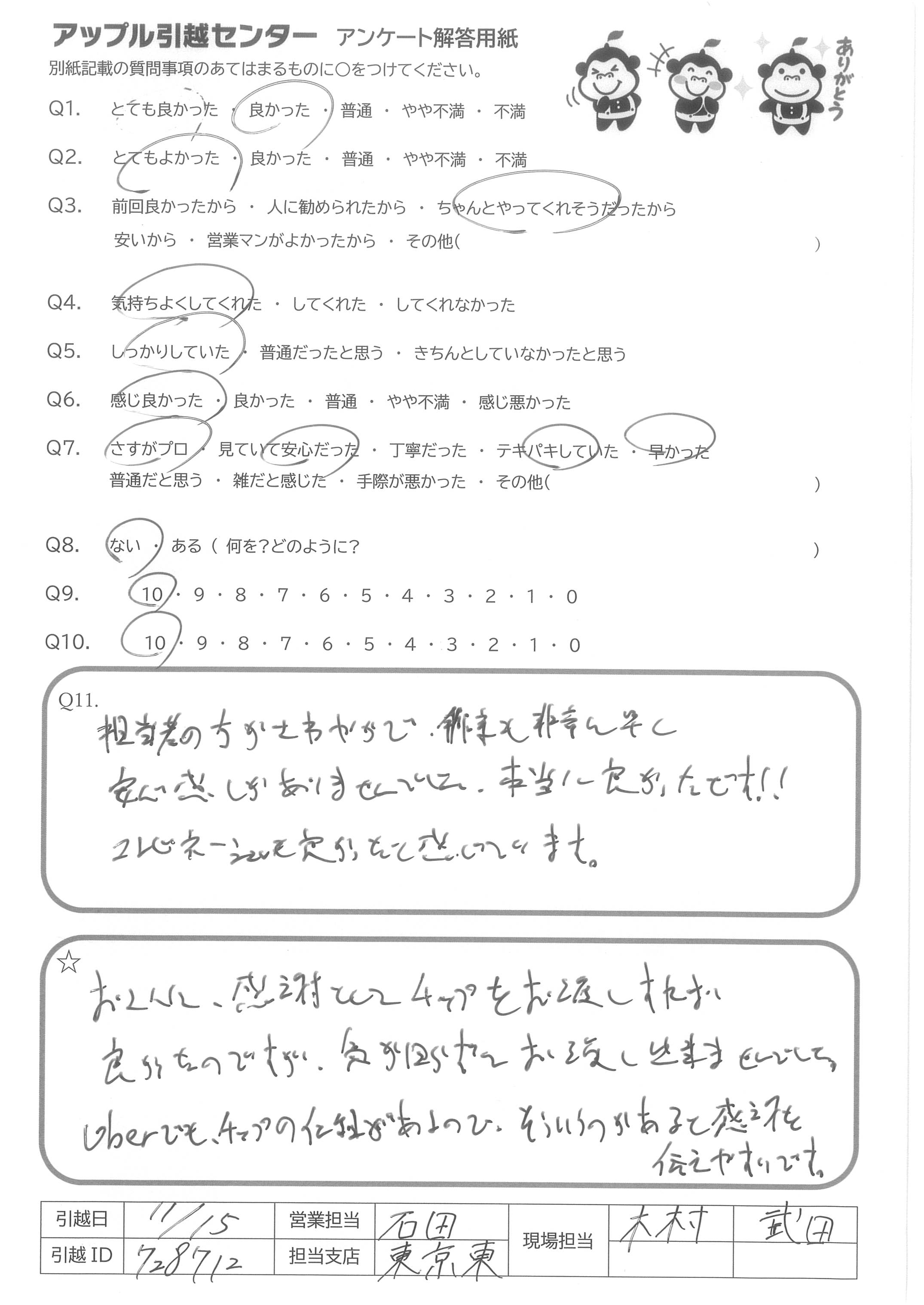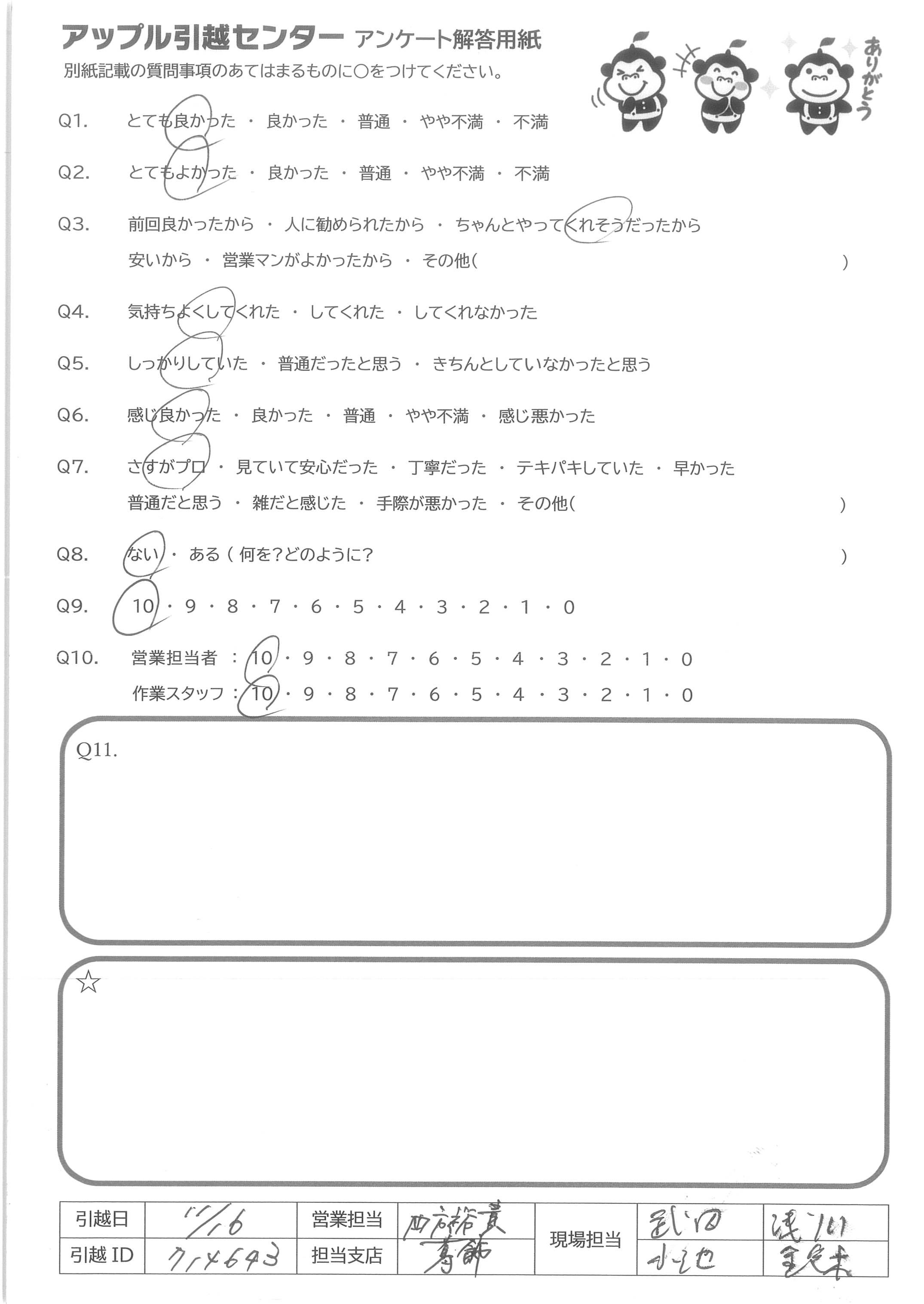 A.ありがとうございました! アップル引越しセンターを選んで 大正解でした!