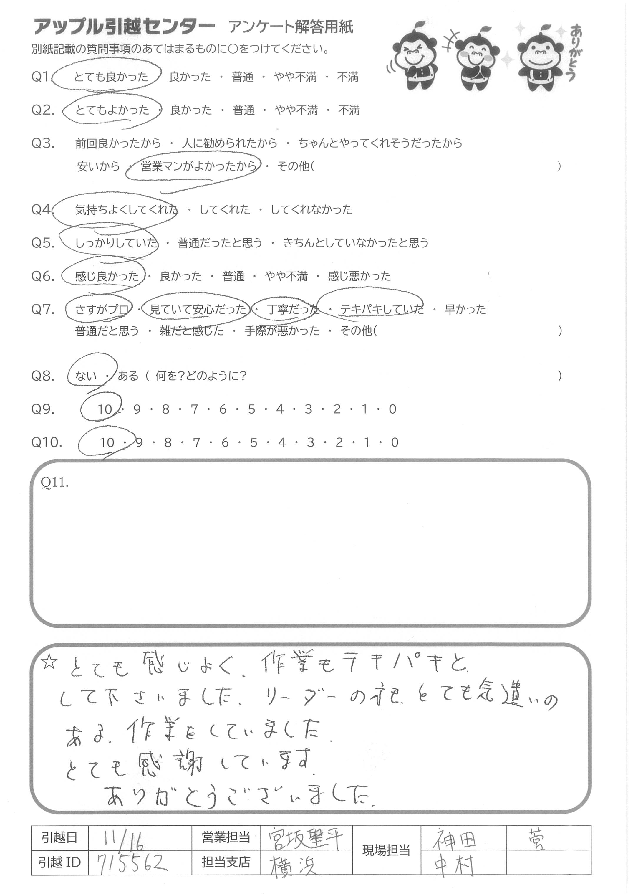 A.とても気持ちよく引っ越しができました。ありがとうございました。