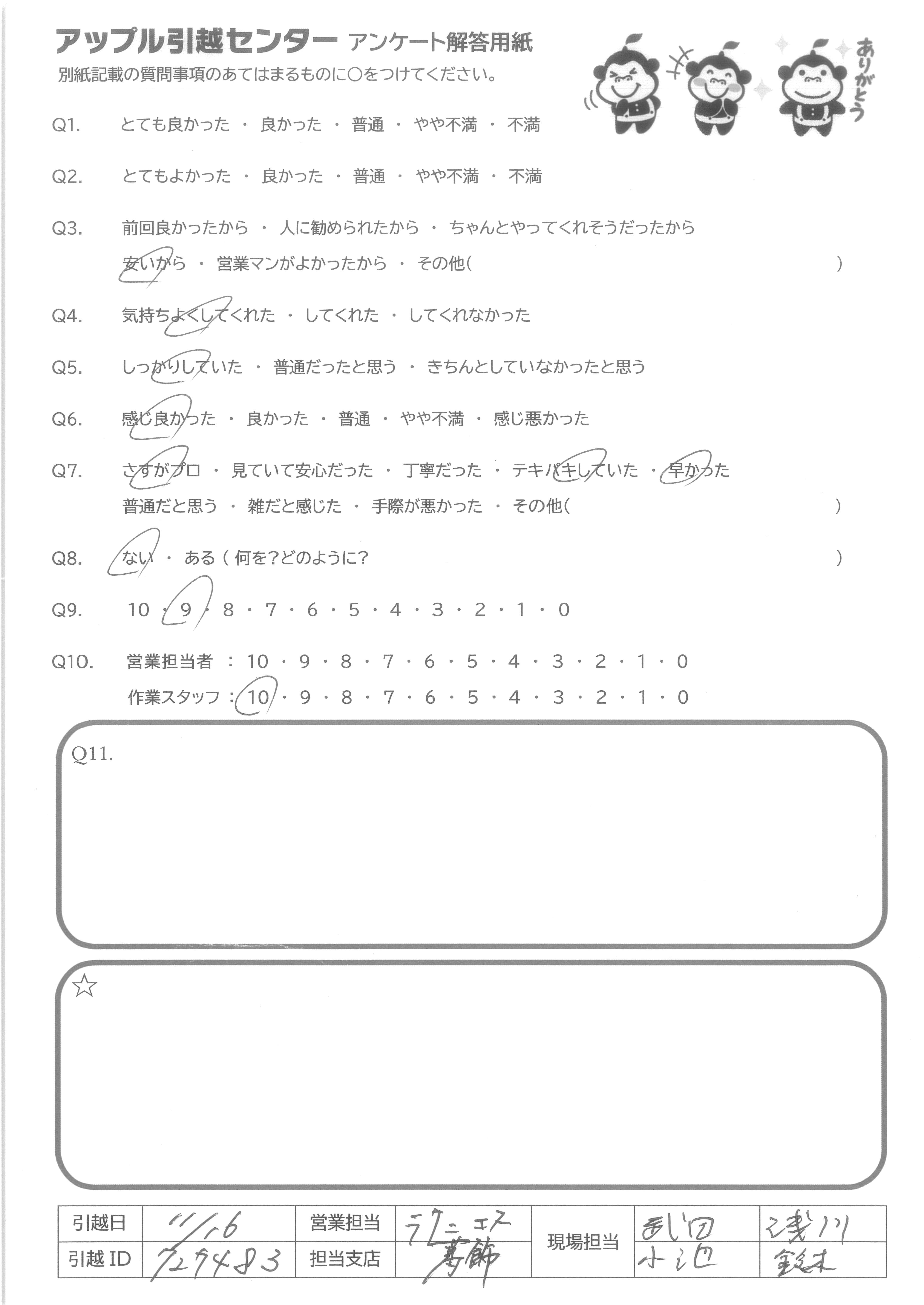 A.初めての引っ越しでしたがアップルさんに頼んでよかったです。荷物詰めも多くて嫌になってきた時もダンボールのキャラクターに励まされました、ありがとうございました お世話になりました。