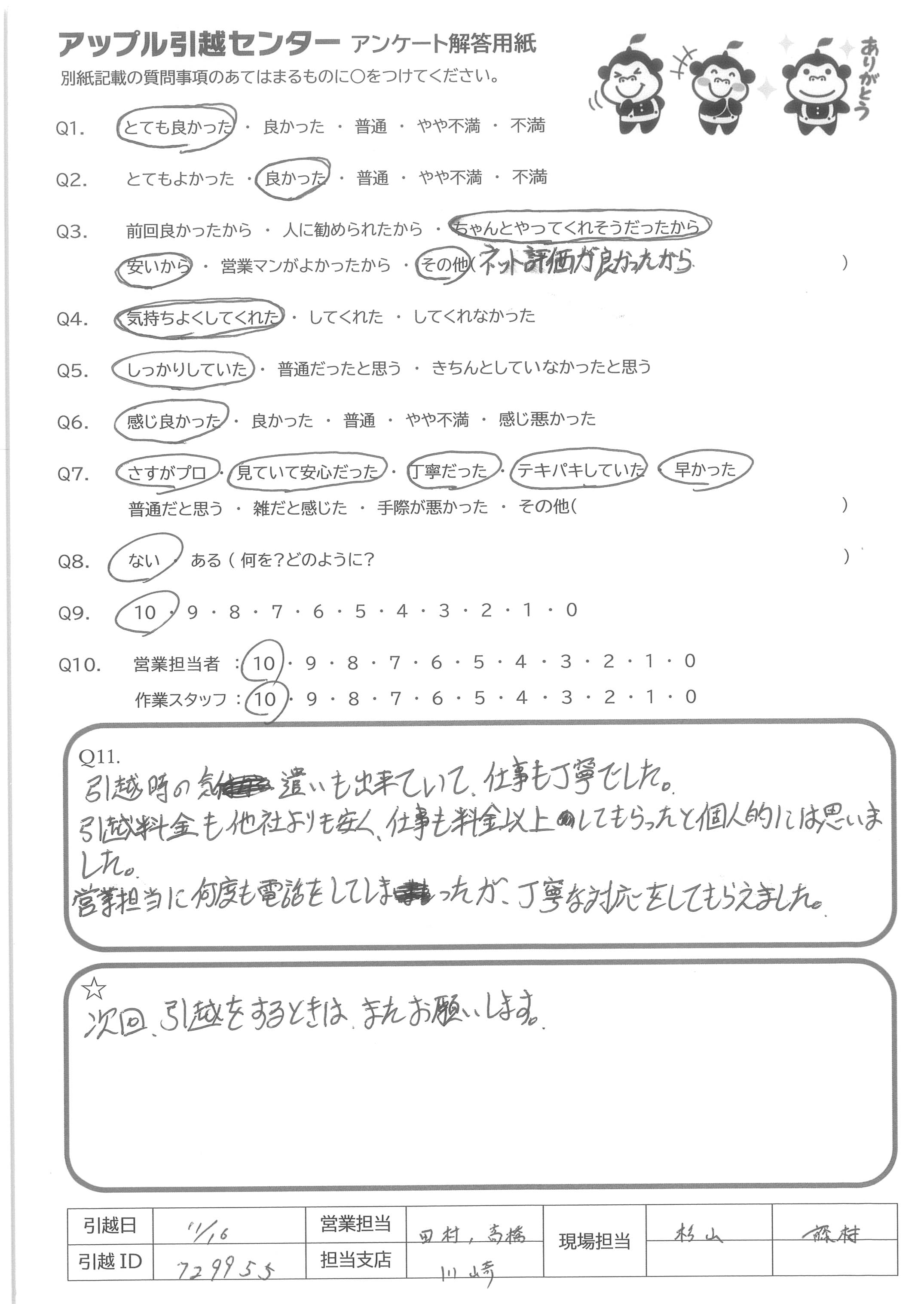 A.今回2回目の利用ですが、前回同様のクオリティで感謝してます。 貴社が引っ越し業者では、コスパ最高であると思われる事は機会があるたびに、周りにも伝えてますので、今後ともよろしくお願い致します。