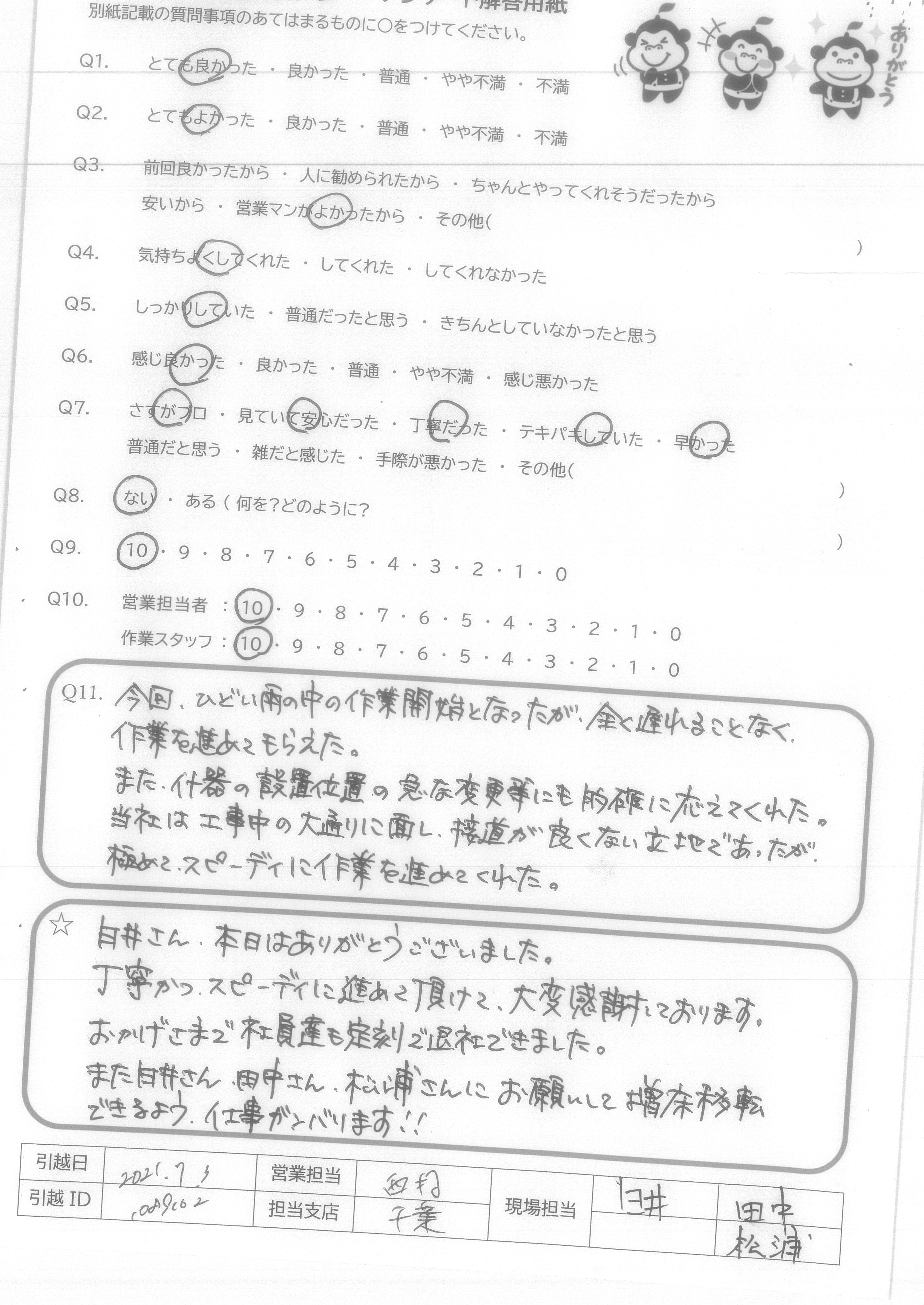 A.白井さん、本日はありがとうございました。 丁寧かつ、スピーディに進めて頂けて、大変感謝しております。 おかげさまで社員達も定刻で退社できました。 また白井さん、田中さん、松浦さんにお願いして増床移転できるよう仕事ガンバります!!
