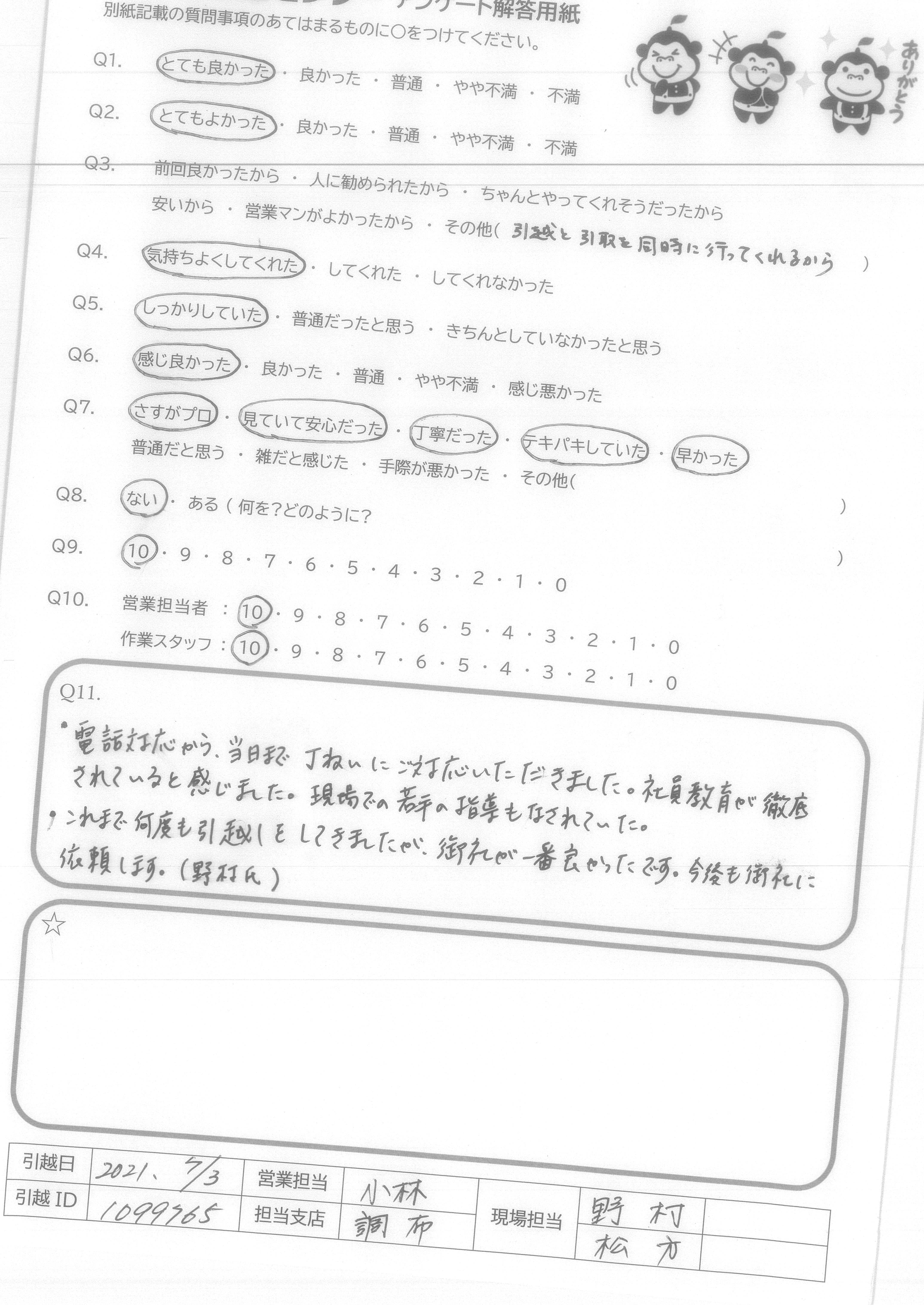 A.・電話対応から、当日まで丁ねいにご対応いただきました。社員教育が徹底されていると感じました。現場での若手の指導もなされていた。 ・これまで何度も引越しをしてきましたが、御社が一番良かったです。今後も御社に依頼します。(野村氏)