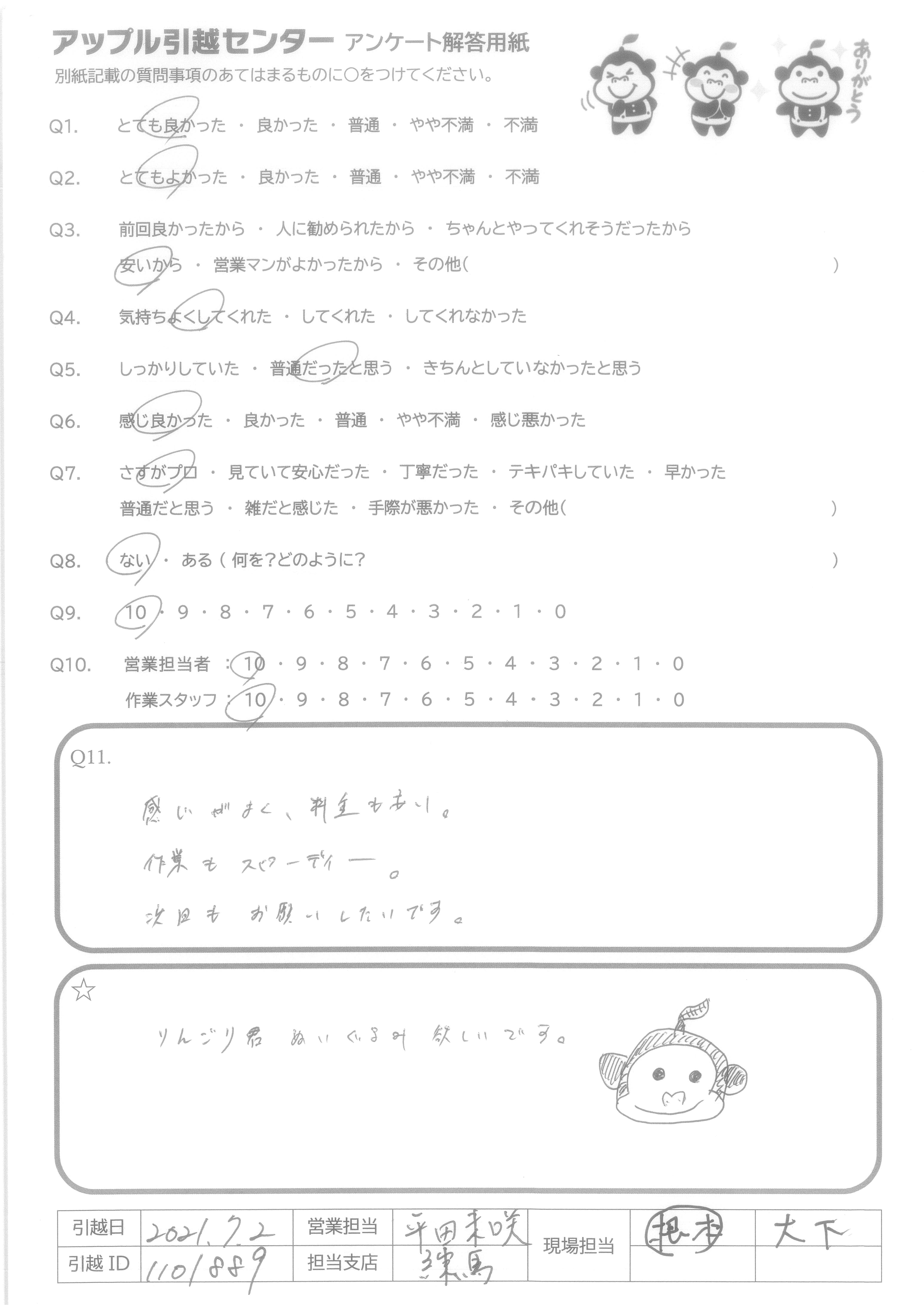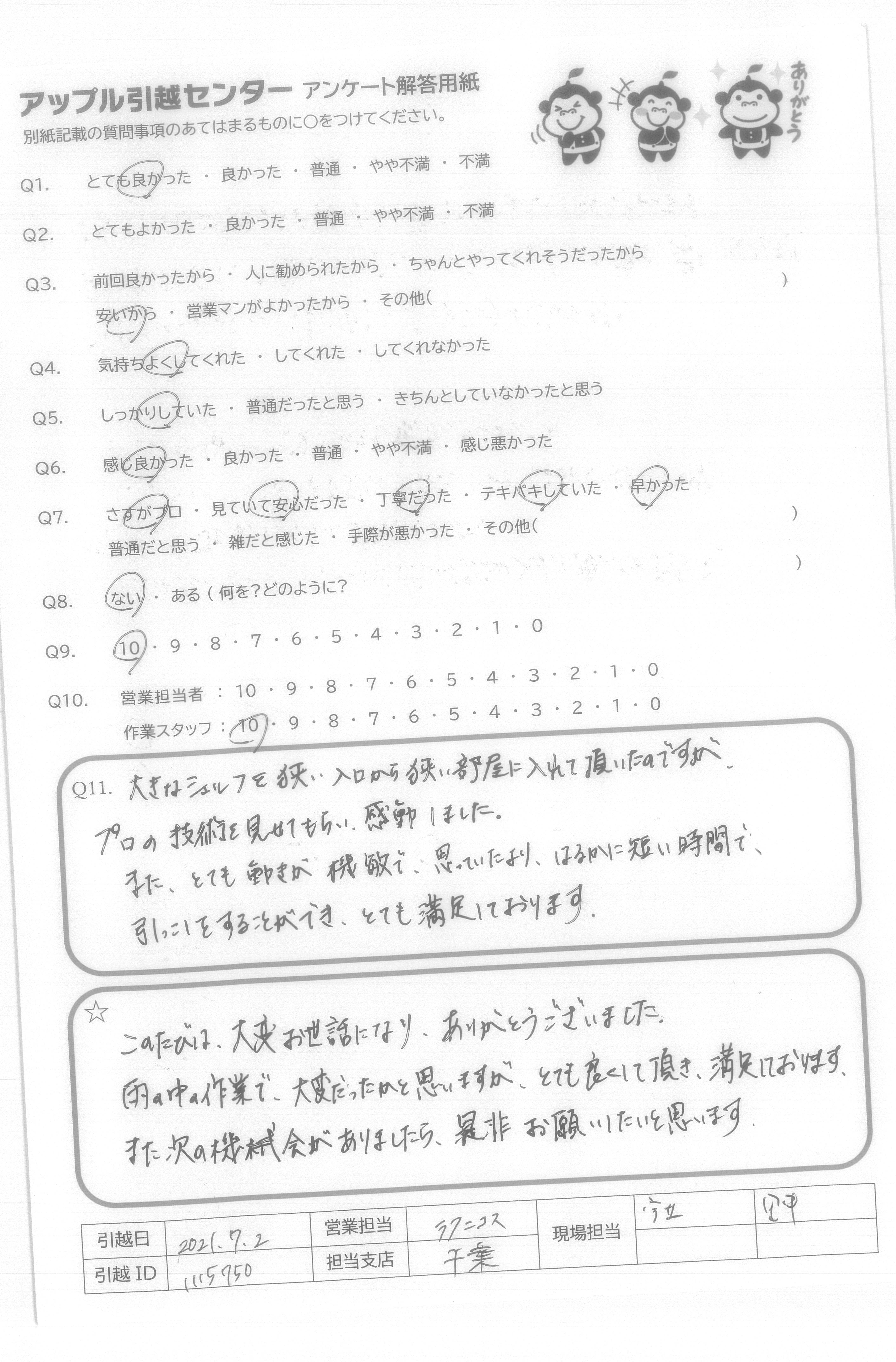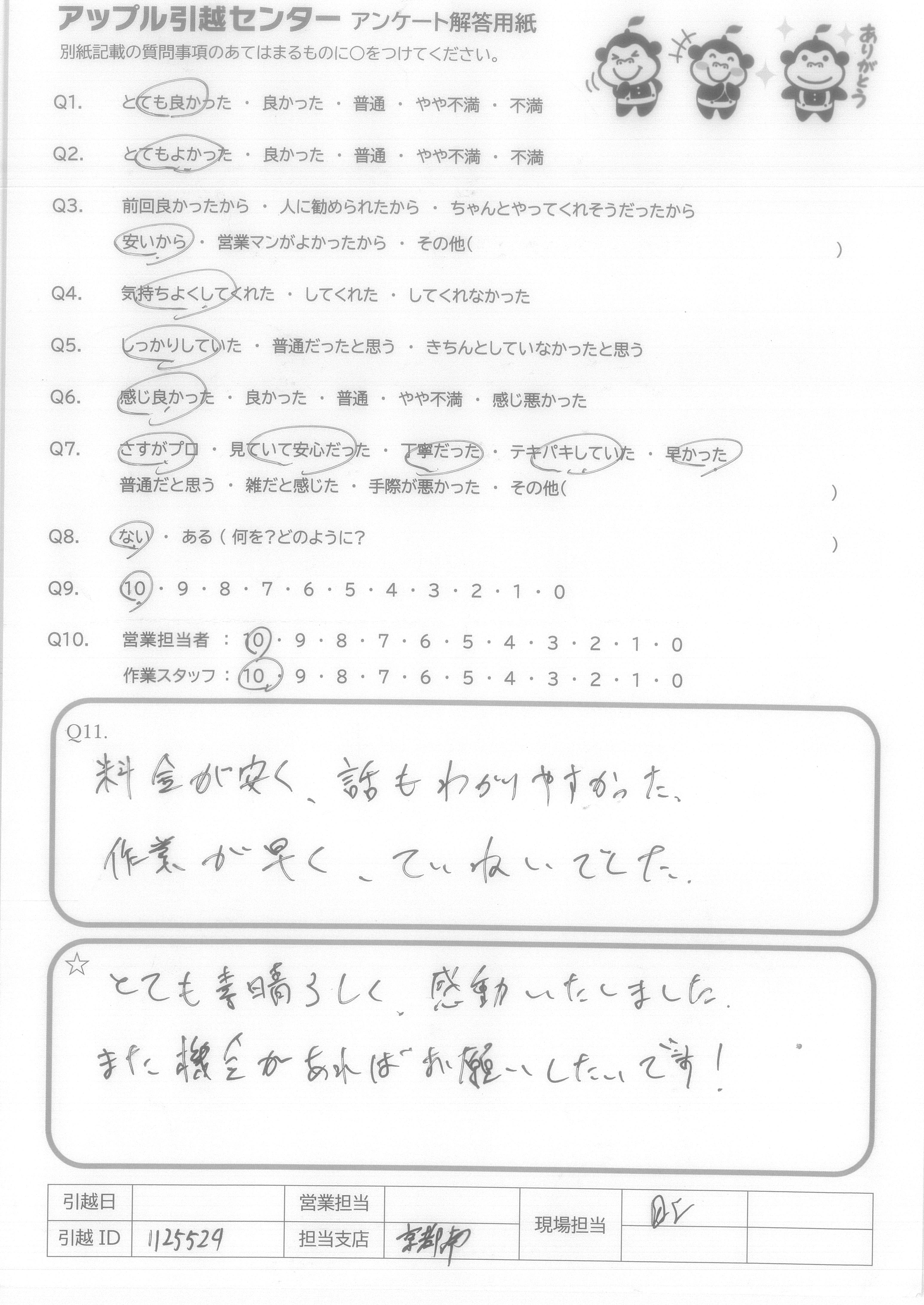 A.とても親切、親身にご対応いただきありがとうございました! 次回、また周りの方の引越の際に引き続きよろしくお願い致します。