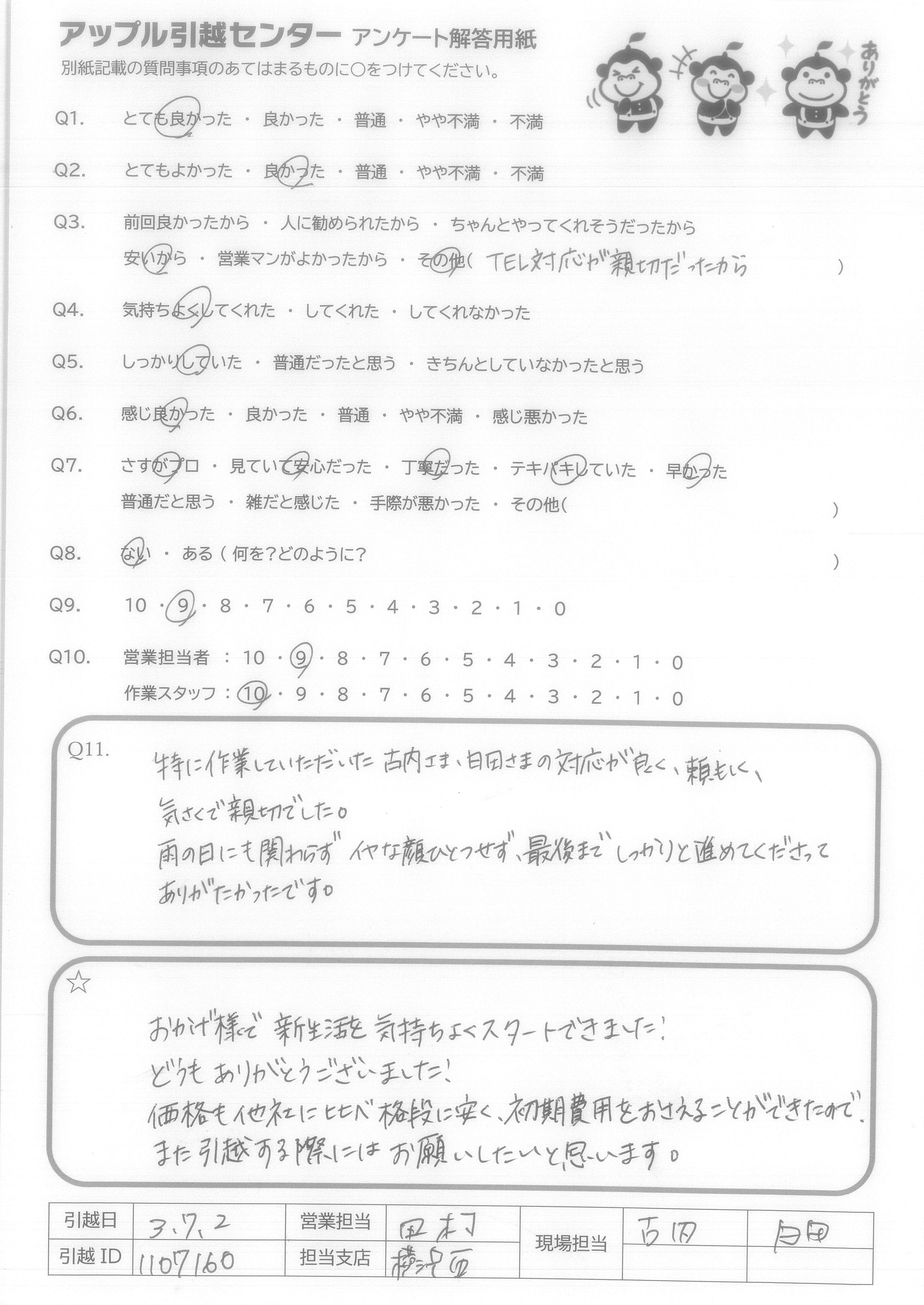 A.>電話の受付者 今回はメールで事前にやりとりをさせていただきましたが、初回の見積への返信、および追加で依頼した引取物の見積への返信が迅速で、安心出来ました。 >作業スタッフ 当初よりも荷物量が増えてしまっていたのですが、担当者の方には大抵の荷物に養生をした状態で、テキパキと運んでいただき、短時間で荷出しと荷入れが完了しました。 荷入れ後の電化製品の確認(洗濯機、冷蔵庫、電子レンジ)もしっかりとご対応いただき、おかげさまで引っ越し後の新生活もスムーズに行えています。