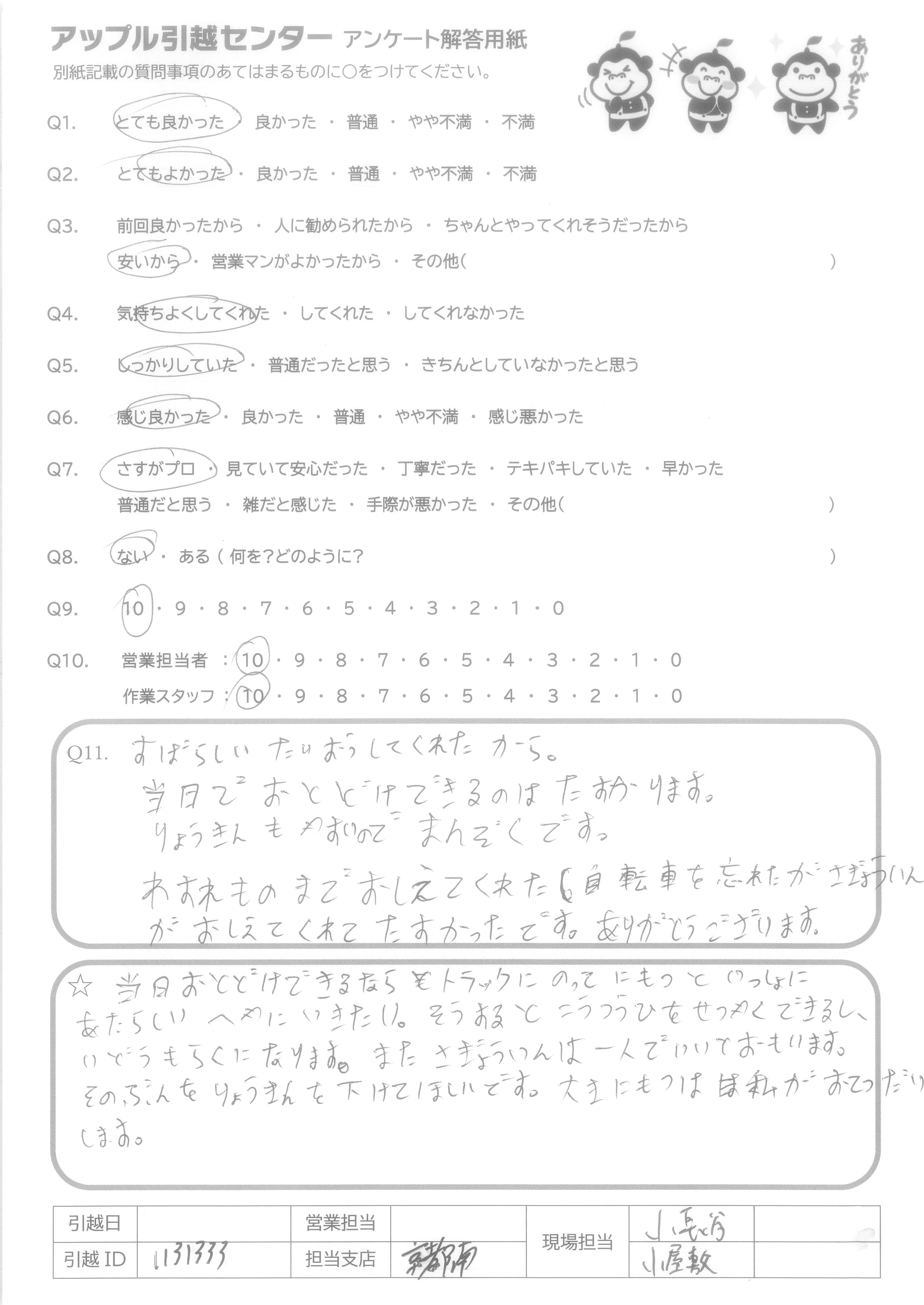 A.すばらしいたいおうしてくれたから。 当日でおとどけできるのはたすかります。 りょうきんもやすいのでまんぞくです。 わすれものまでおしえてくれた(自転車を忘れたがさぎょういんがおしえてくれてたすかったです。ありがとうございます。