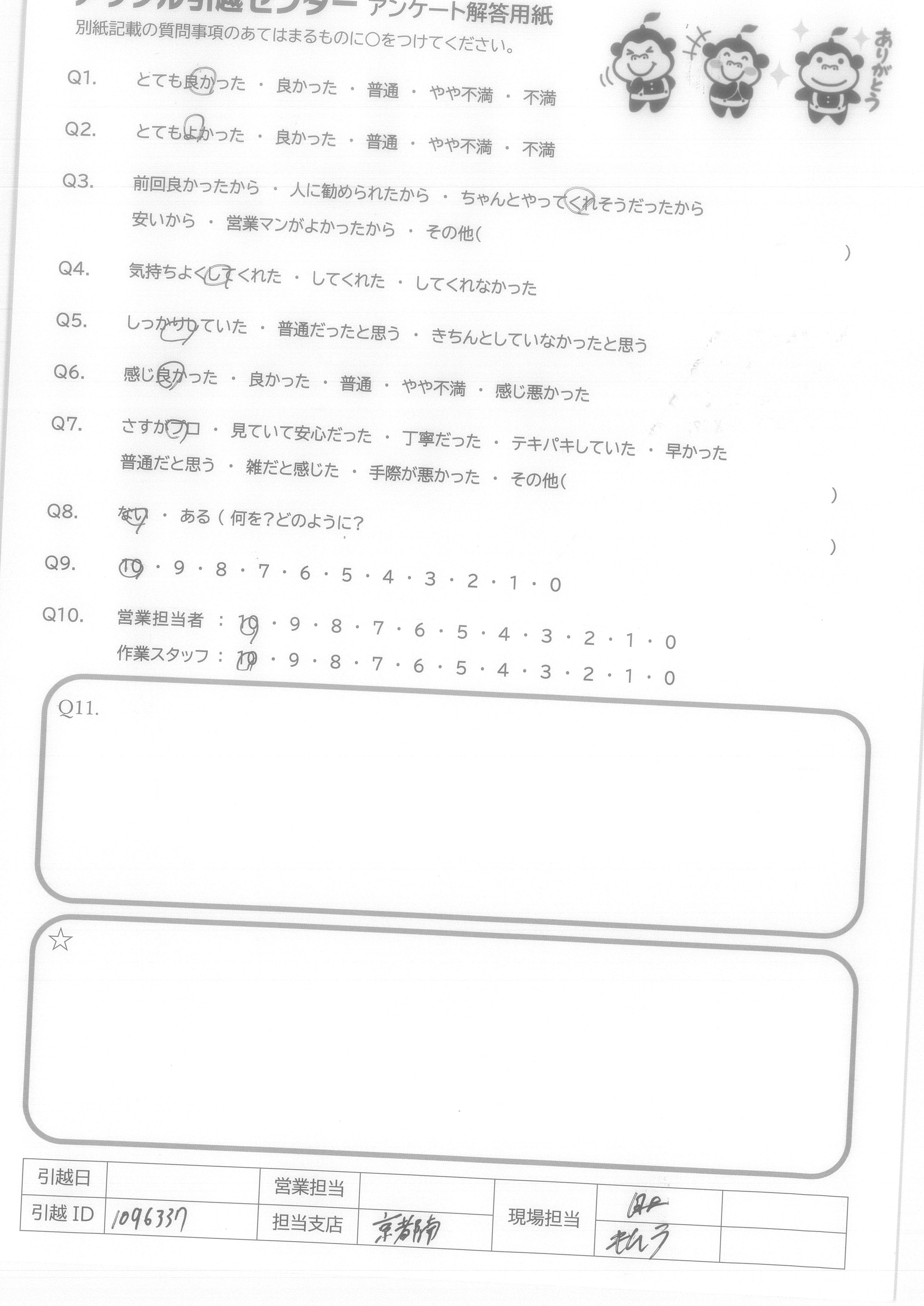 A.作業をテキパキと丁寧で任せて安心できると思いました。 何をどれくらいの量になるかなど、移動先に置くスペースも考えながら、適宜報告確認をしながらとてもスピーディーに運んで頂きました。是非友人家族には紹介したいです。 (すでにURLを送るなど何人か紹介しました!)ありがとうございました。