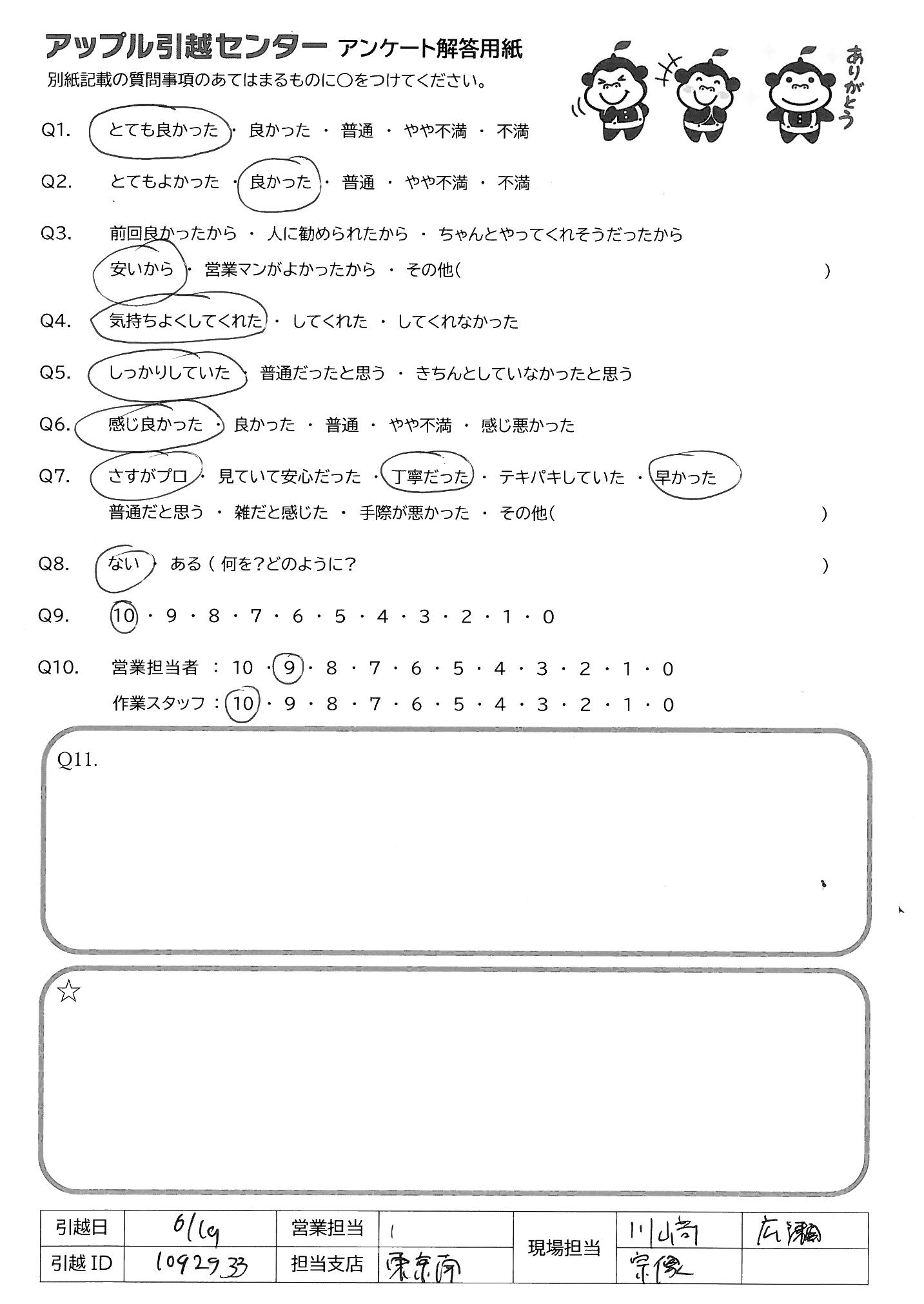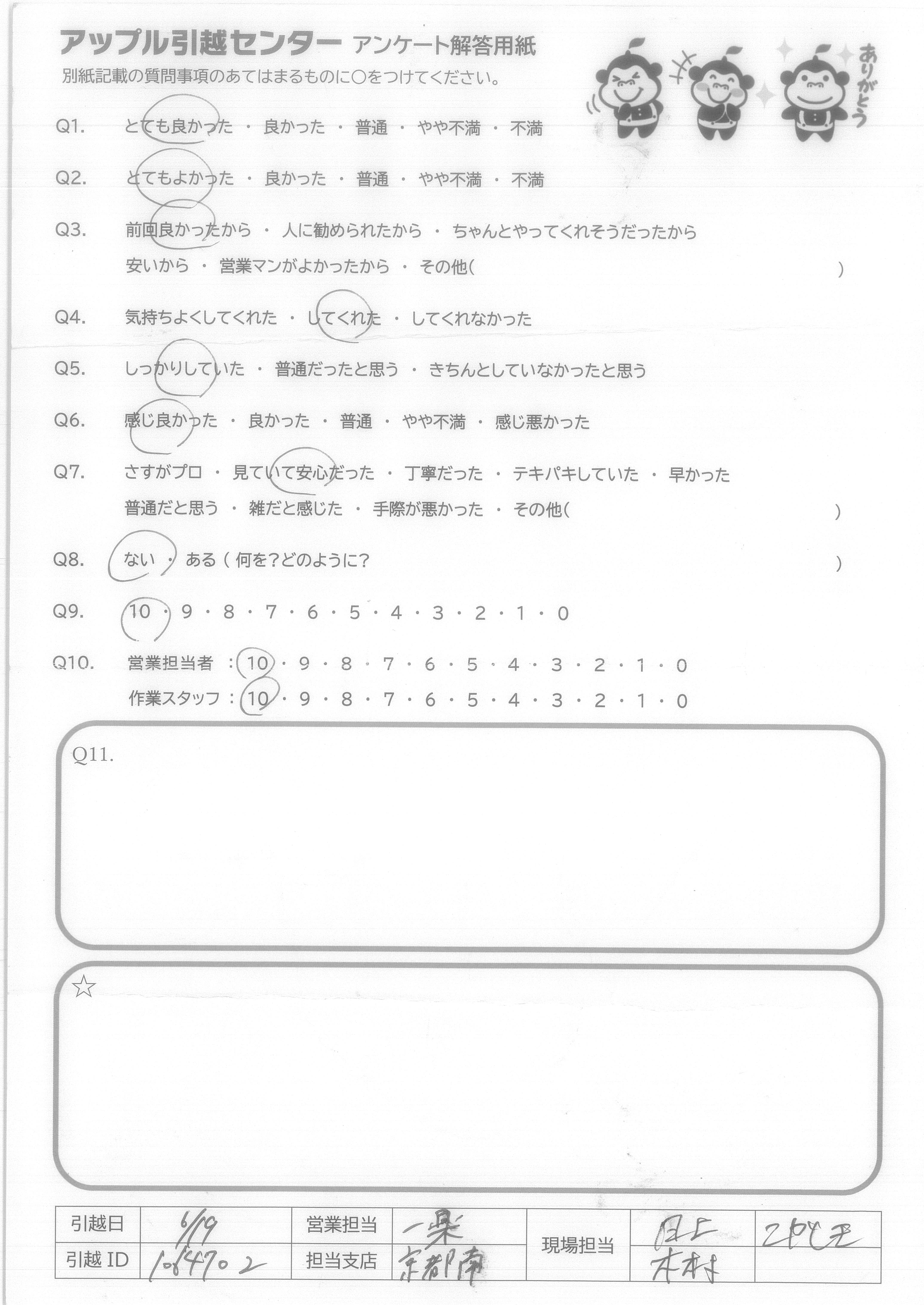 A.想像を遥かに超えた素晴らしい引越でした。今後も引越があればぜひまたよろしくお願いします。