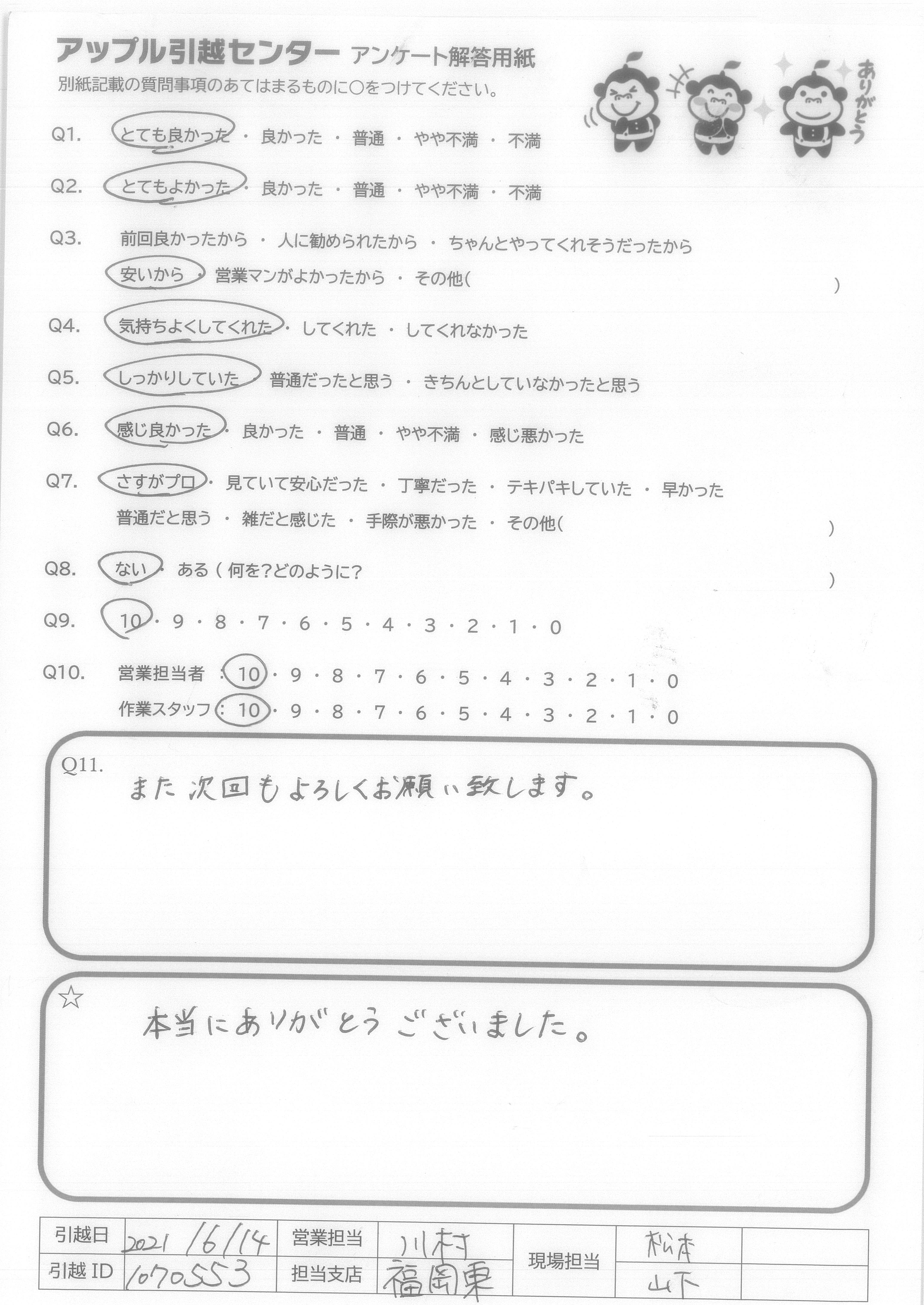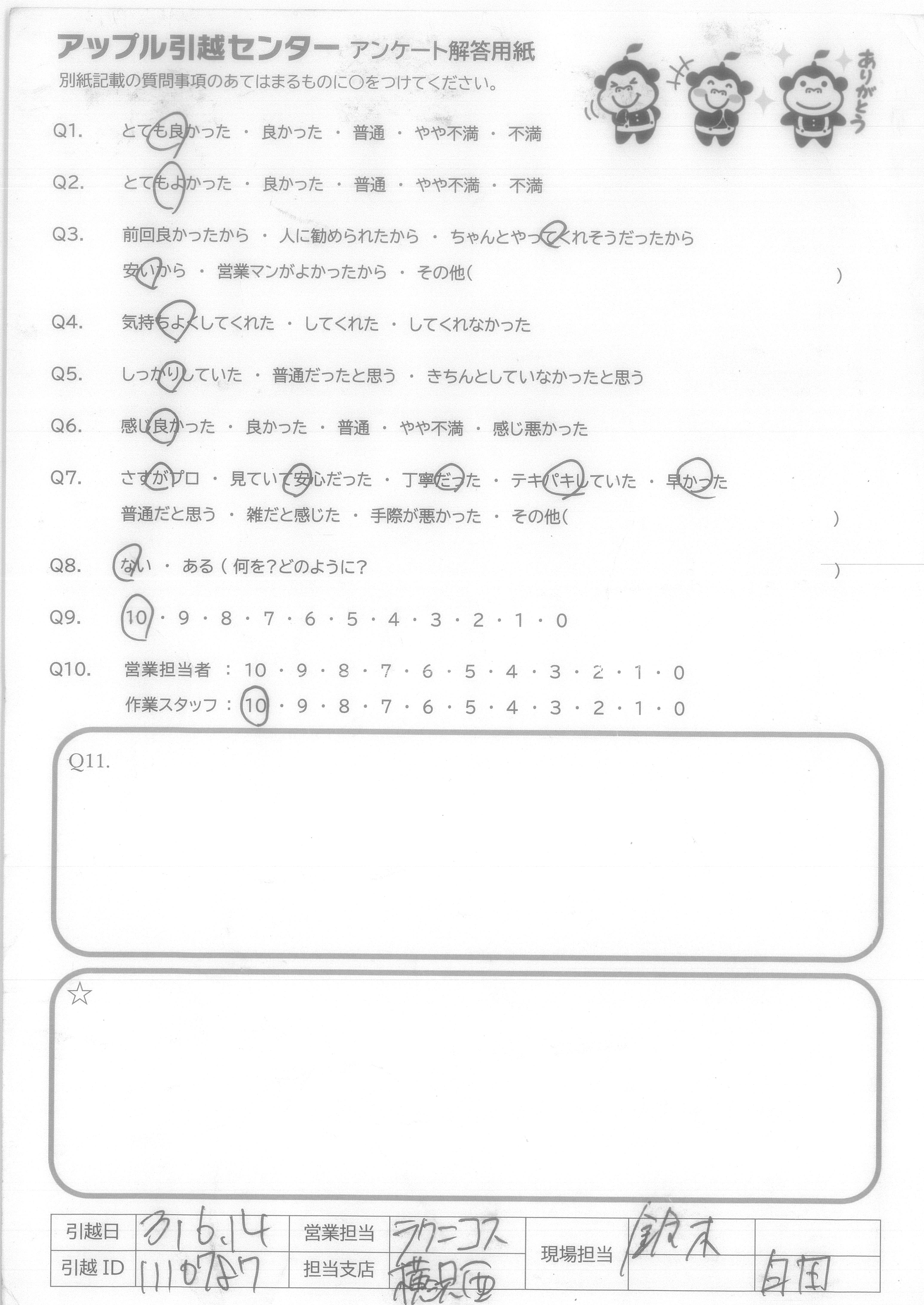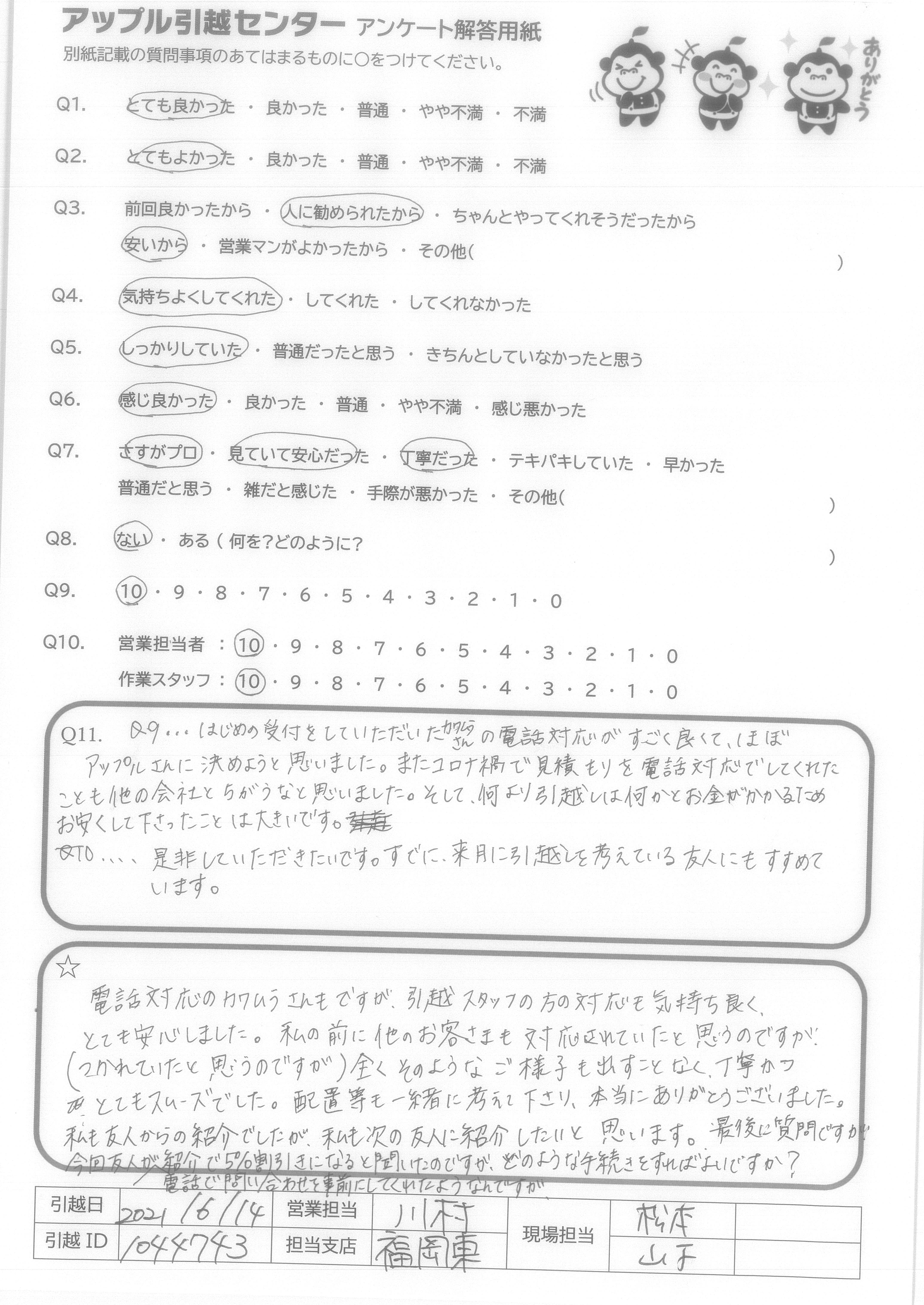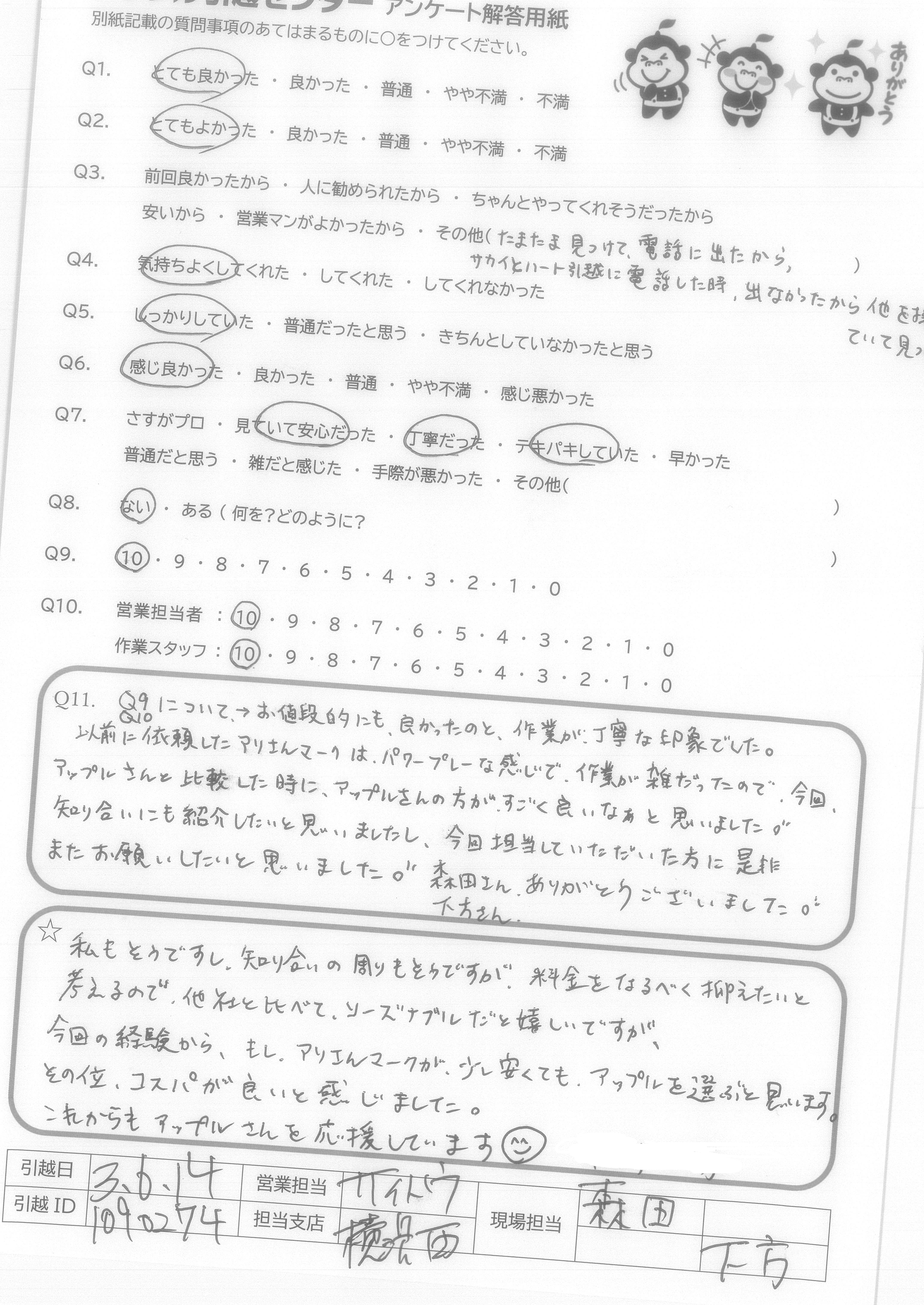 A.Q9・・・はじめの受付をしていただいたカワムラさんの電話対応がすごく良くて、ほぼアップルさんに決めようと思いました。そして、何より引越しは何かとお金がかかるためお安くして下さったことは大きいです。 Q10・・・是非していただきたいです。すぐに、来月に引越しを考えている友人にもすすめています。
