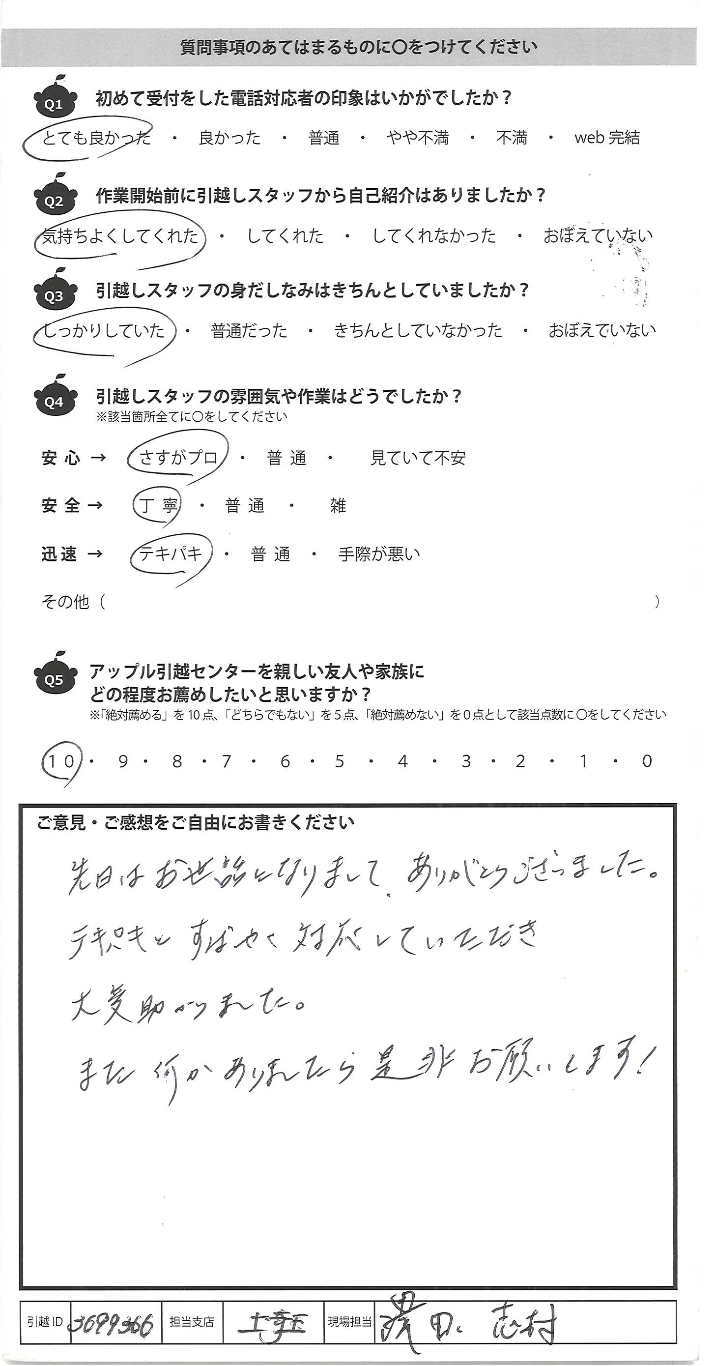 A.千原さんはじめとするスタッフの皆さんの手際の良さ、、礼儀 正しさには頭が下がりました。 皆さんムダのない動きであっという間に完了して、まさに 風のようでした。親切、ていねい、礼儀正しい皆さんで した。本当にありがとうございました。 遠方より来て下さり本当にありがとうございました。 感動的な引っ越しでした。 皆様これから寒い時期になります。ご自愛下さい。 これからも頑張って下さいね。