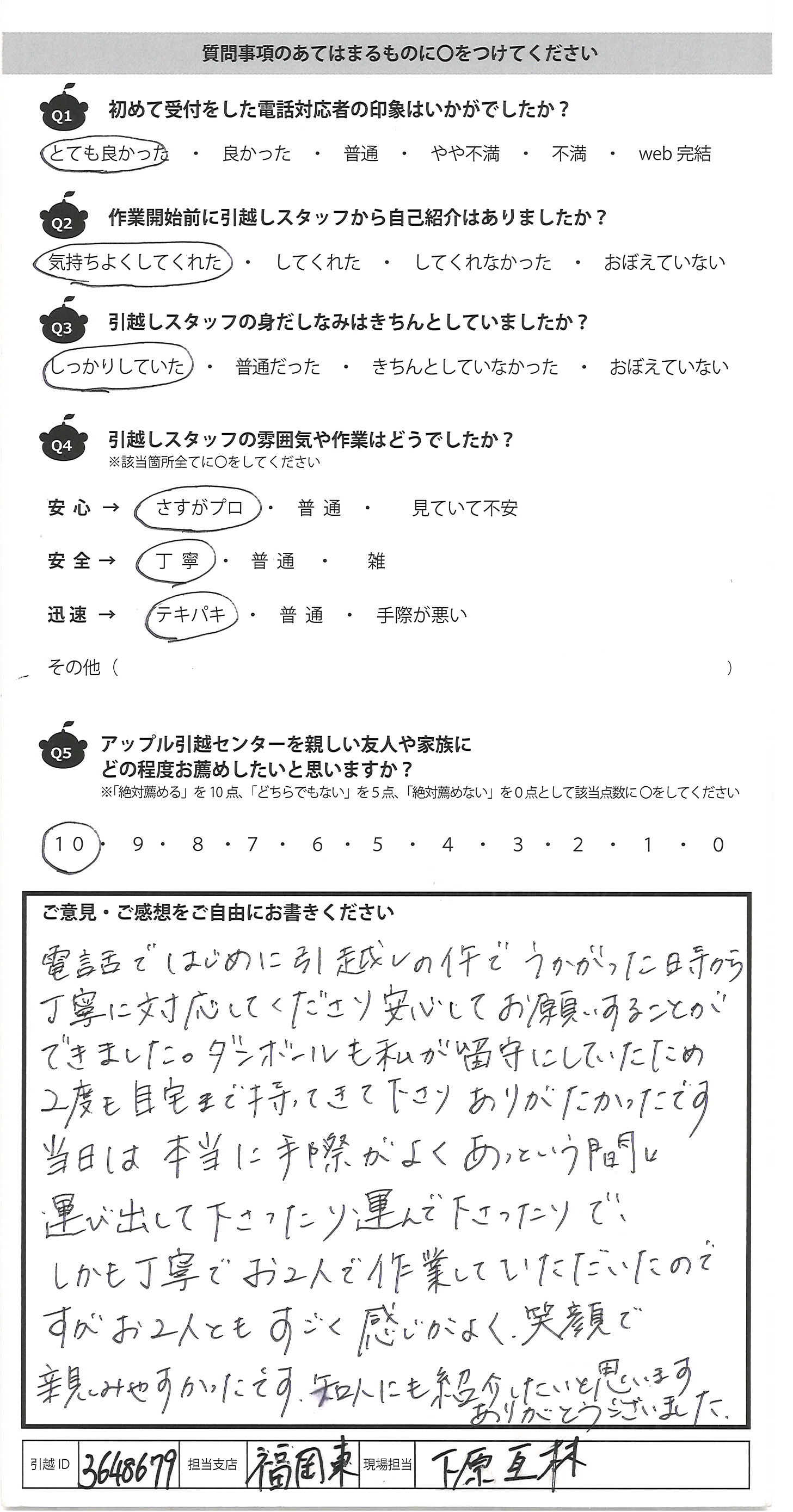 A.この度はありがとうございました。 安くて、早くてとても助かりました!! 作業も早くて、丁寧な対応で安心して おまかせすることができました。 また、次回引越する時や友人などにも 利用をすすめたいと思います。