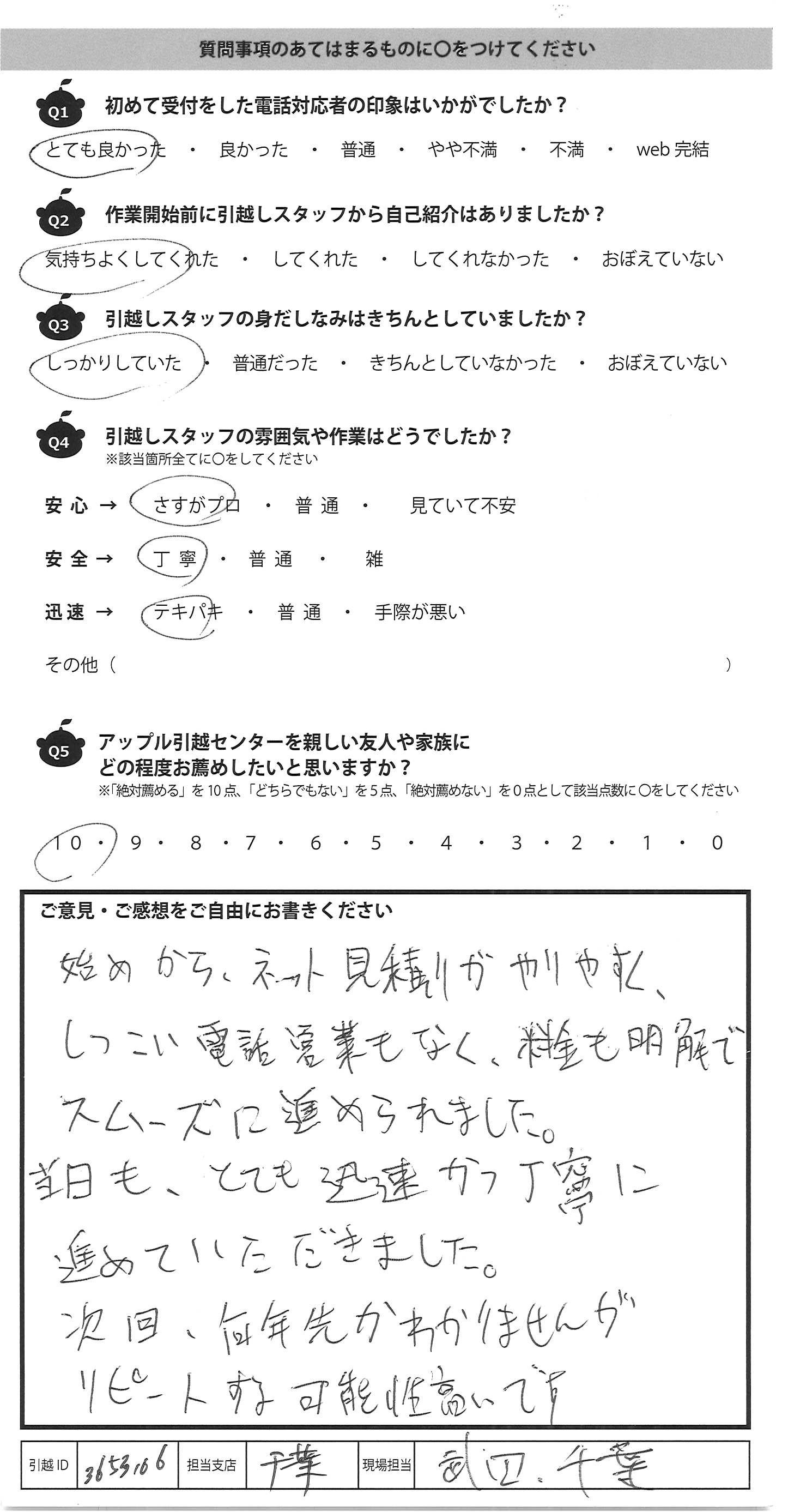 A.始めから、ネット見積りがやりやすく、 しつこい電話営業もなく、料金も明解で スムーズに進められました。 当日も、とても迅速かつ丁寧に 進めていただきました。 次回、何年先かわかりませんが リピートする可能性高いです
