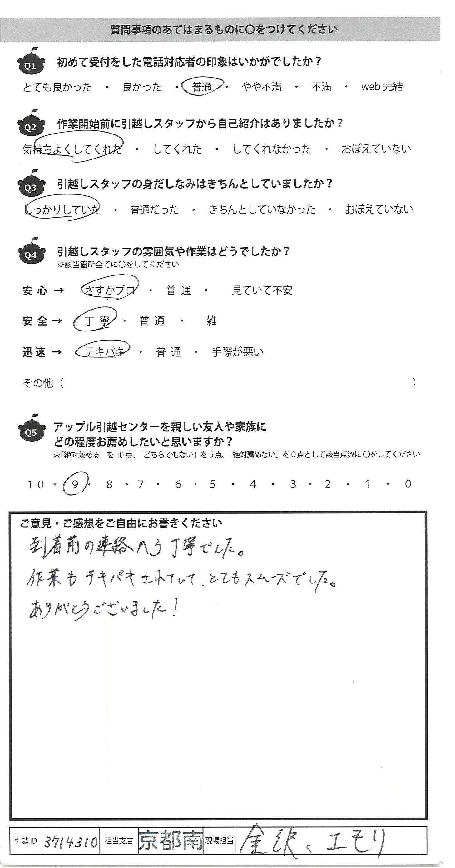 A.この度はご対応ありがとうございました。ご担当の2名様とても手際よく作業してくださいました。 また機会がありましたらよろしくお願いします。