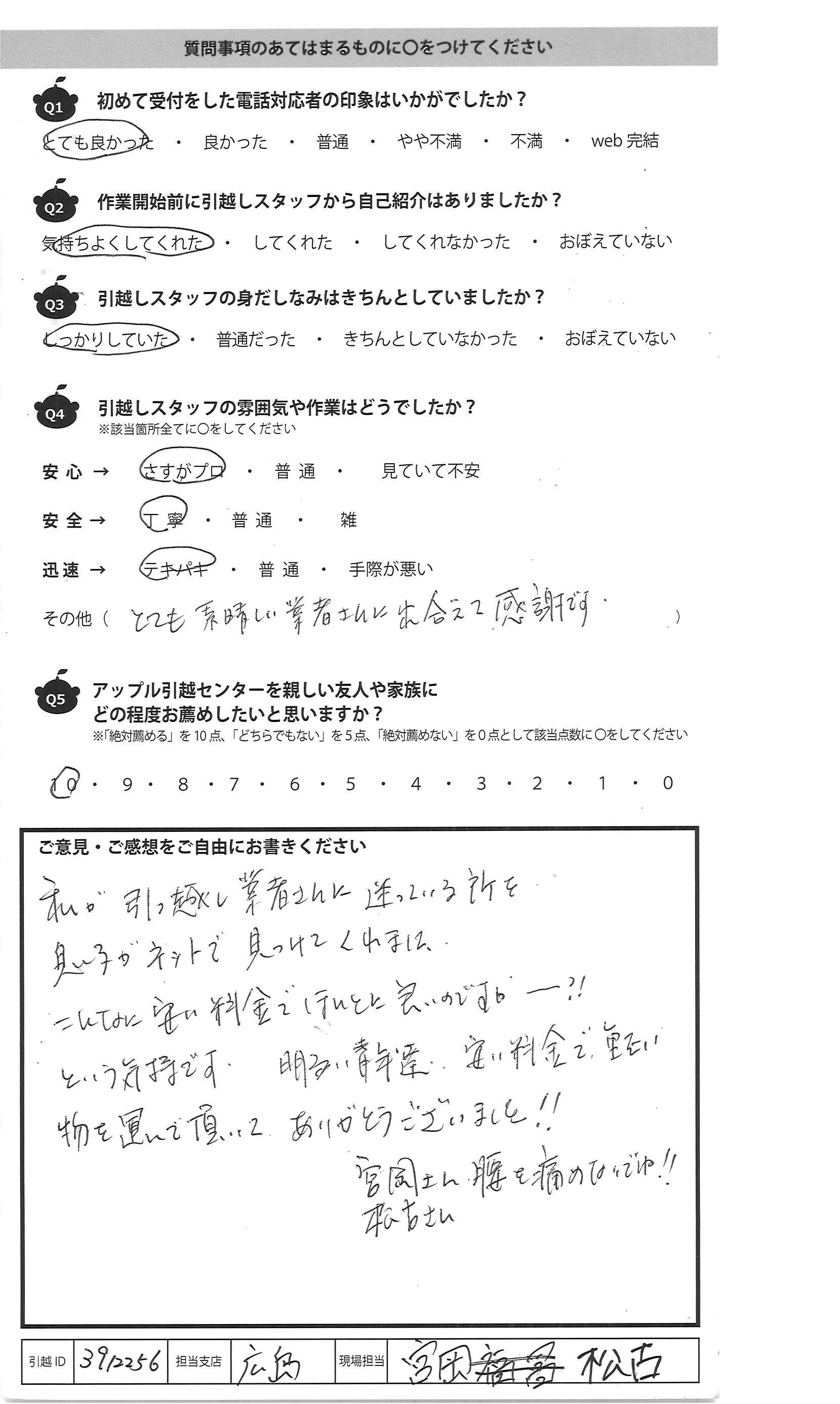 A.私が引っ越し業者さんに迷っている所を 息子がネットえ見つけてくれました。 こんなに安い料金でほんとに良いのですかー?! という気持です。明るい青年達、安い料金で重たい 物を運んで頂いてありがとうございました!! 宮岡さん松古さん腰を傷めないでね!!