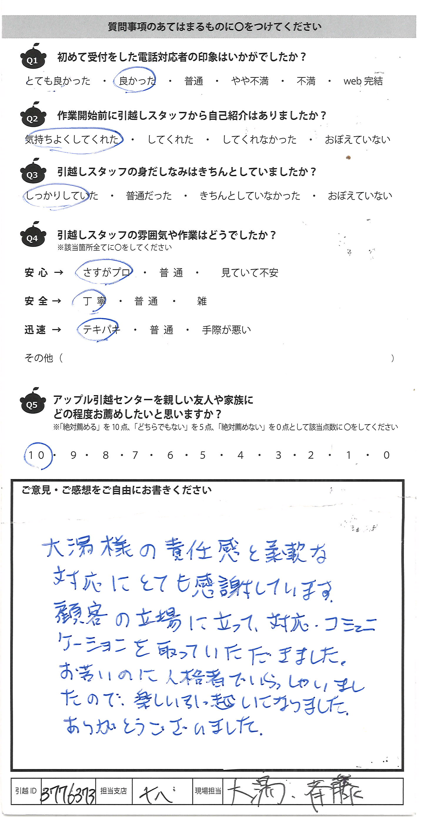 A.大湯様の責任感と柔軟な 対応にとても感謝しています。 顧客の立場に立って、対応、コミュニ ケーションを取っていただきました。 お若いのに人格者でいらっしゃいまし たので、楽しい引っ越しになりました。 ありがとうございました。