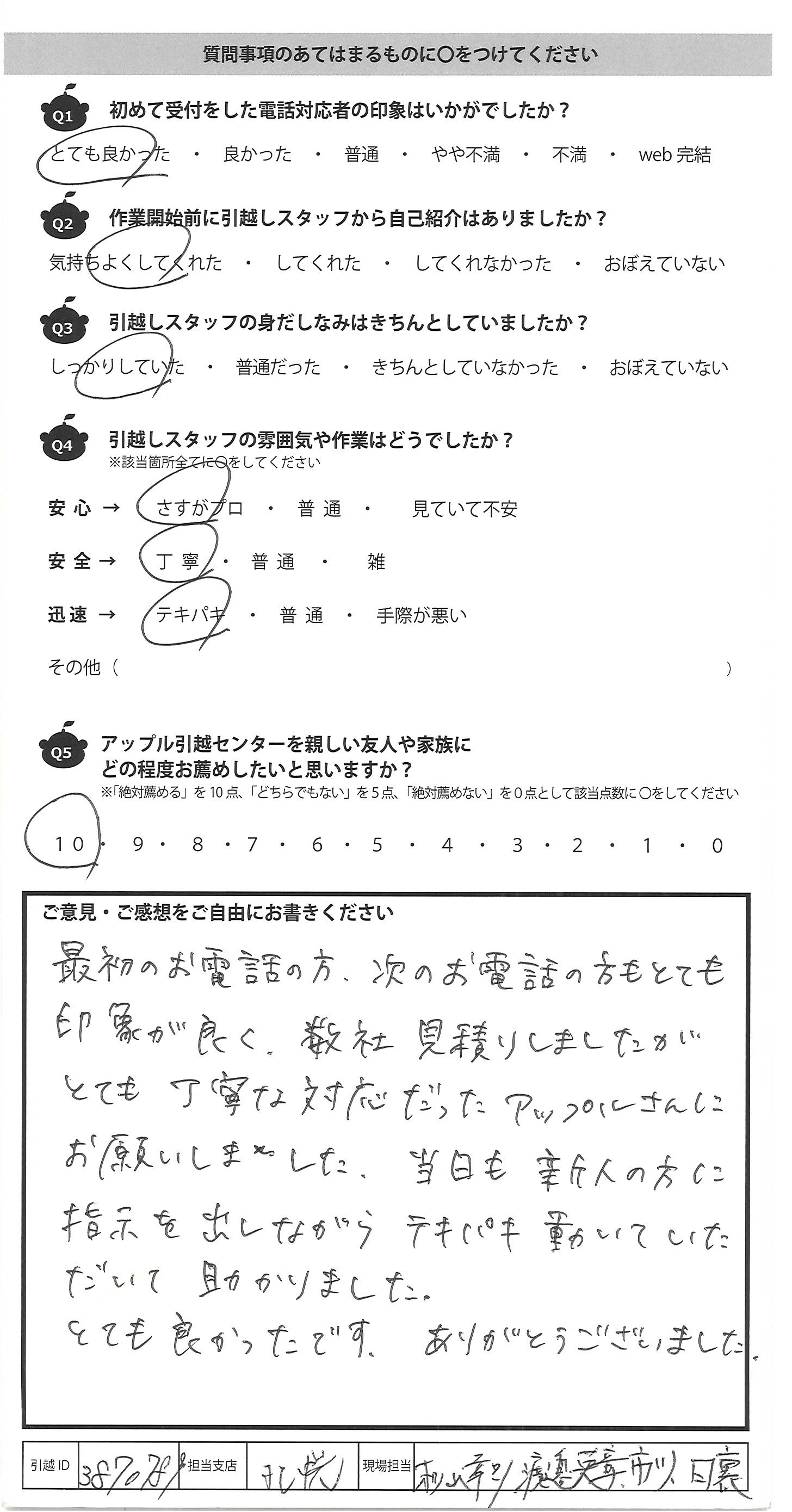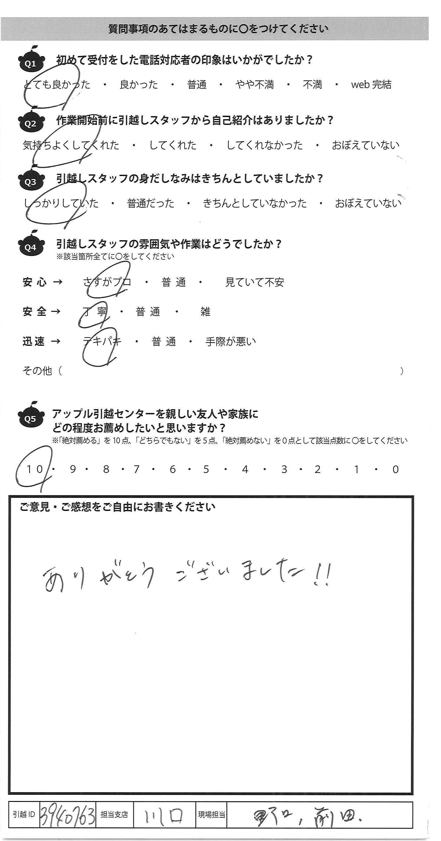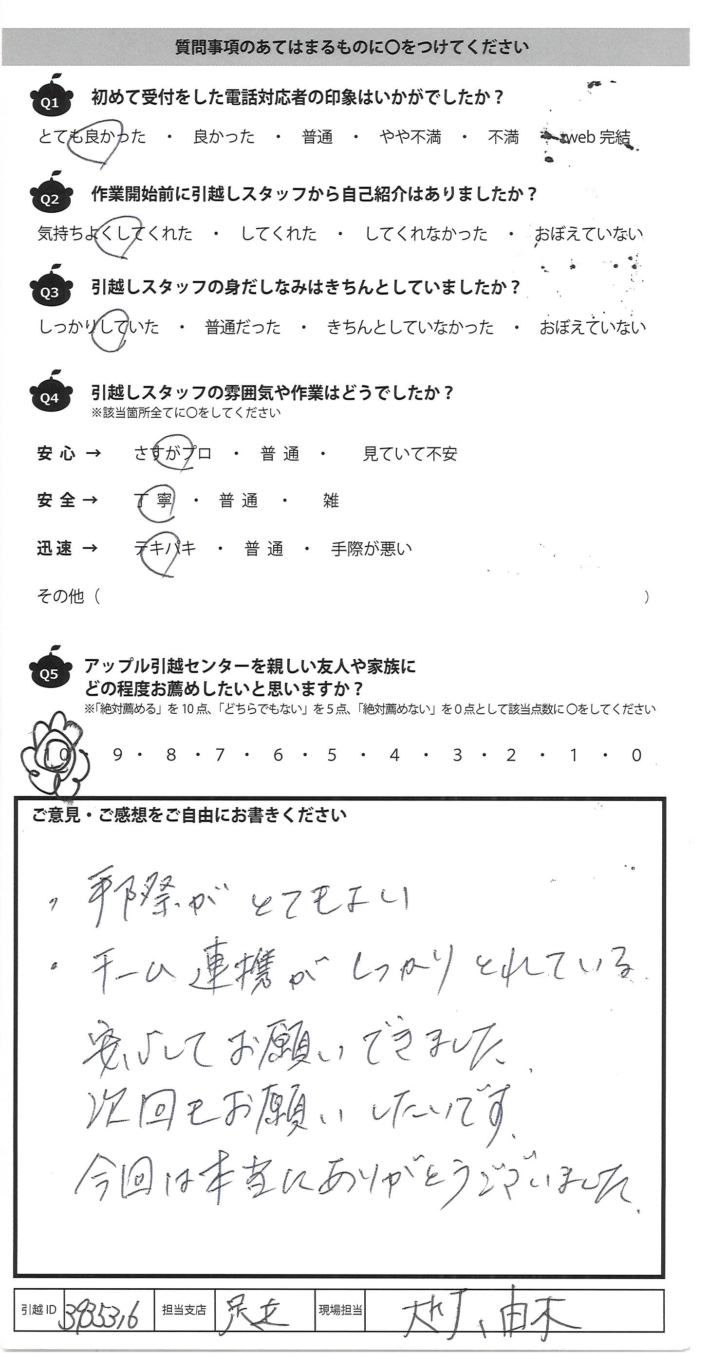 A.・手際がとてもよい ・チーム連携がしっかりとれている 安心してお願いできました。 次回もお願いしたいです。 今回は本当にありがとうございました。