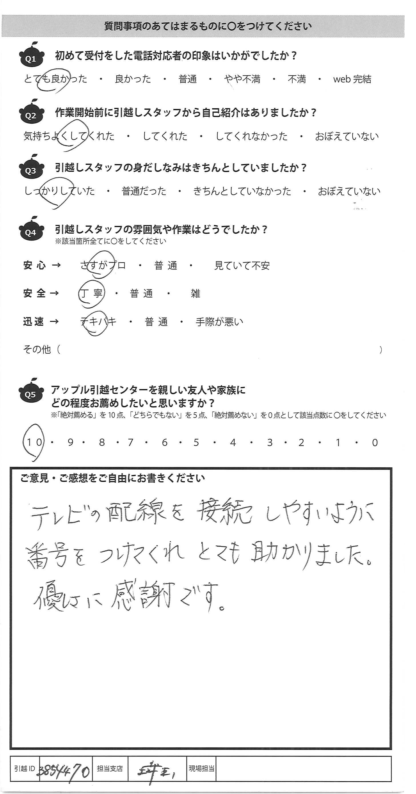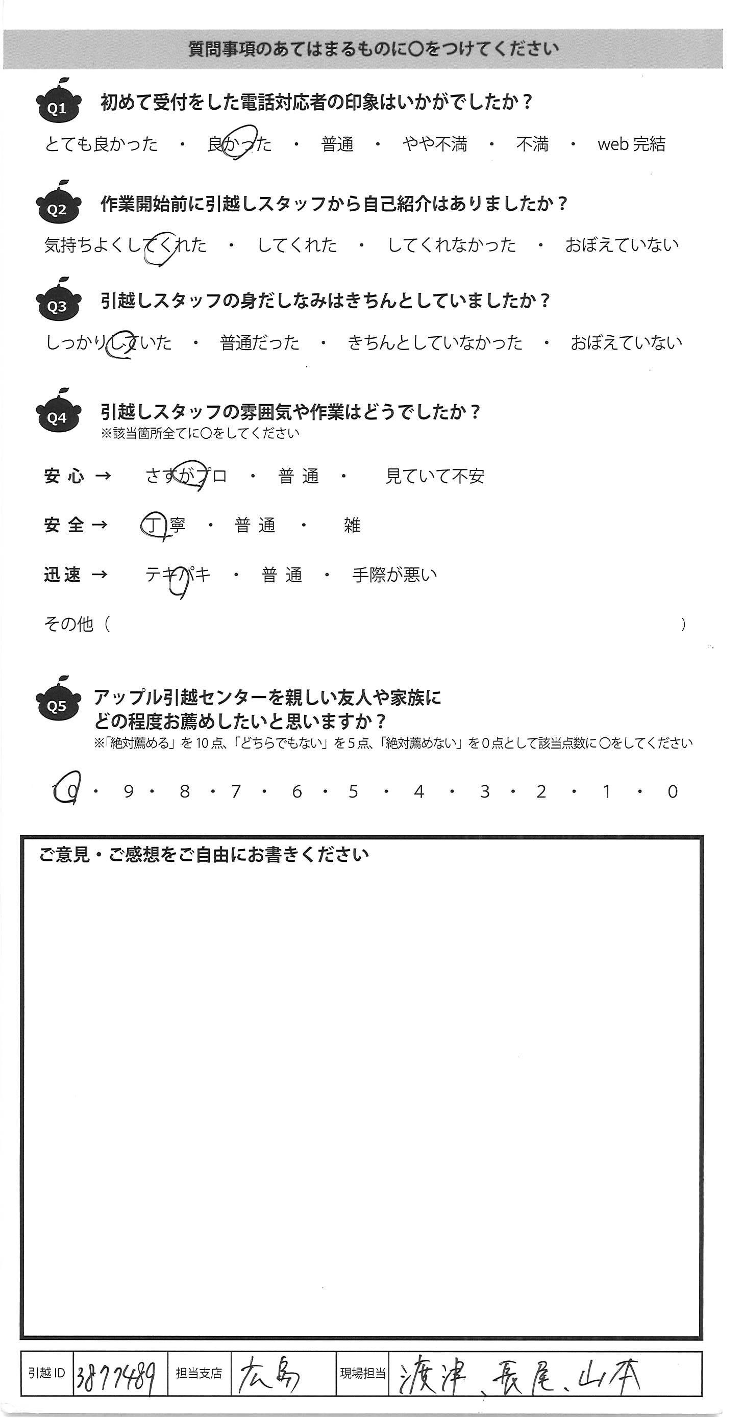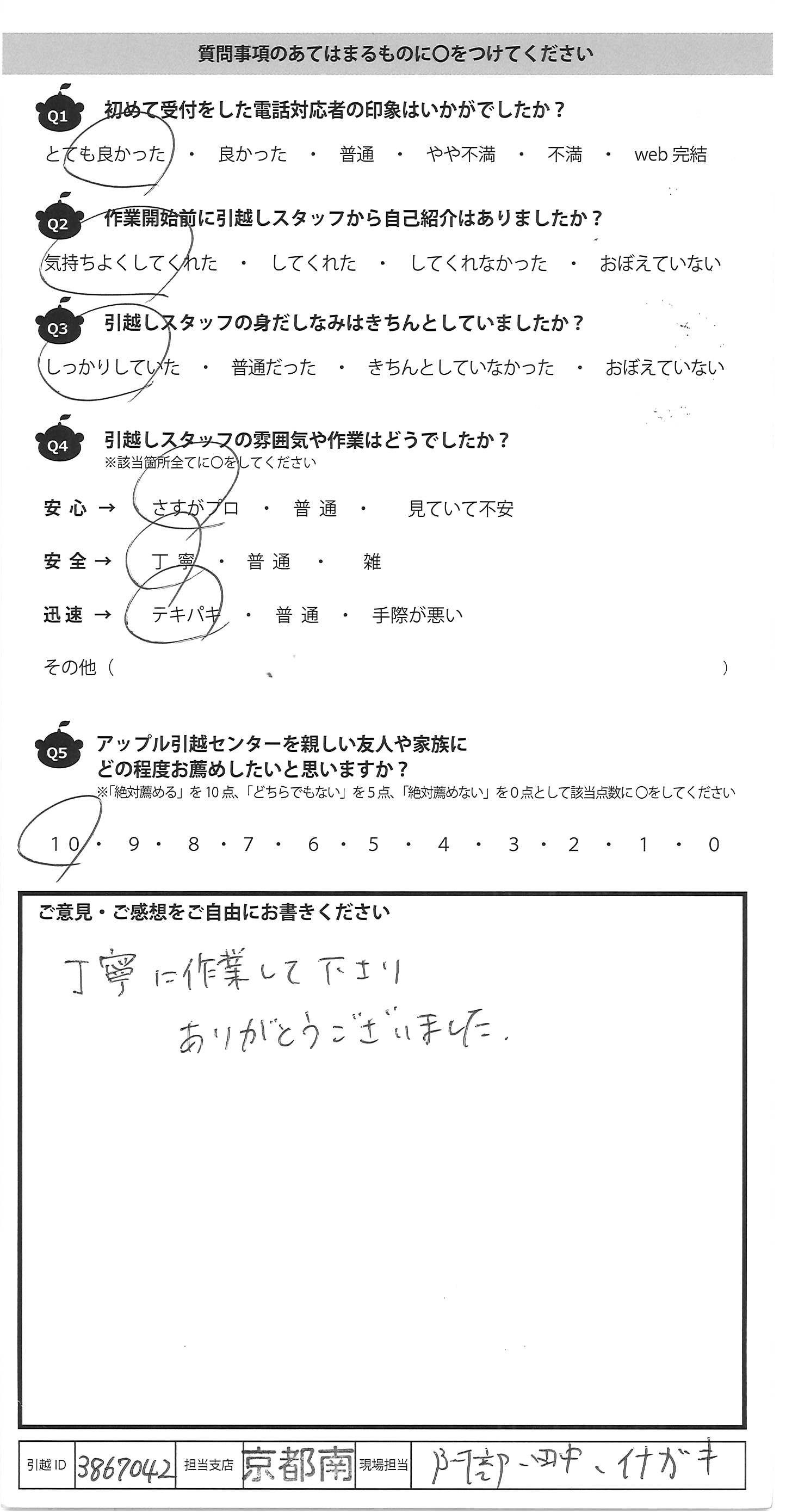 A.・手際がとてもよい ・チーム連携がしっかりとれている 安心してお願いできました。 次回もお願いしたいです。 今回は本当にありがとうございました。