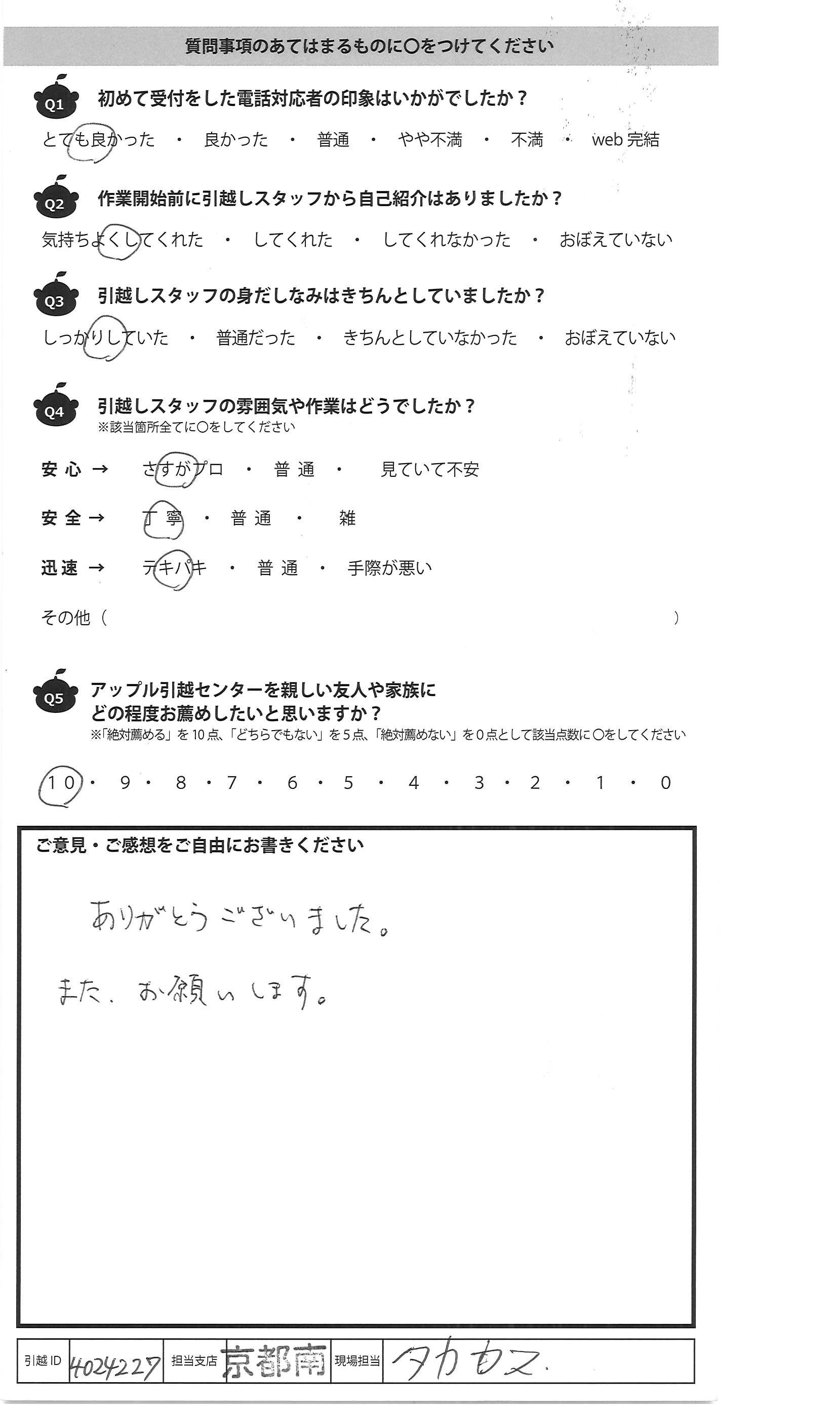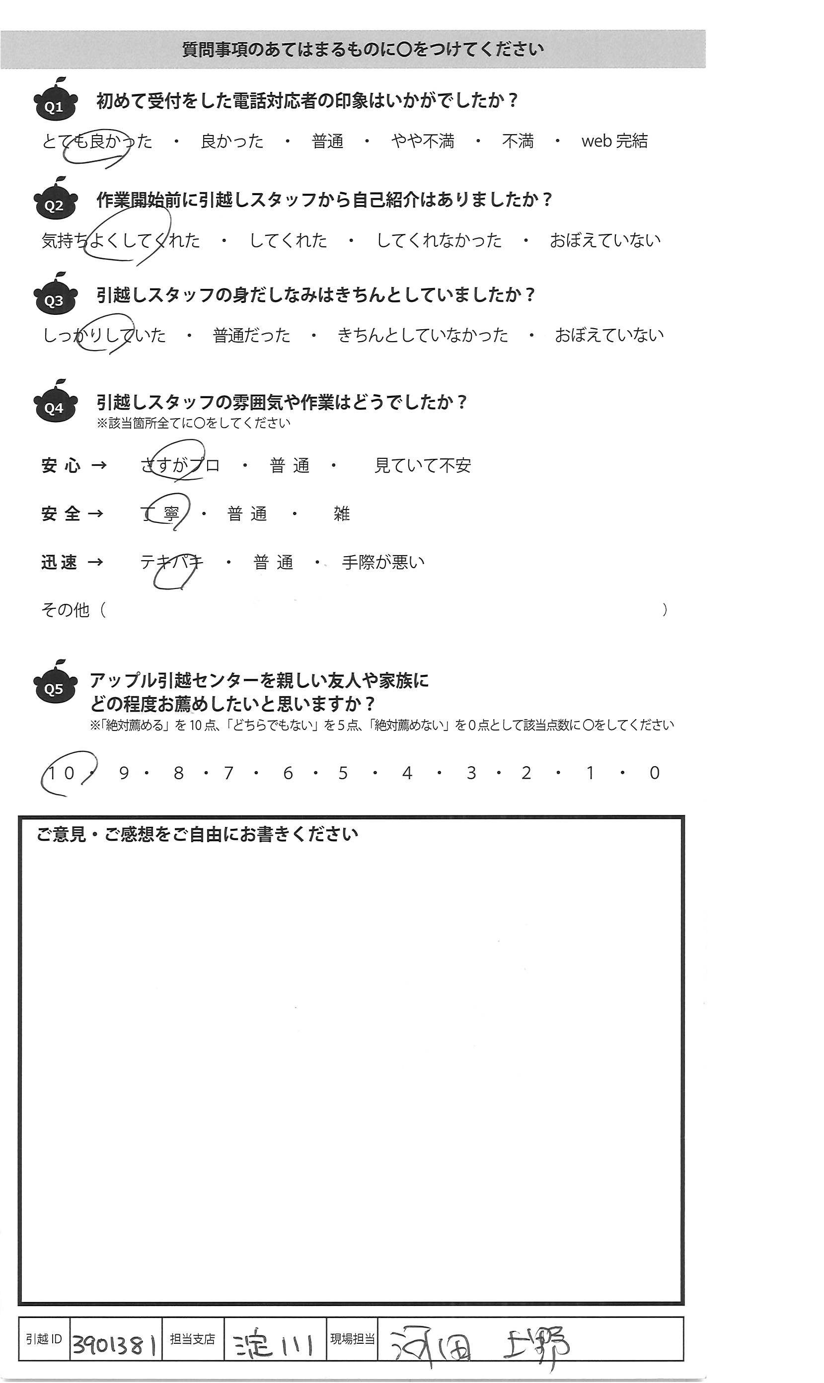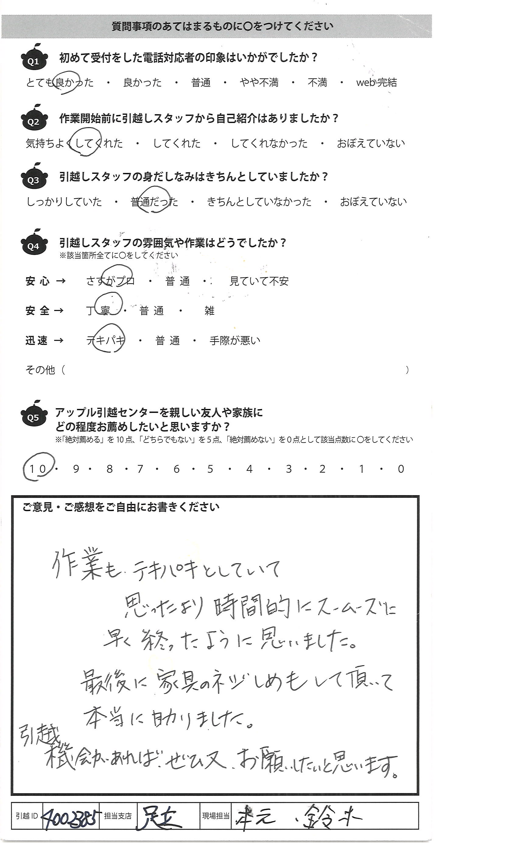 A.作業もテキパキとしていて 思ったより時間的にスムーズに 早く終ったように思いました。 最後に家具のネジしめもして頂いて 本当に助りました。 引越機会があれば、ぜひ又、お願いしたいと思います。