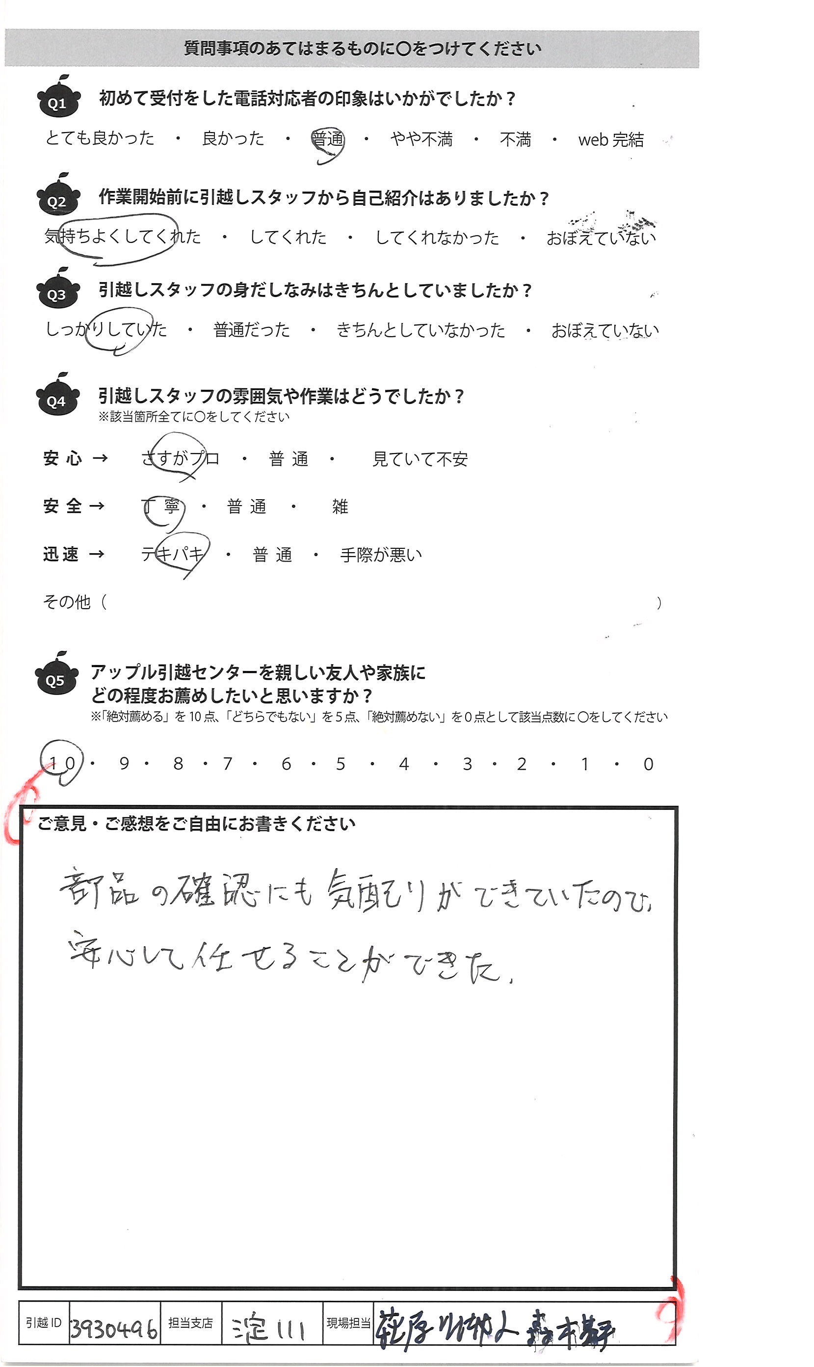 A.部品の確認にも気配りができていたので、 安心して任せることができた。