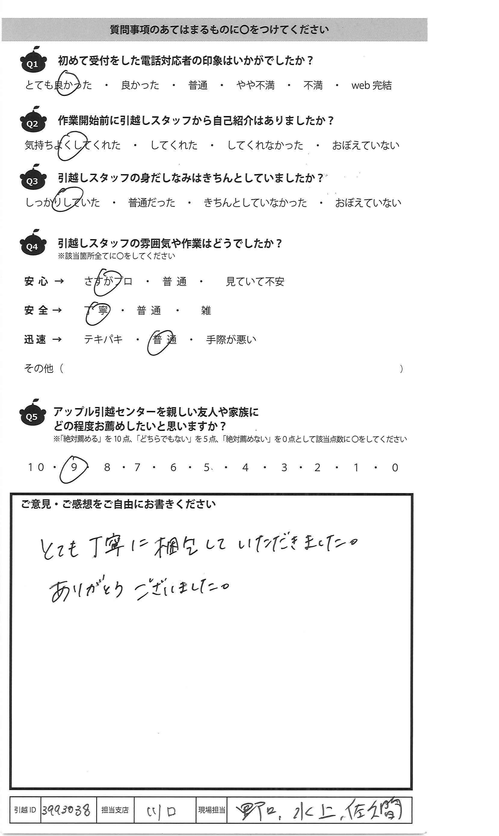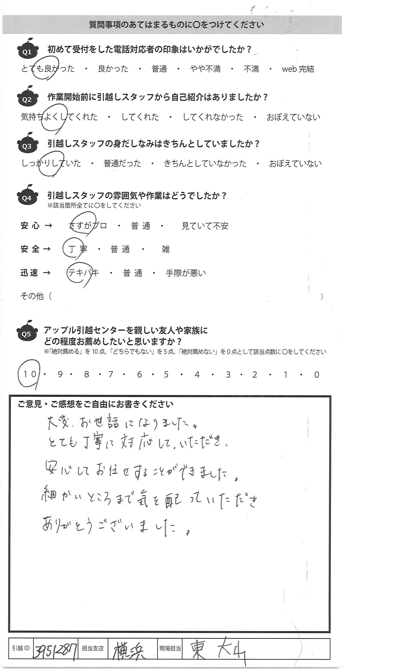 A.大変、お世話になりました。 とても丁寧に対応して、いただき、 安心してお任せすることができました。 細かいところまで気を配っていただき ありがとうございました。