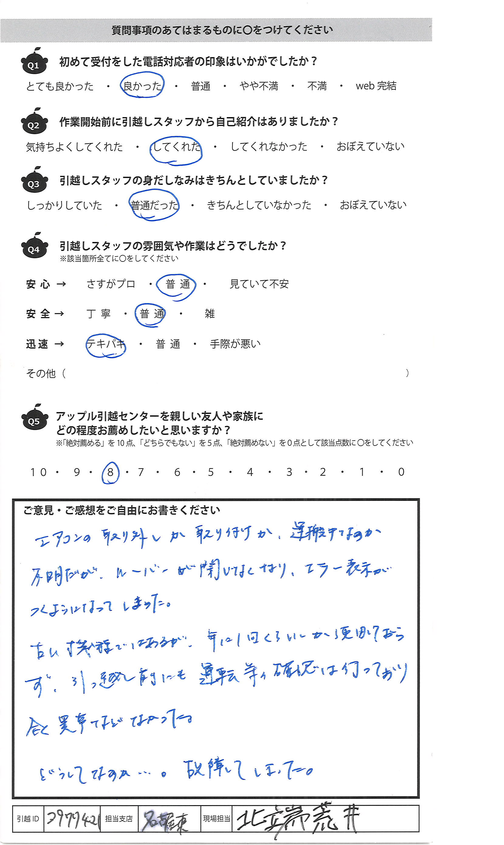 ・この度は、エアコンの不具合につきまして、ご迷惑をおかけし誠に申し訳ございませんでした。 取り外し・取り付け、または運搬の過程において不具合が生じた可能性があり、ご不安なお気持ちにさせてしまいましたこと、深くお詫び申し上げます。 事前には異常がなかったとのこと、大切にご使用されていたお品物に不具合が生じてしまいましたことを重く受け止めております。 本来であれば細心の注意を払い作業を行うべきところ、配慮が行き届いておりませんでした。 頂いたご指摘を真摯に受け止め、作業手順および取り扱いの見直しを徹底してまいります。 この度は貴重なご意見をいただき、誠にありがとうございました。