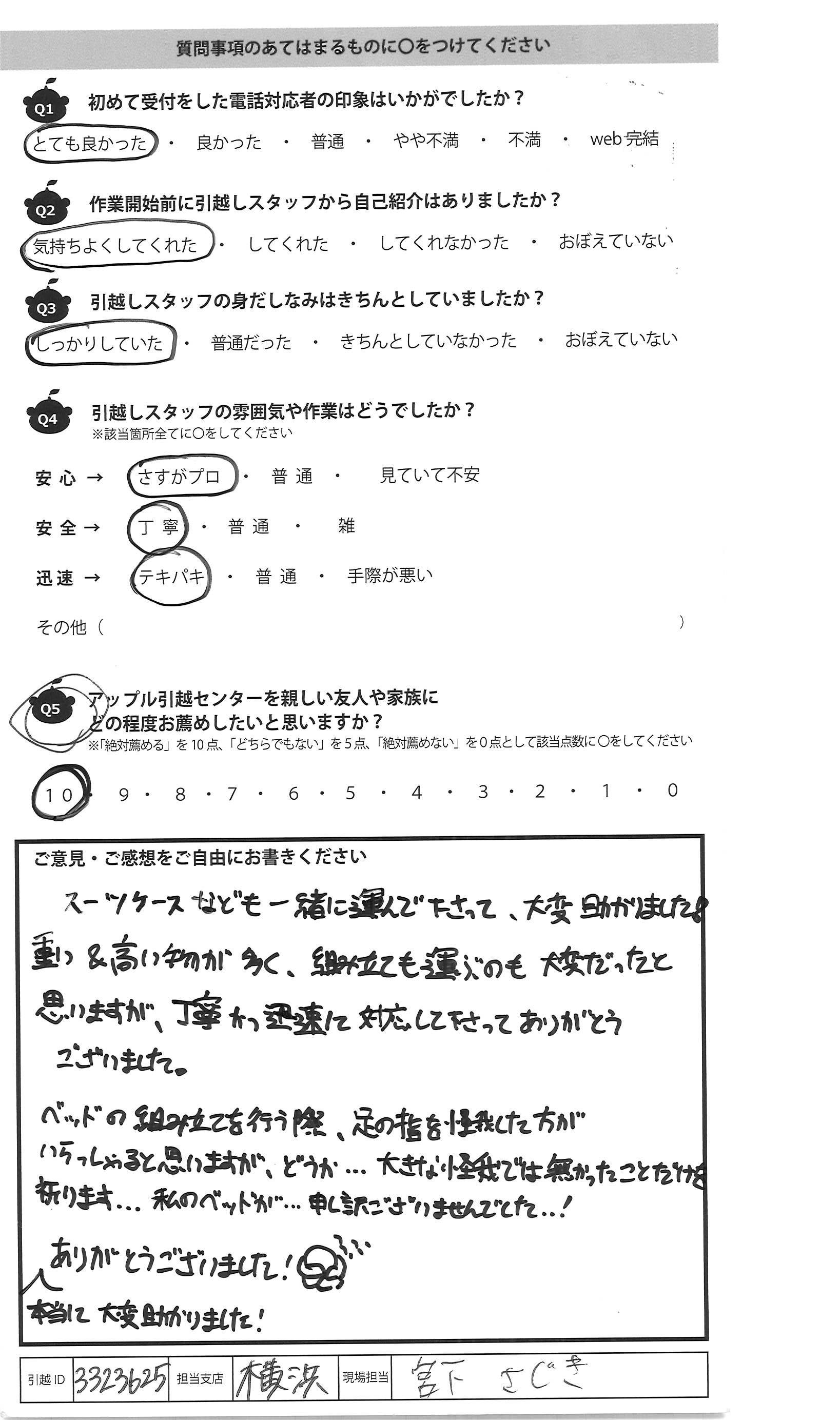 A.スーツケースなども一緒に運んで下さって、大変助かりました! 重い&高い物が多く、組み立ても運ぶのも大変だったと 思いますが、丁寧かつ迅速に対応して下さってありがとう ございました。 ベッドの組み立てを行う際、足の指を怪我した方が いらっしゃると思いますが、どうか…大きな怪我では無かったことだけを 祈ります…私のベッドが…申し訳ございませんでした…! 本当に大変助かりました!ありがとうございました!