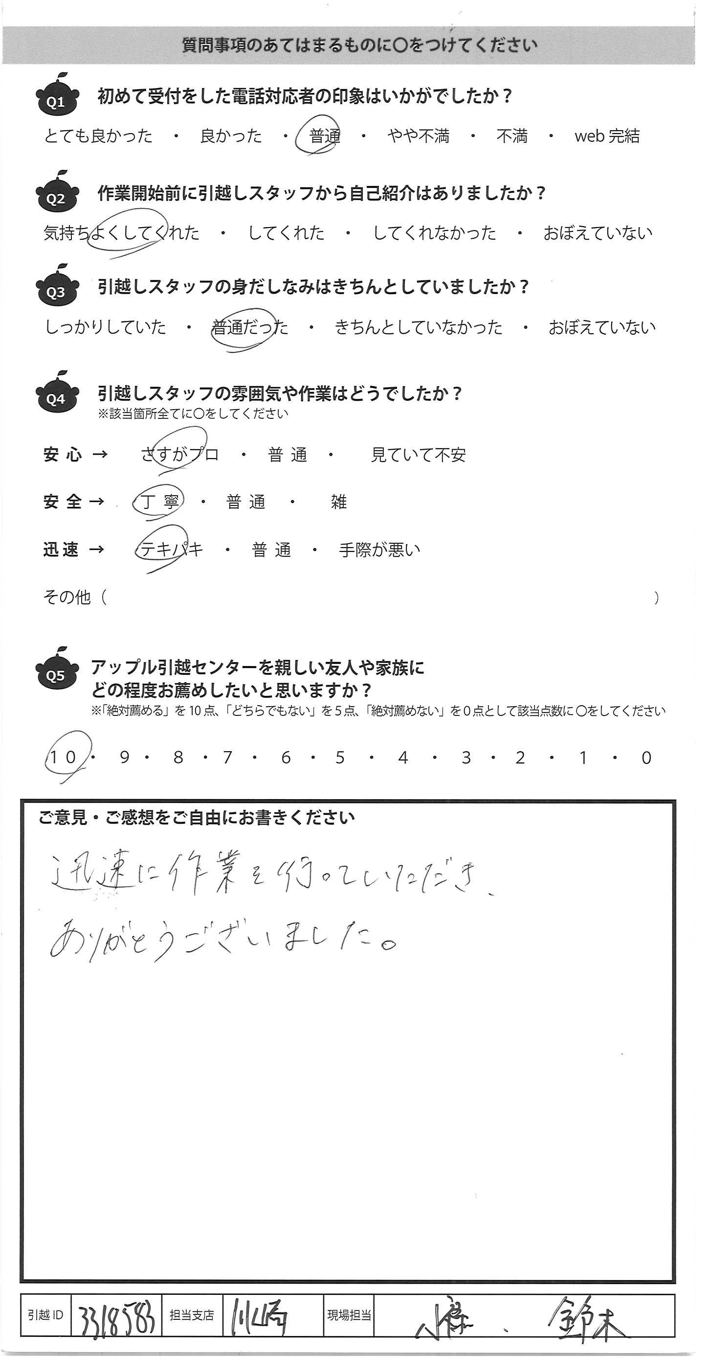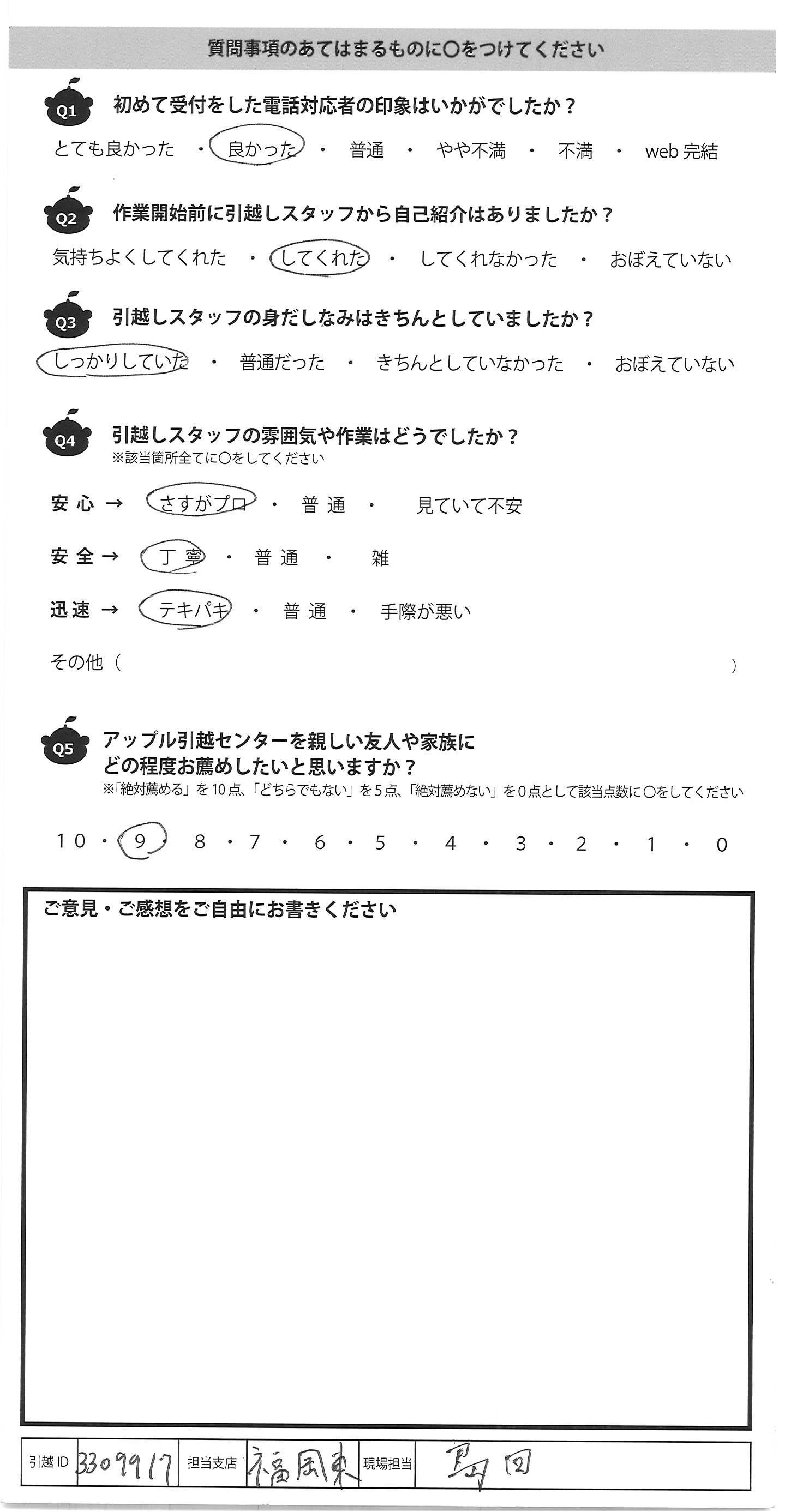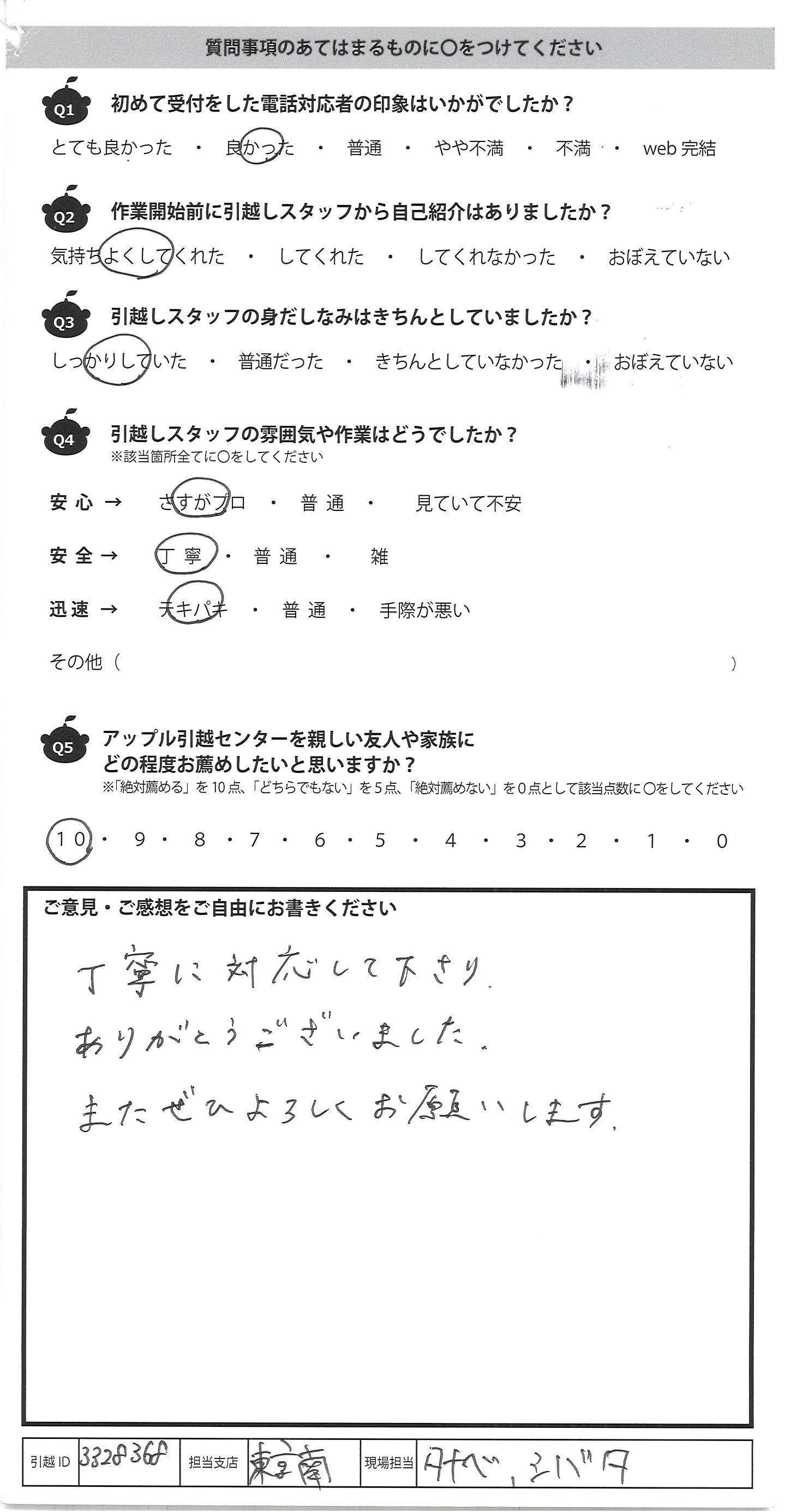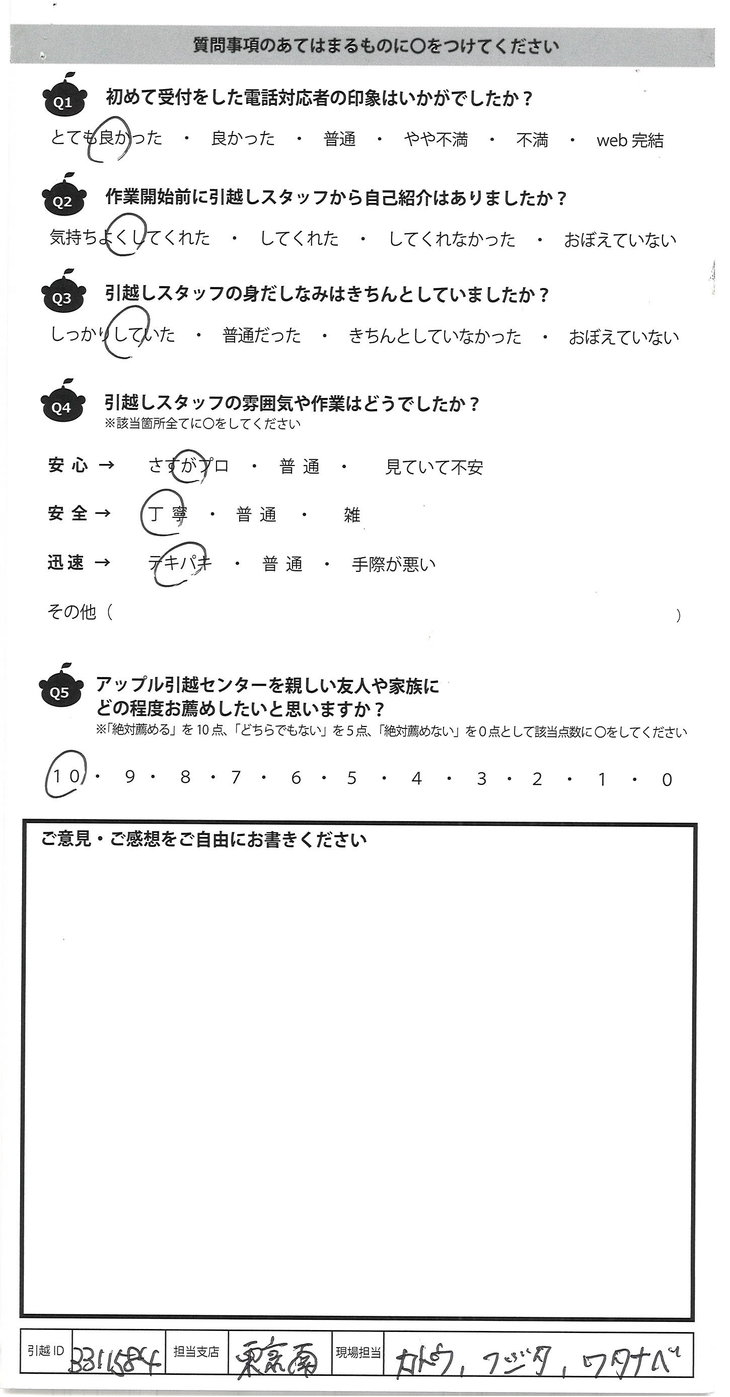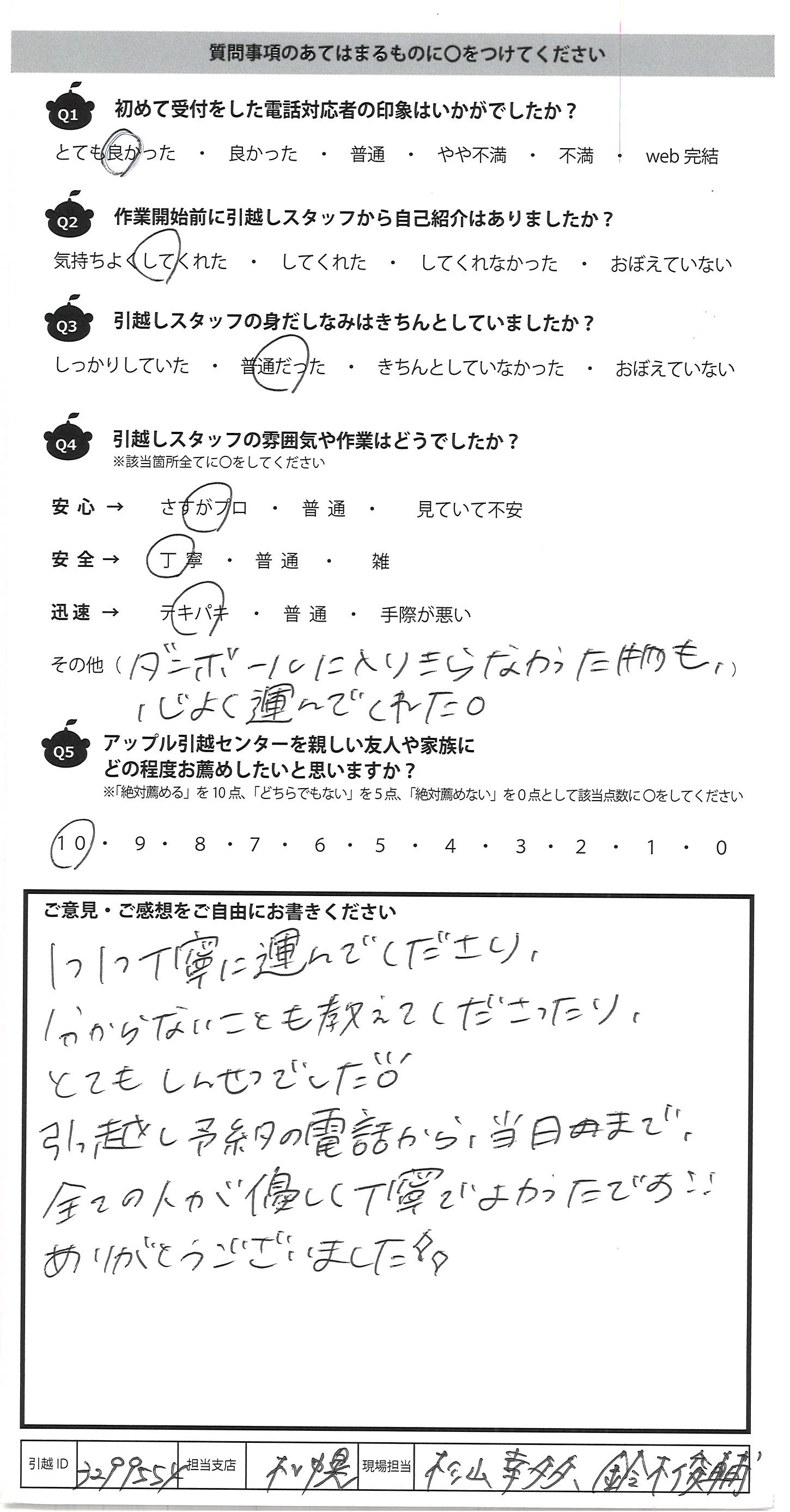 A.この度はどうもありがとうございました。 朝早くからのスタートで、テキパキと荷物をトラックへ 積み、その後長距離のトラックの運転で お疲れであろうが、新居への搬入もテキパキと 作業をしてくださり、さすがだと思いました。 現場を担当して下さった3名様、とても感じがよかったです。 はじめ他社で見積りをしましたが、金額がバカ高く、 見積っただけなのに、いろいろな勧誘電話がいくつも来て 困りましたが、アップルさんはそんな事もなく、引越しのギモンにも ていねいに答えて下さり、要望もきいて下さり助かりました。