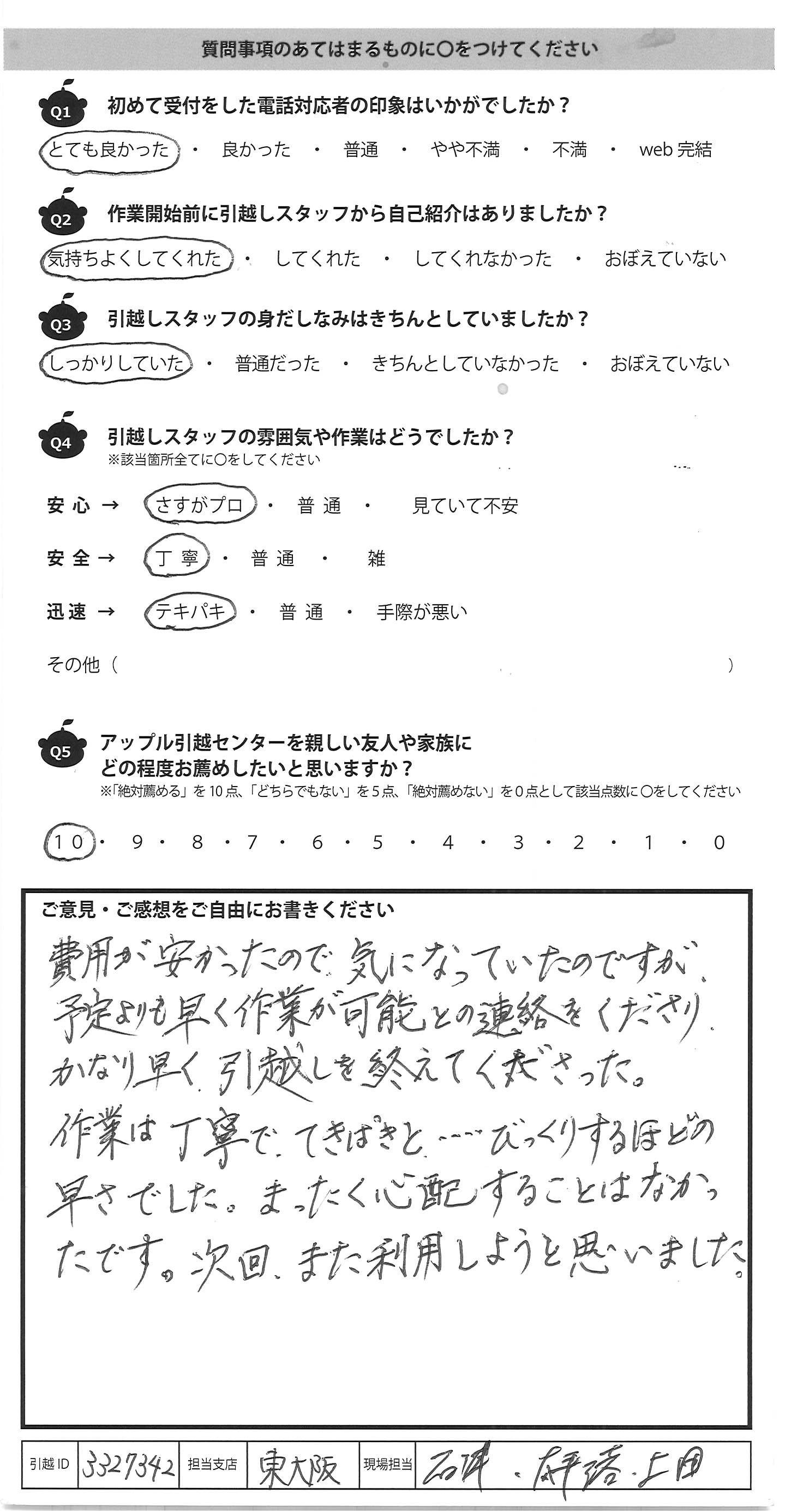 A.費用が安かったので気になっていたのですが、 予定よりも早く作業が可能との連絡をくださり、 かなり早く、引越しを終えてくださった。 作業は丁寧で、てきぱきと…びっくりするほどの 早さでした。まったく心配することはなかっ たです。次回、また利用しようと思いました。