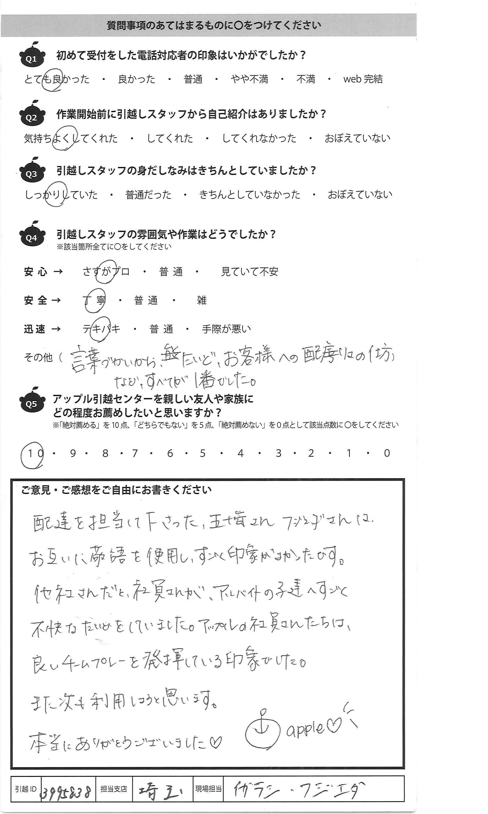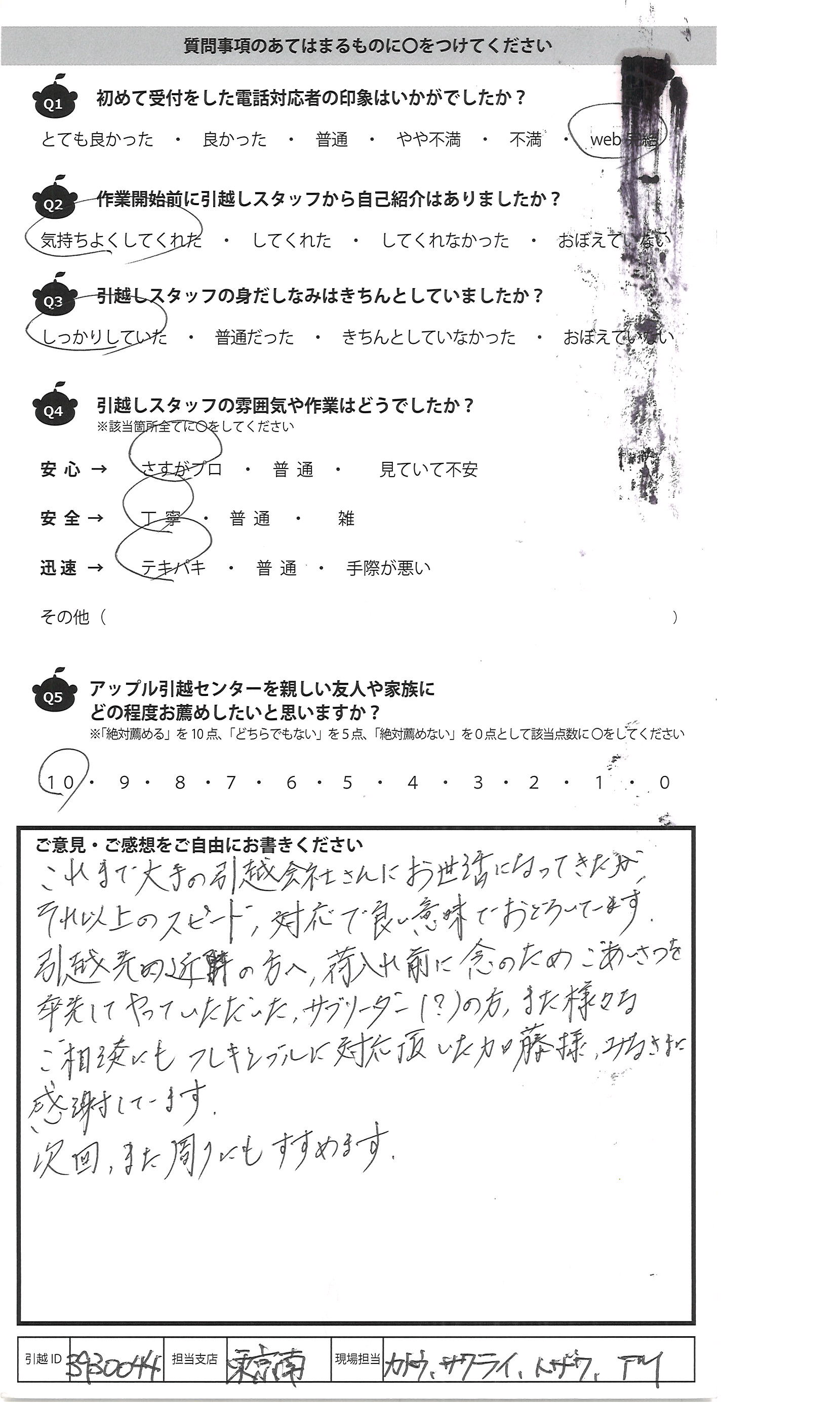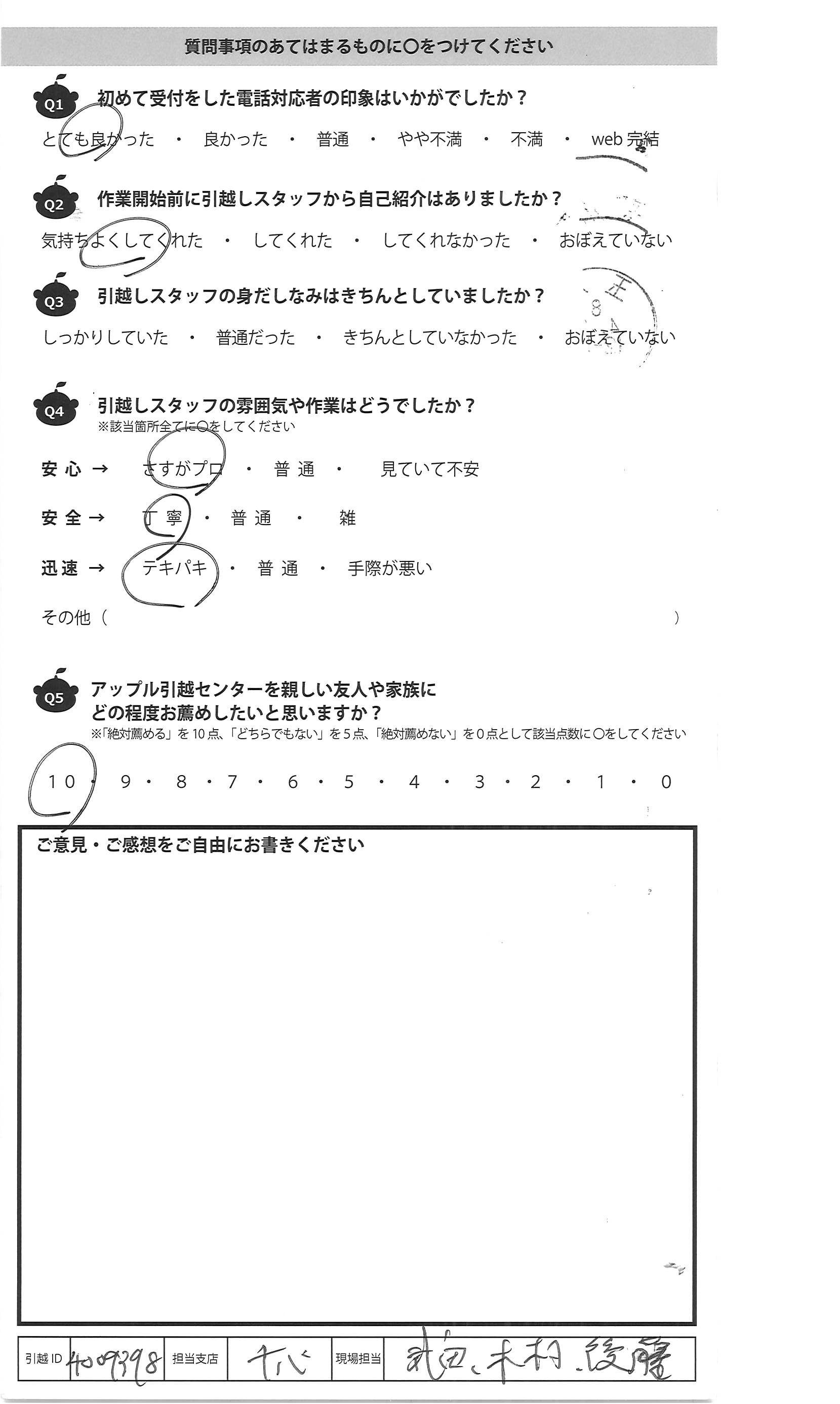 アップル引越センターでは、面映いお褒めの言葉も、胸に突き刺さるお叱りのコメントも、