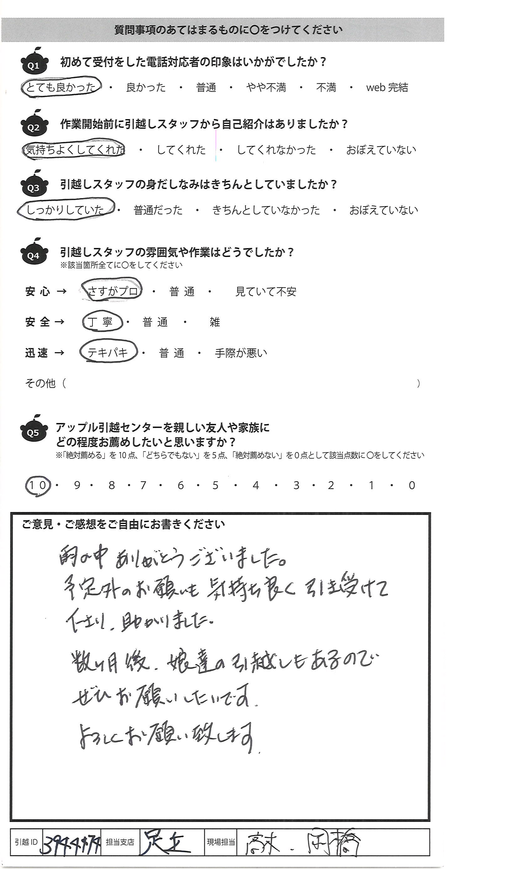 A.3月末の引っ越しで、行き先が決まったのが遅かったため、業者さんが見つからず困っていたところ、快くお引き受けいただきありがとうございました。 また何年か後に転勤になることがあるので、その時もまた、ぜひお願いしたいです。