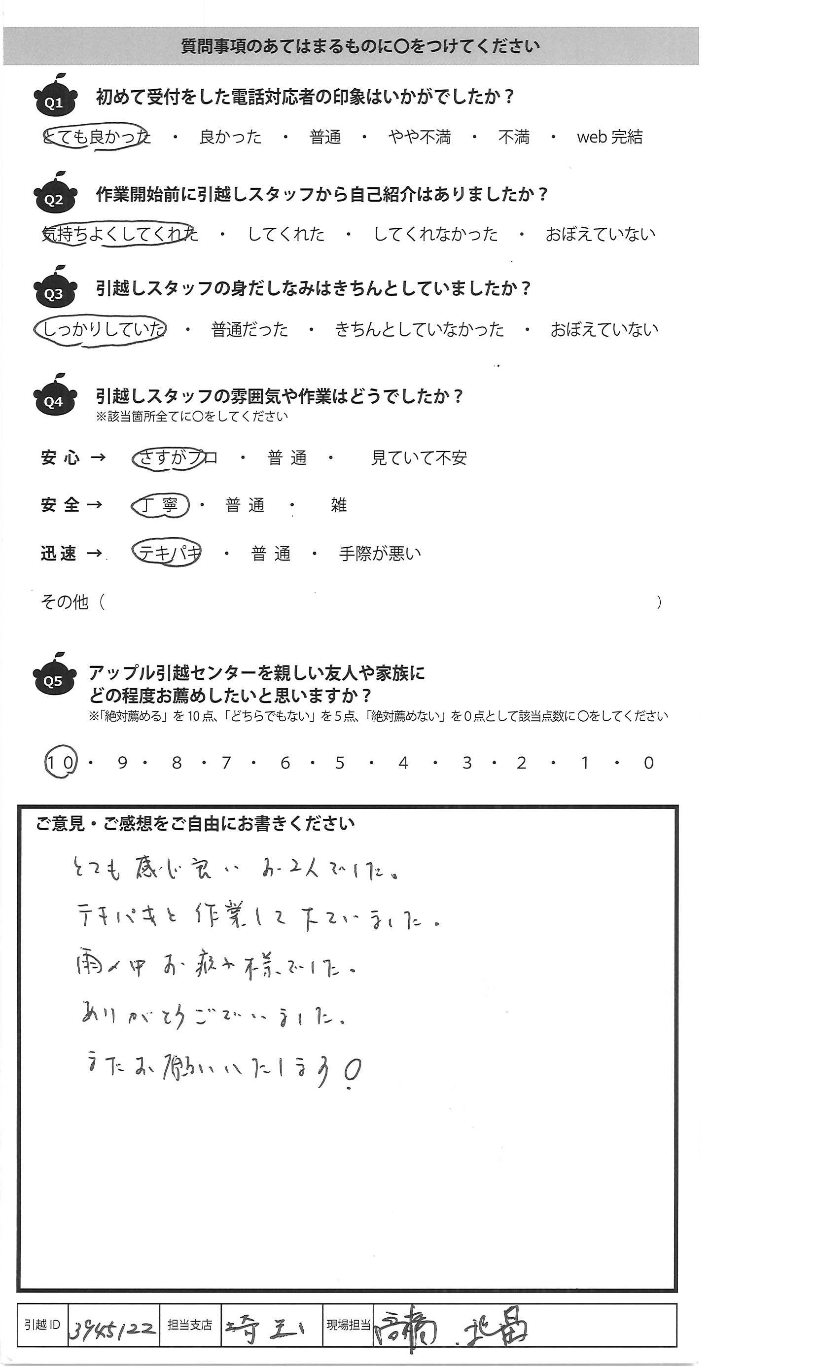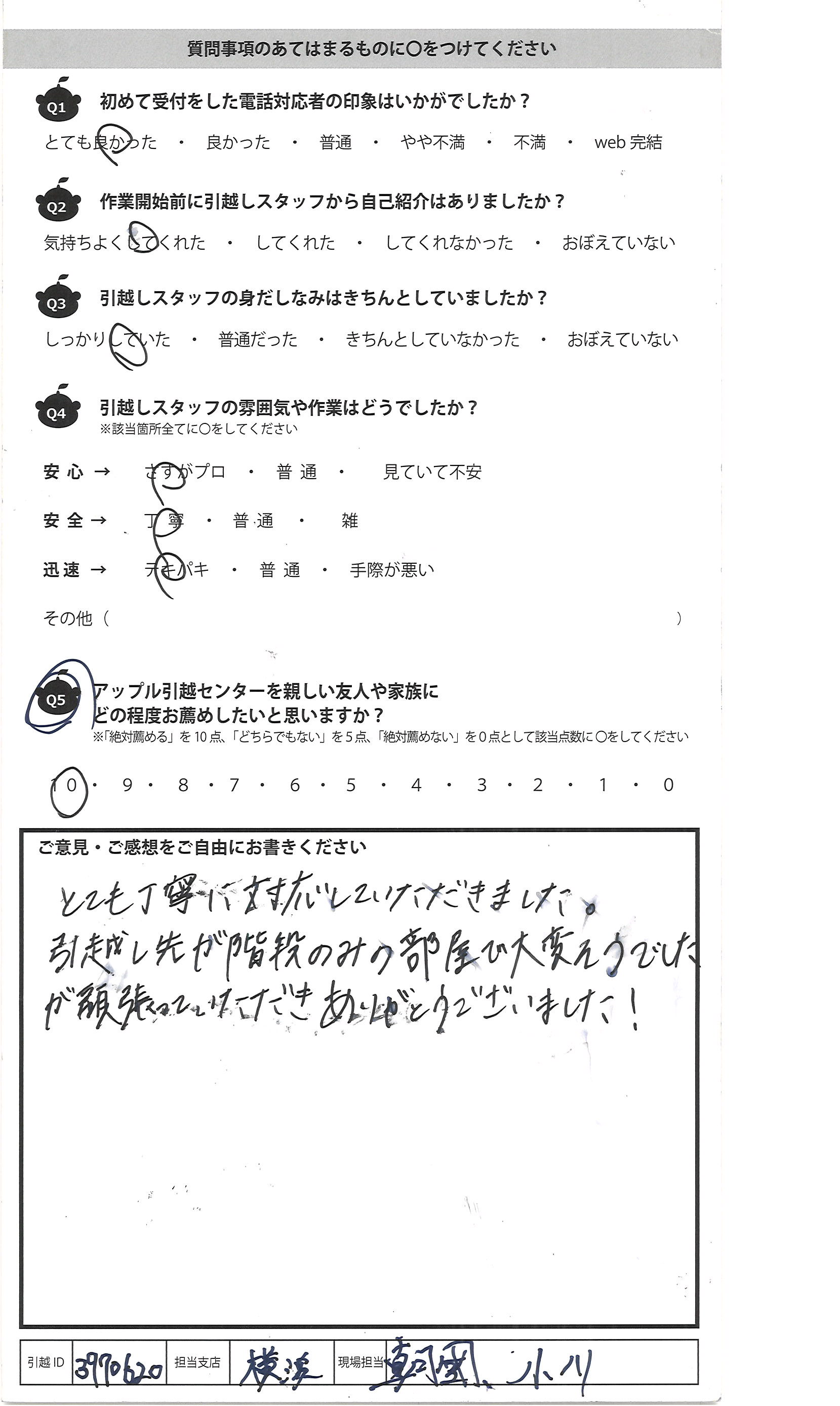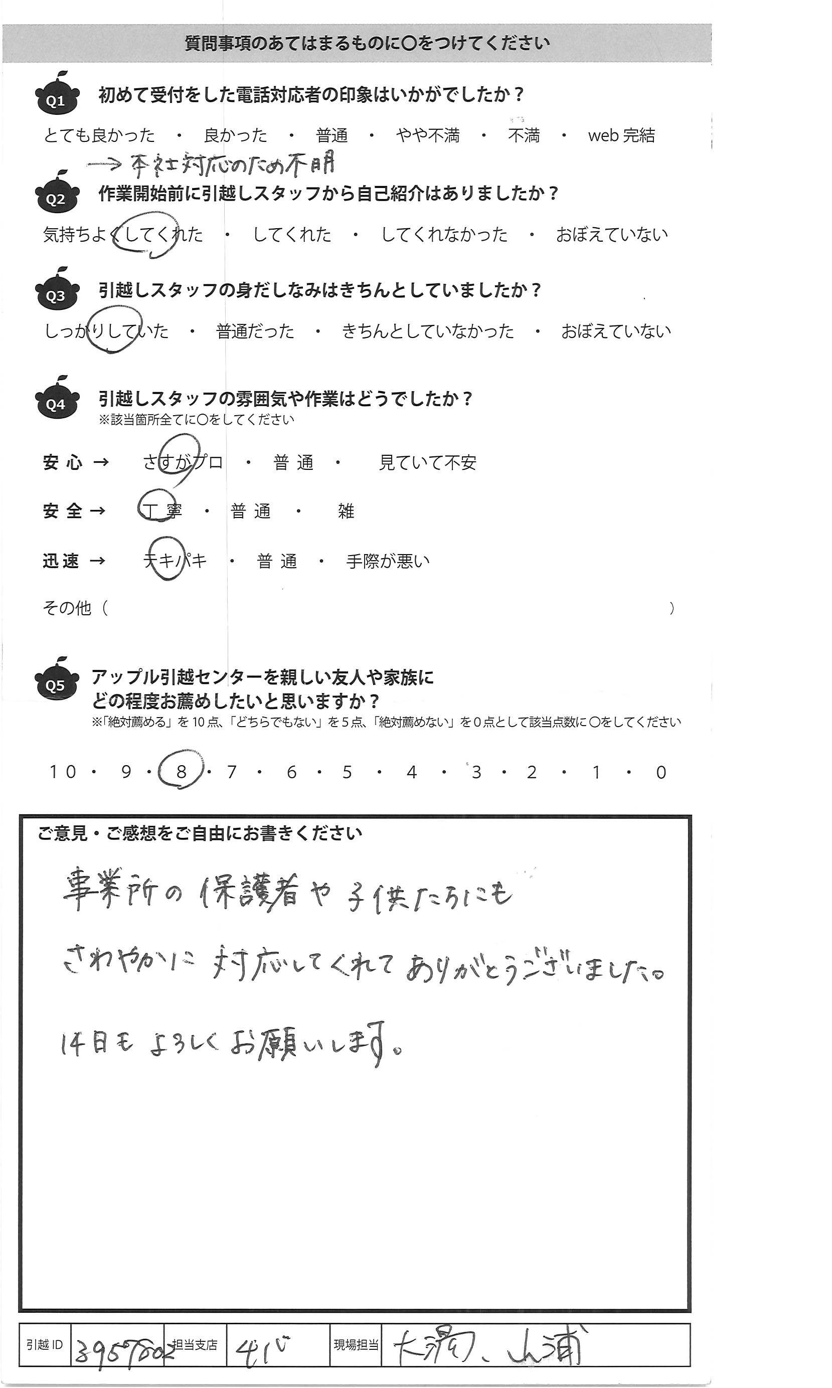 A.この度は私共の引越しを全面サポートいただき ましてどうもありがとうございました。とても ご親切にご丁寧に迅速に運んでいただき、 心から感謝申し上げます。前田様はじめ 山田様、山本様には大変お世話になり ましたことあらためて御礼申し上げます。 すてきな引越しになりました。ありがとう ございました!!次回もお願いしたいです。